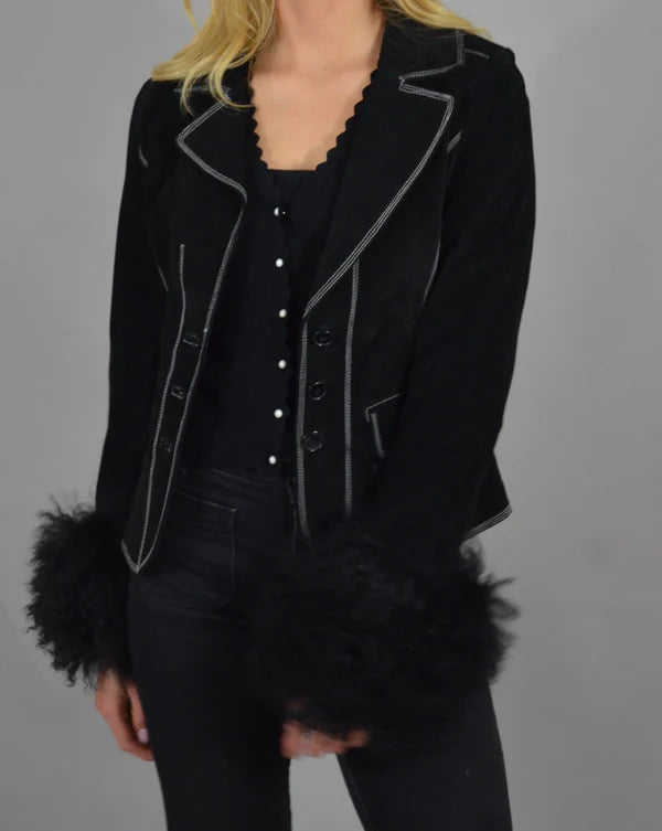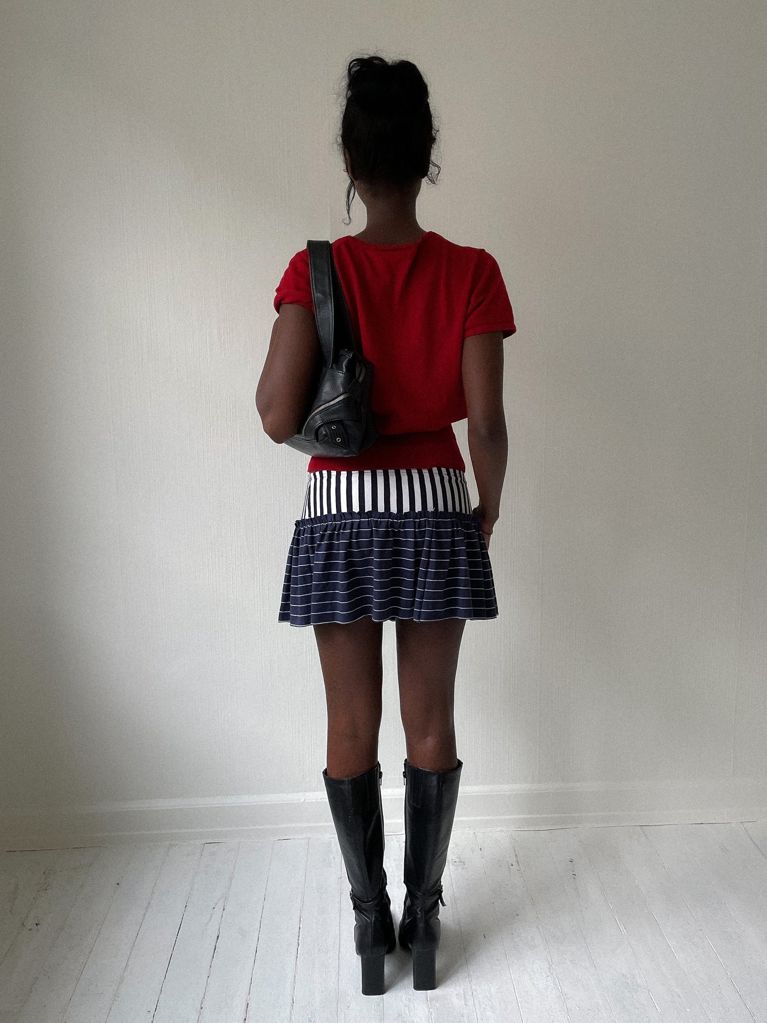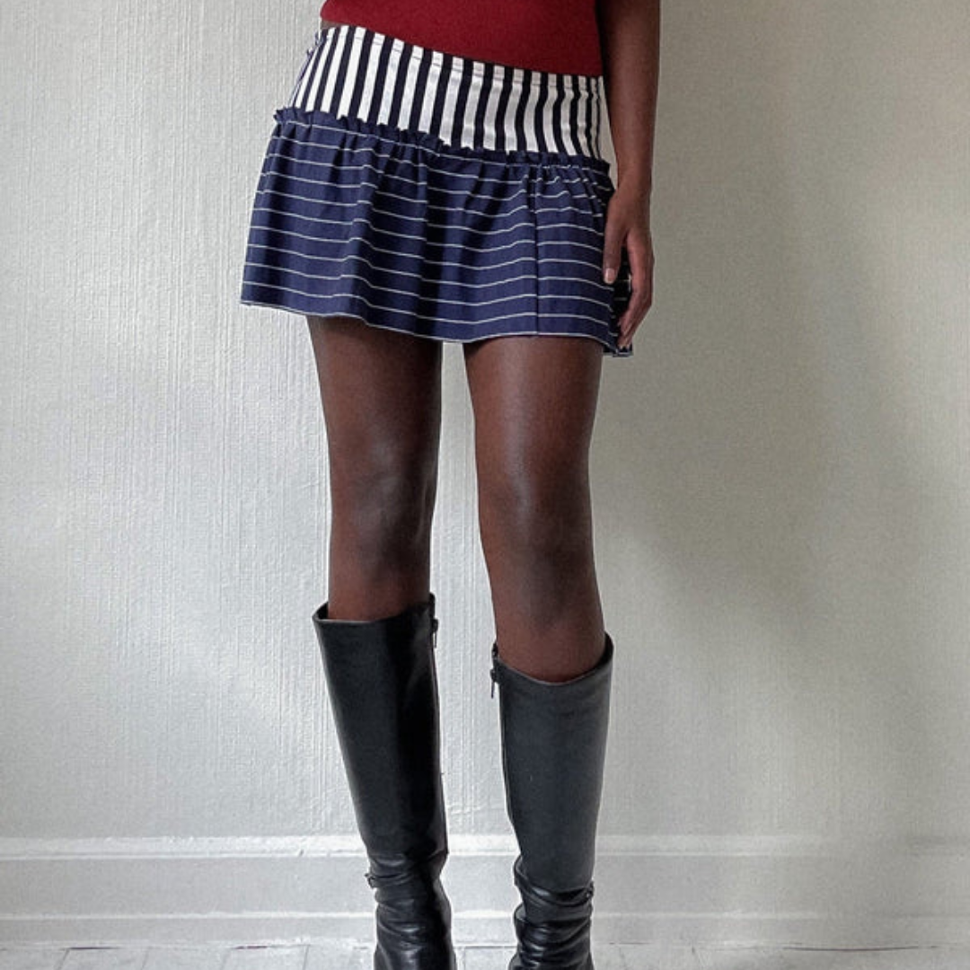 Who doesn't want to come back to school the first day in new, unique and stunning clothing? We sure do! FrejaKnits' mini skirt in blue/white and Natalie Navia's blazer in black/white are the perfect combo for those early fall days.