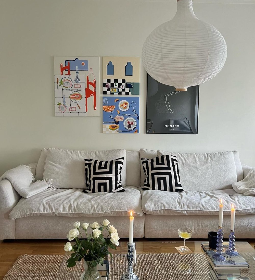 In the early 20th-century apartment, which was once a bustling shop, Moa's studio is located just one stair down. She shares the space with her partner. While in the studio, they rarely speak, both focused on their hobby. “The studio, which used to be the pantry, unfortunately lacks inspiration,” she says. Sometimes she goes upstairs to the big windows in the bedroom, finding a moment of peace, watching the wind grab the trees, before returning to her studio to continue her piece of art.