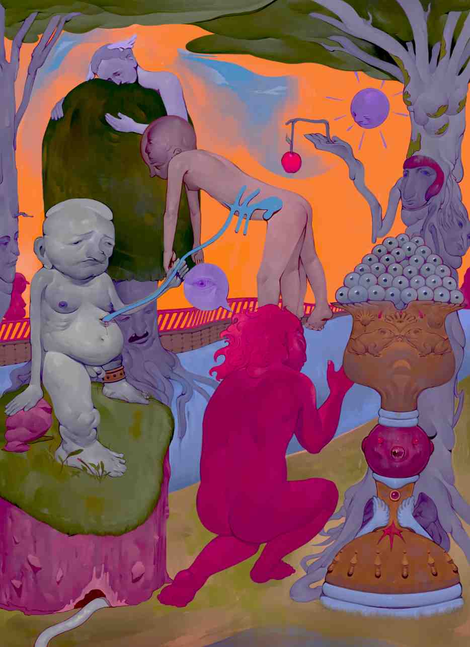 right on the border between play and seriousness. With inspiration taken from classical oil painting and contemporary popular cultural influences such as cartoons, horror films and comic books, Adam creates character driven allegories that move between the realms of fantasy and reality.