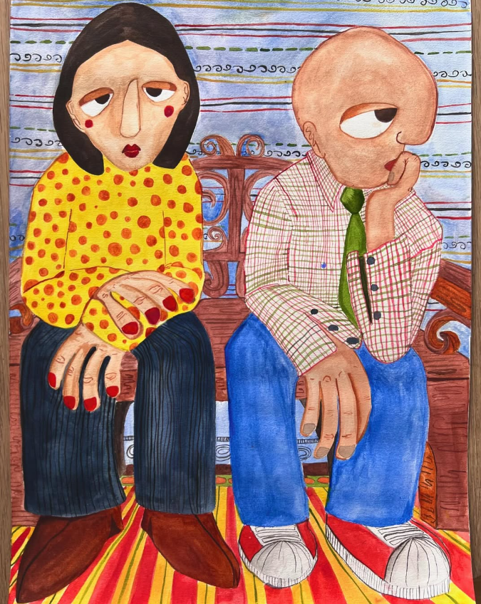 Everything I create starts on paper, which then either evolves into a painting or remains as an illustration. Alternatively, it’s transferred to the computer, where I experiment with different color combinations and compositions. When I paint, I switch between watercolor, acrylic, or oil, depending entirely on what feels fun in the moment—just like the rest of the process. The final result isn’t the most important takeaway from my art; instead, it’s the process and the journey of going from a blank sheet to something filled with color. Whether it ends up as a dot, a collage, abstract forms, or figurative shapes, it’s not something I can take responsibility for—it happens in the moment of creation.