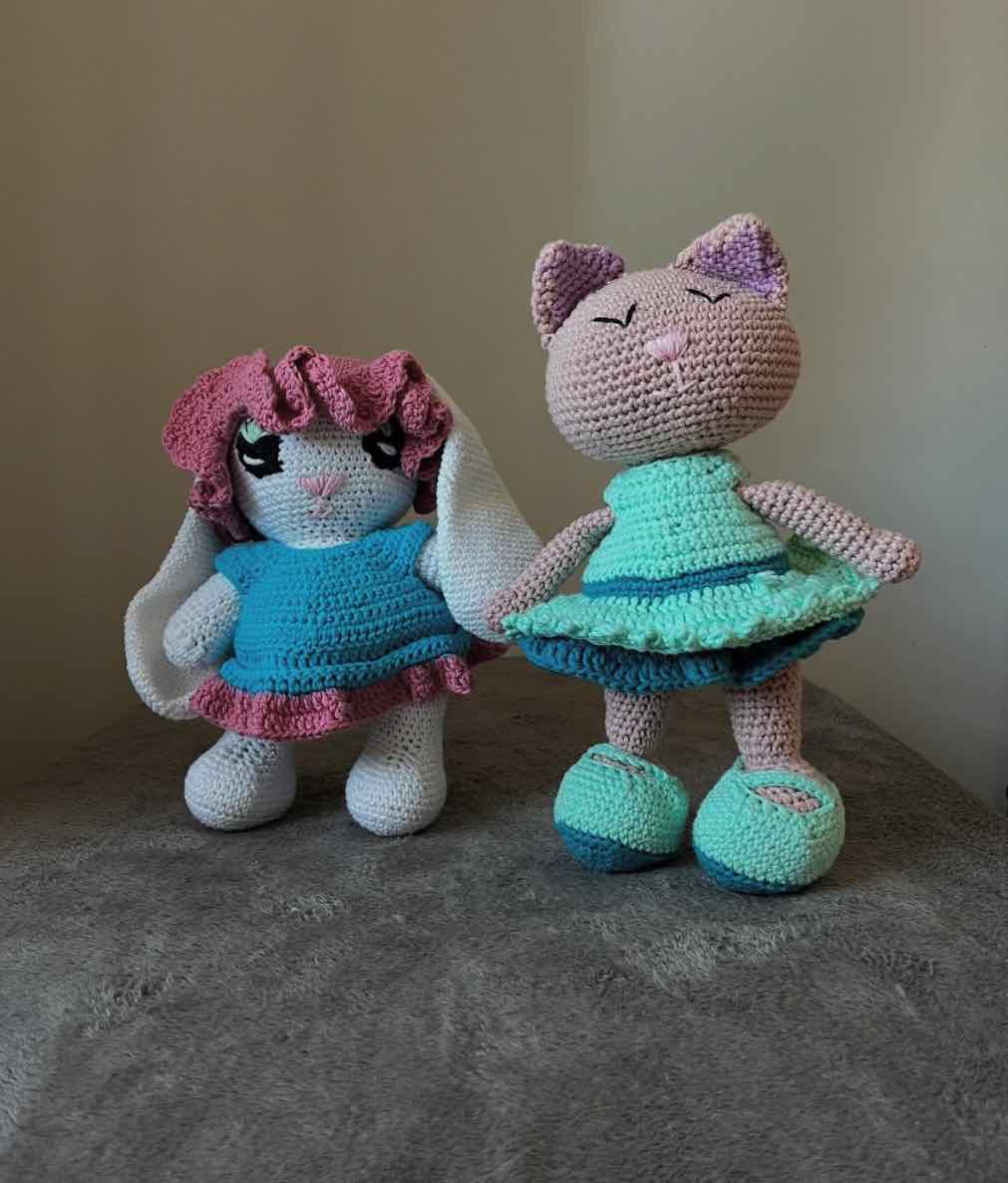 I create handmade crochet animals filled with personality, softness, and charm. Each piece is carefully crafted with high-quality yarn, giving every bunny, cat, and cow a unique expression and character. My style mixes cute details with a cozy, handmade feel — from ruffled dresses and pastel colors to big embroidered eyes and soft plush textures. Every item is made with love and attention to detail, making them perfect as gifts, décor, or a comforting companion. These pieces are designed to be both durable and adorable, bringing warmth and a touch of whimsy to any home.