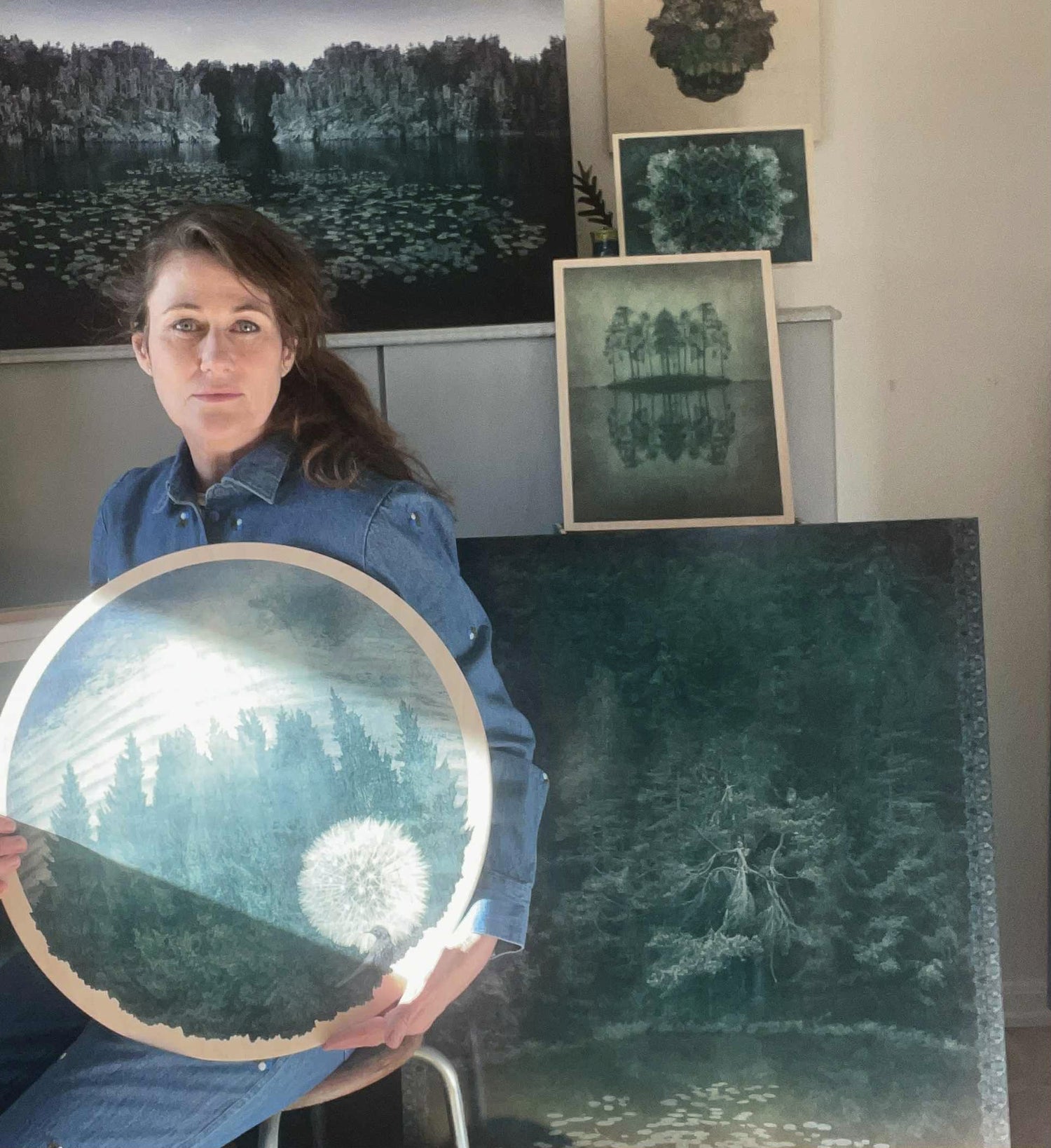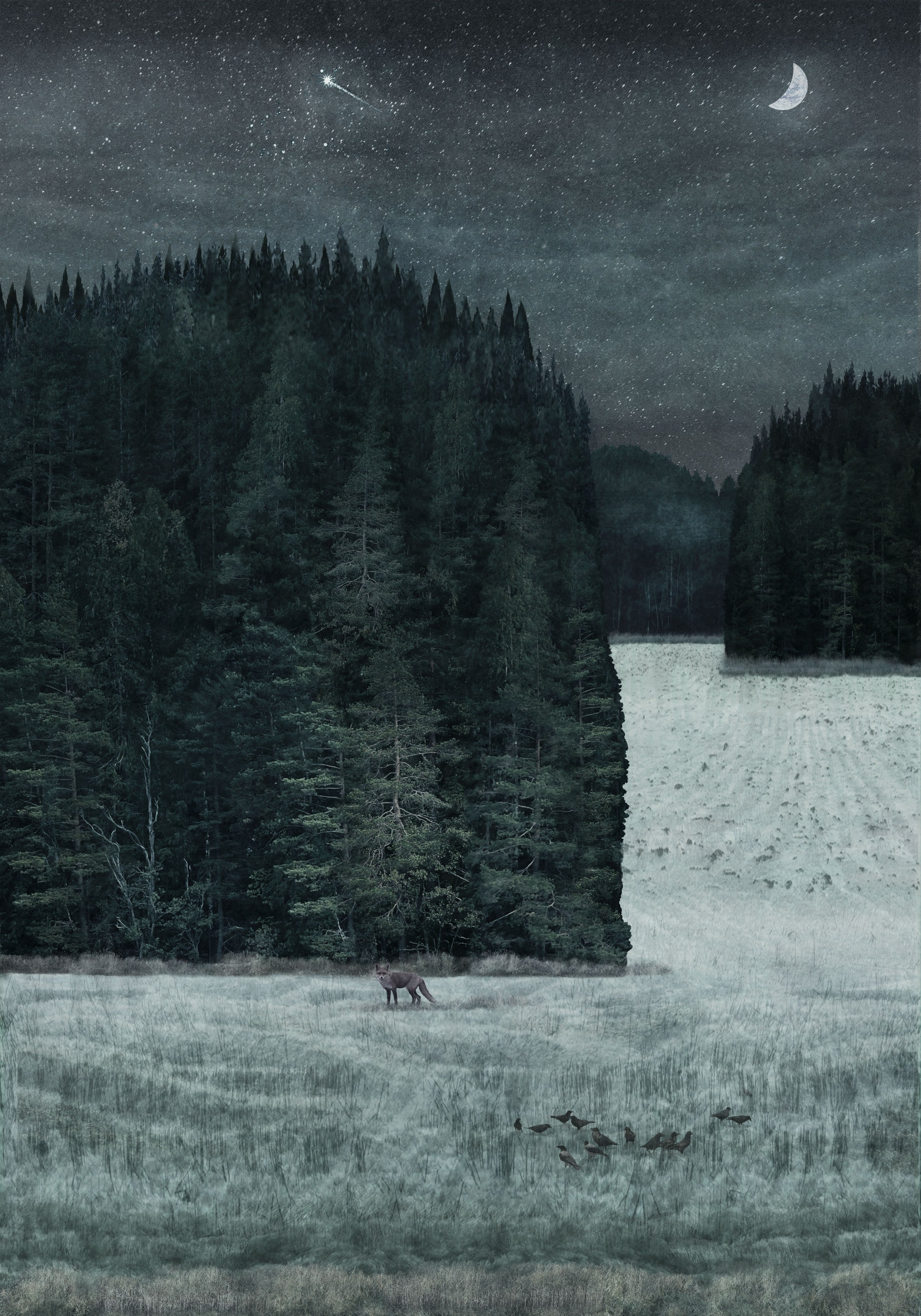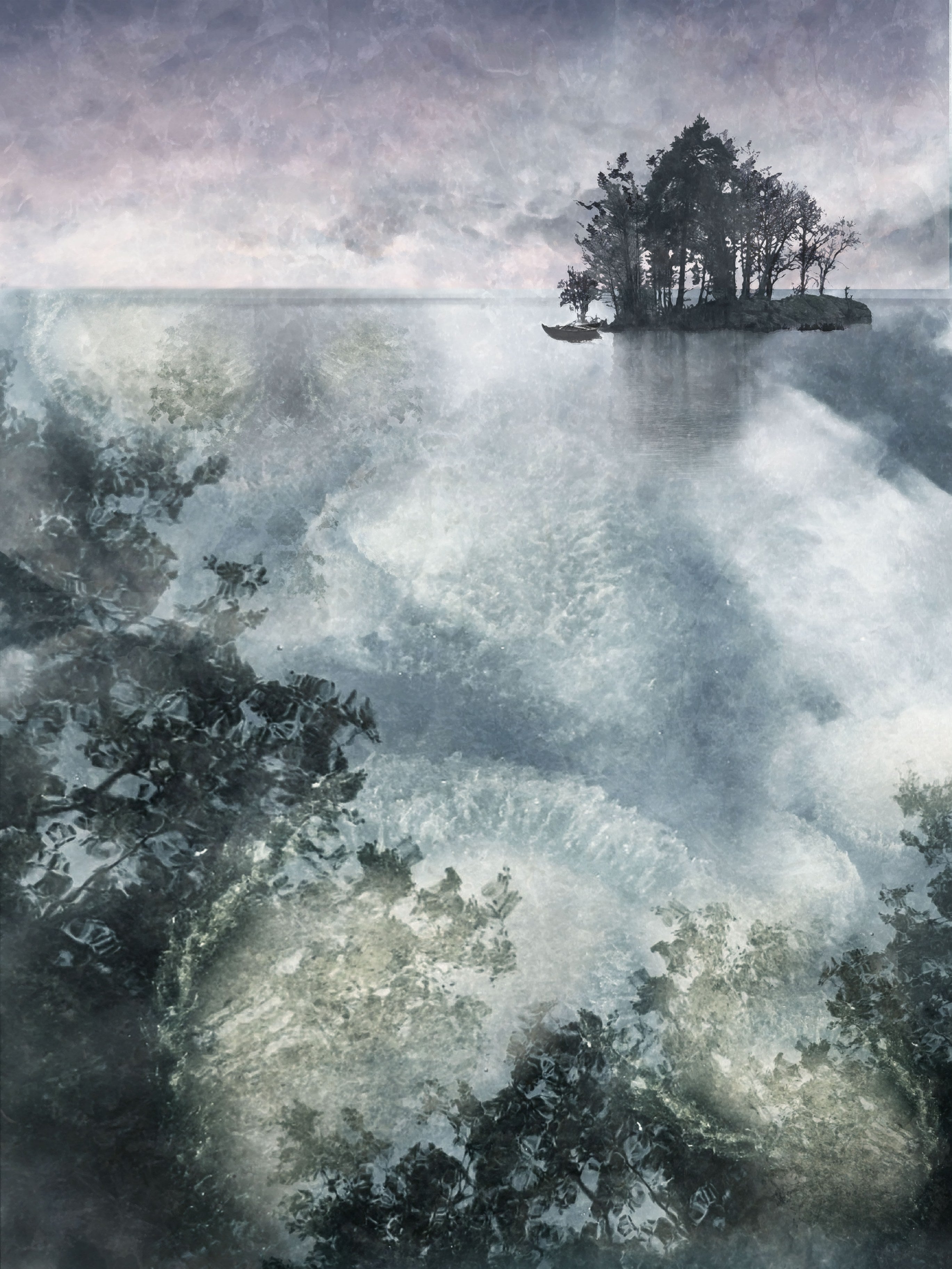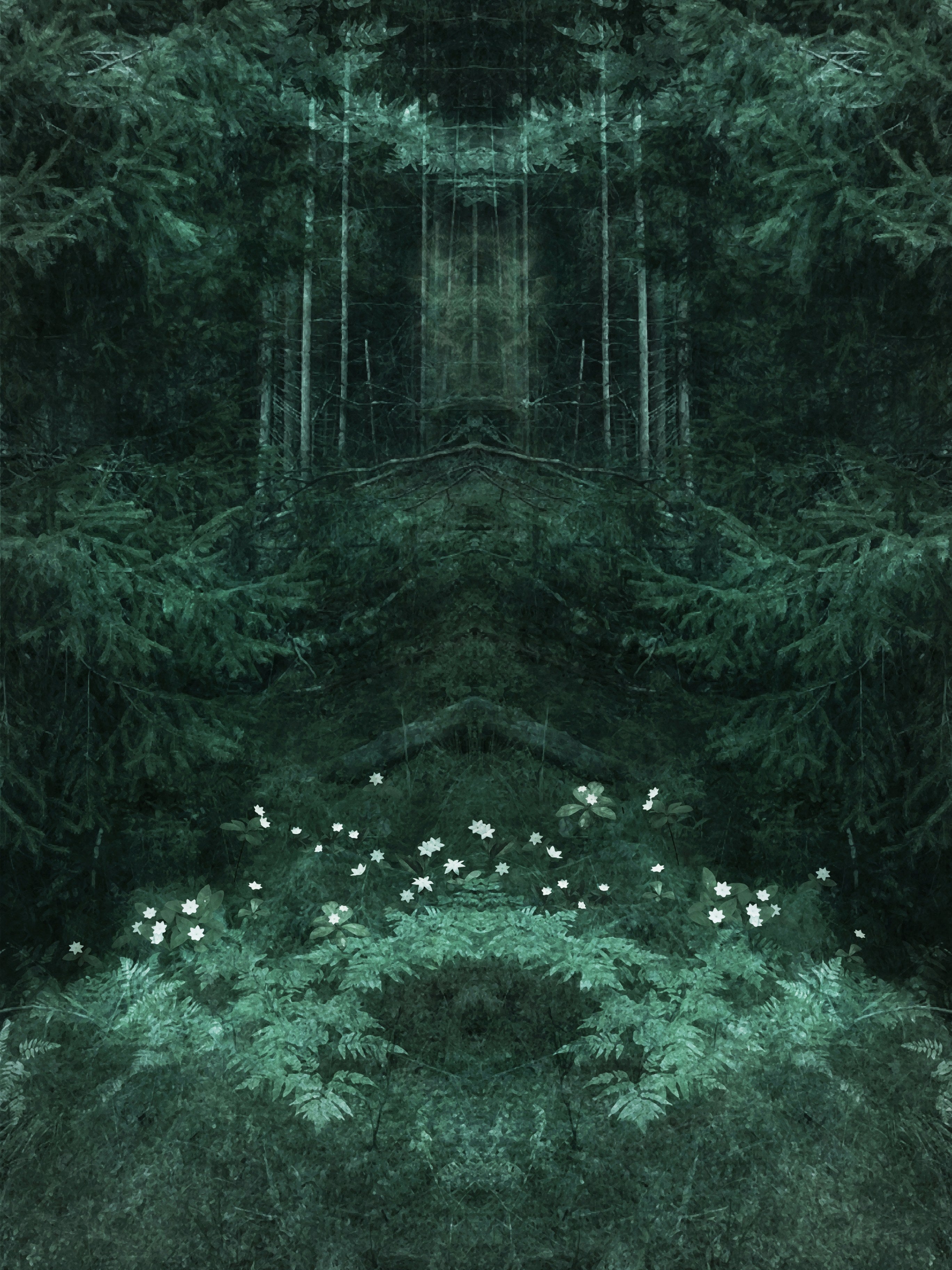 Transparent layers of texture—moss, stone, and earth—are added on top of the image. Through this process, the works slowly weave themselves into a unique atmosphere, like a story quietly lurking in the woods. Each piece is a collage of photographs, digitally processed and then printed on paper, wood, or glass.
