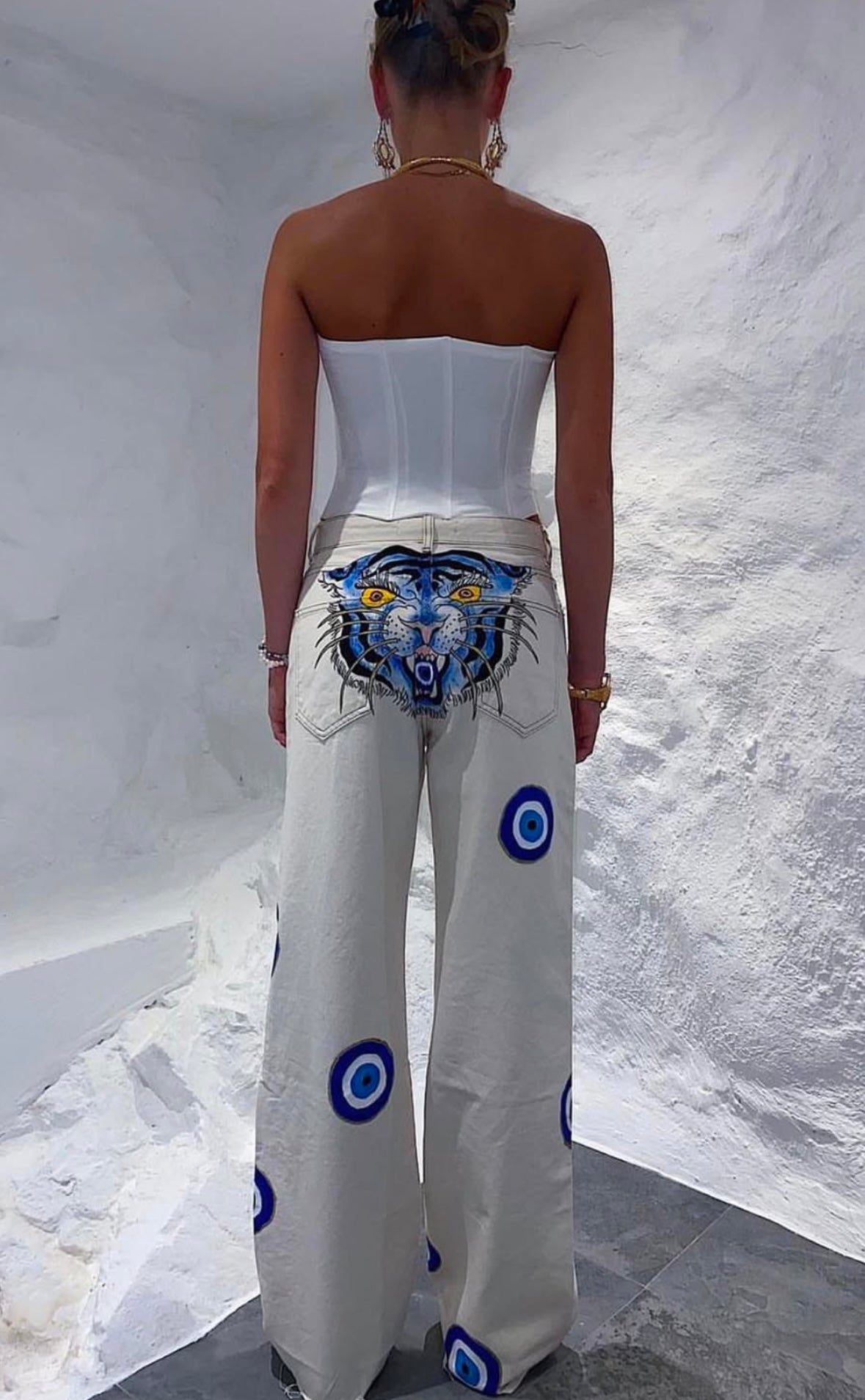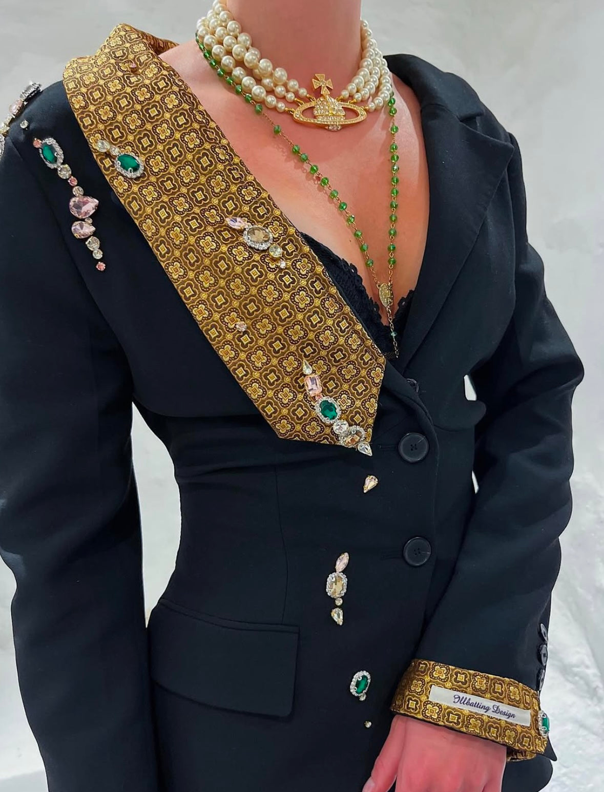 All garments are decorated by hand by sewing or painting, which is why each garment is completely unique. In addition, I use as much second-hand material as possible, modern fashion can more than happily come to life through old fabrics!