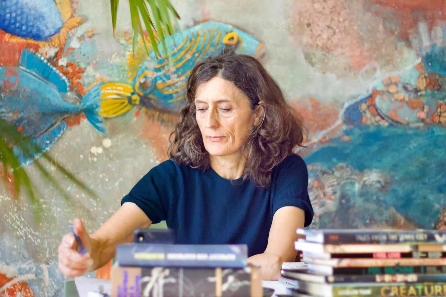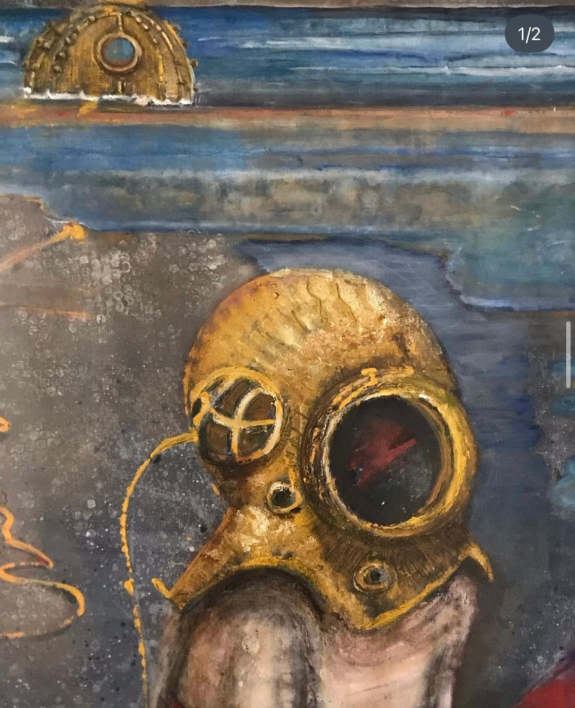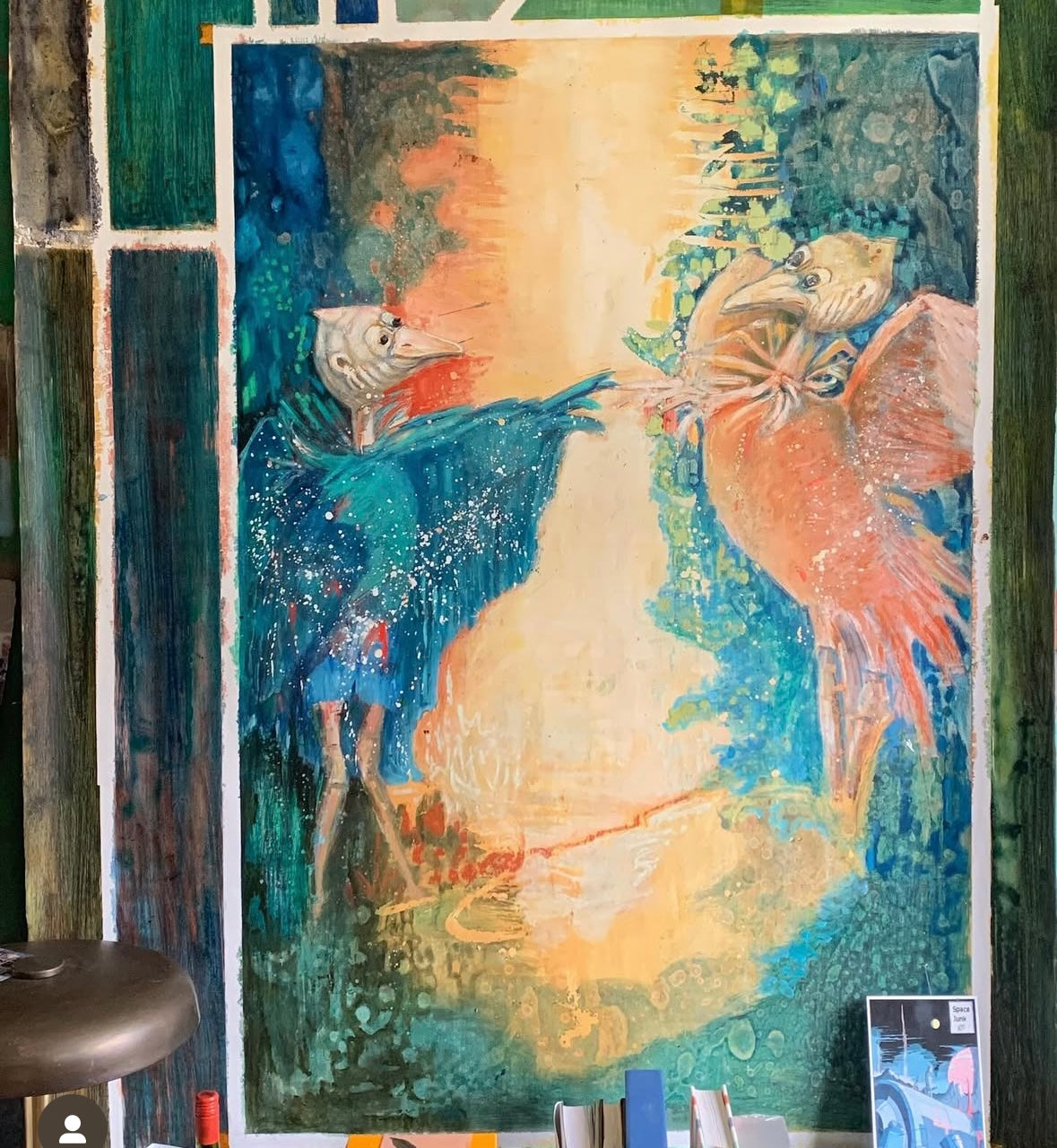 Ingrid Rooms Khan is a self-taught painter from Belgium, now living in Sweden, who started painting to transform her home. She creates mostly wall-sized pieces, some as large as 7 meters, that combine dark themes with playful, childlike imagination, drawing on a wide range of literary and artistic influences.
