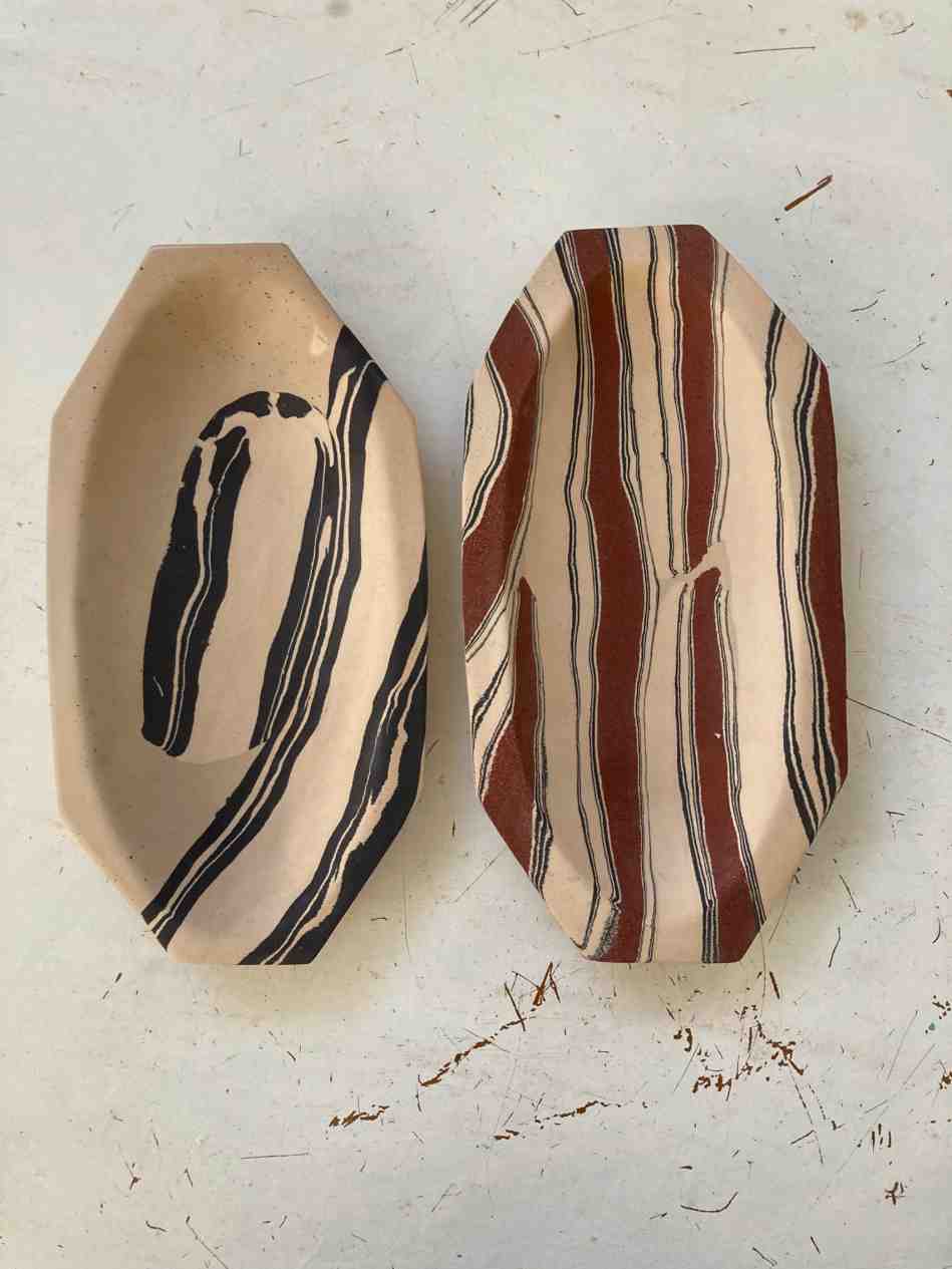 Her work focuses on stoneware and explores the material possibilities of different types of clay, with a particular emphasis on colored clay. Her objects are primarily constructed from slabs composed of various stoneware clays, which are layered and then sculpted into their final form. She uses techniques such as Nerikomi, inlays, slab building, and pinching, allowing structure, surface, and color to emerge together in the process. Each object is handmade and one of a kind.