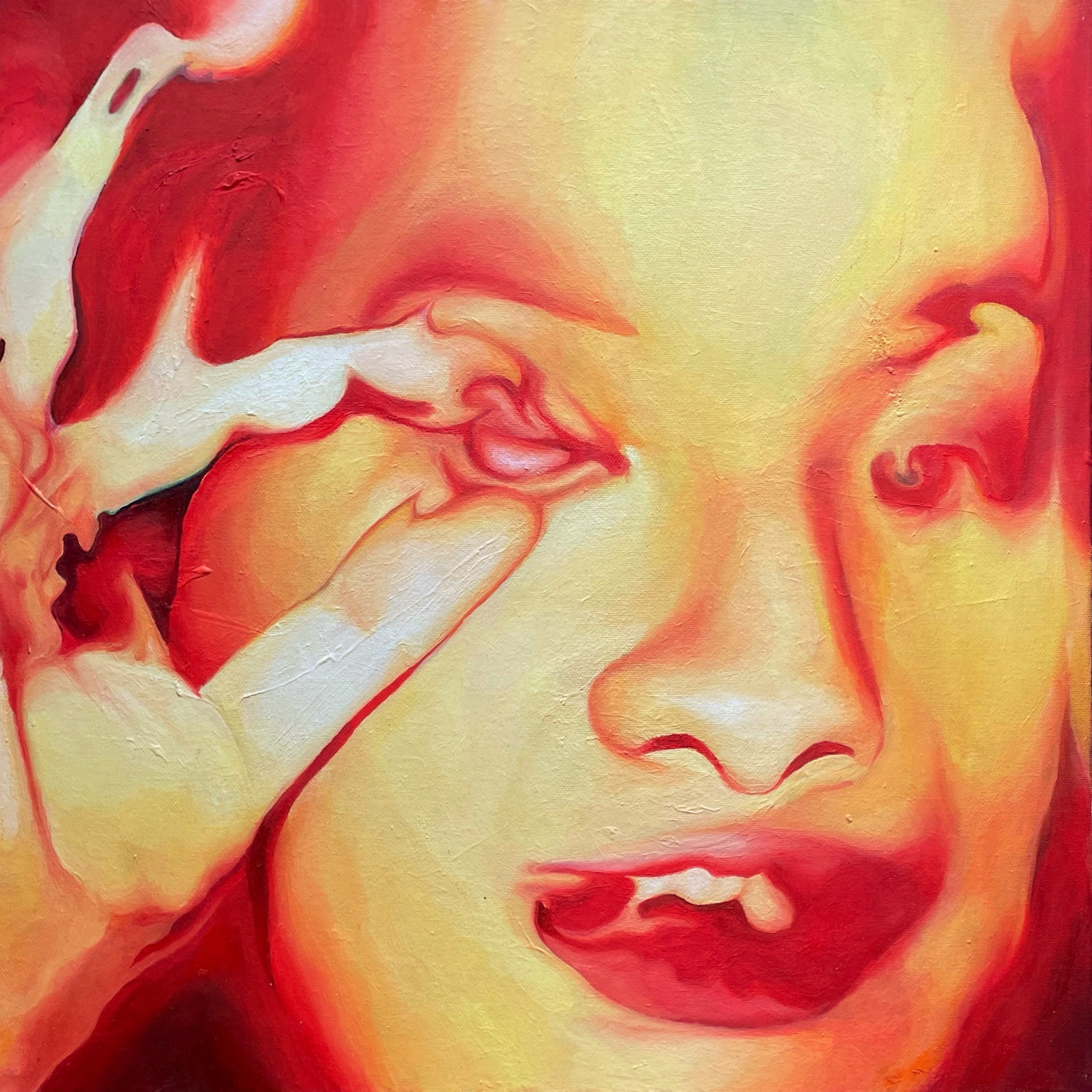 I am a painter navigating the space between the real and the abstract. My work is driven by light, emotion and distortion, and often features vivid reds and yellows that bleed into the skin, creating a surreal, overexposed glow.