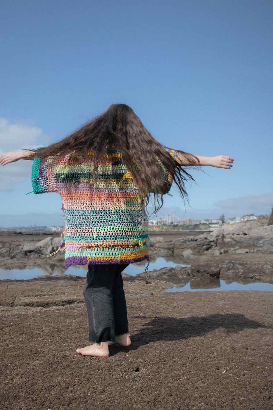 My work revolves around upcycling. I unravel second-hand knitwear and give the yarn a new life through my designs. Each piece is crafted slowly by hand, with attention to texture, color, durability, and individuality.