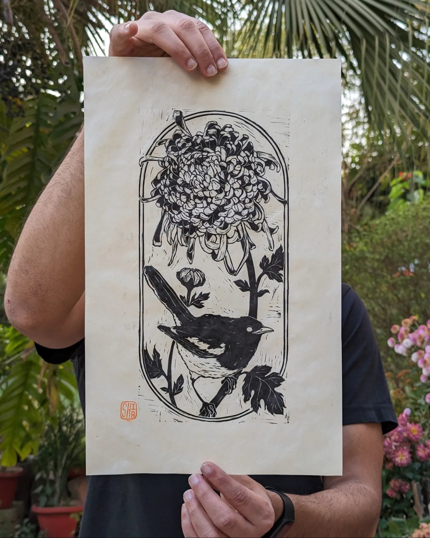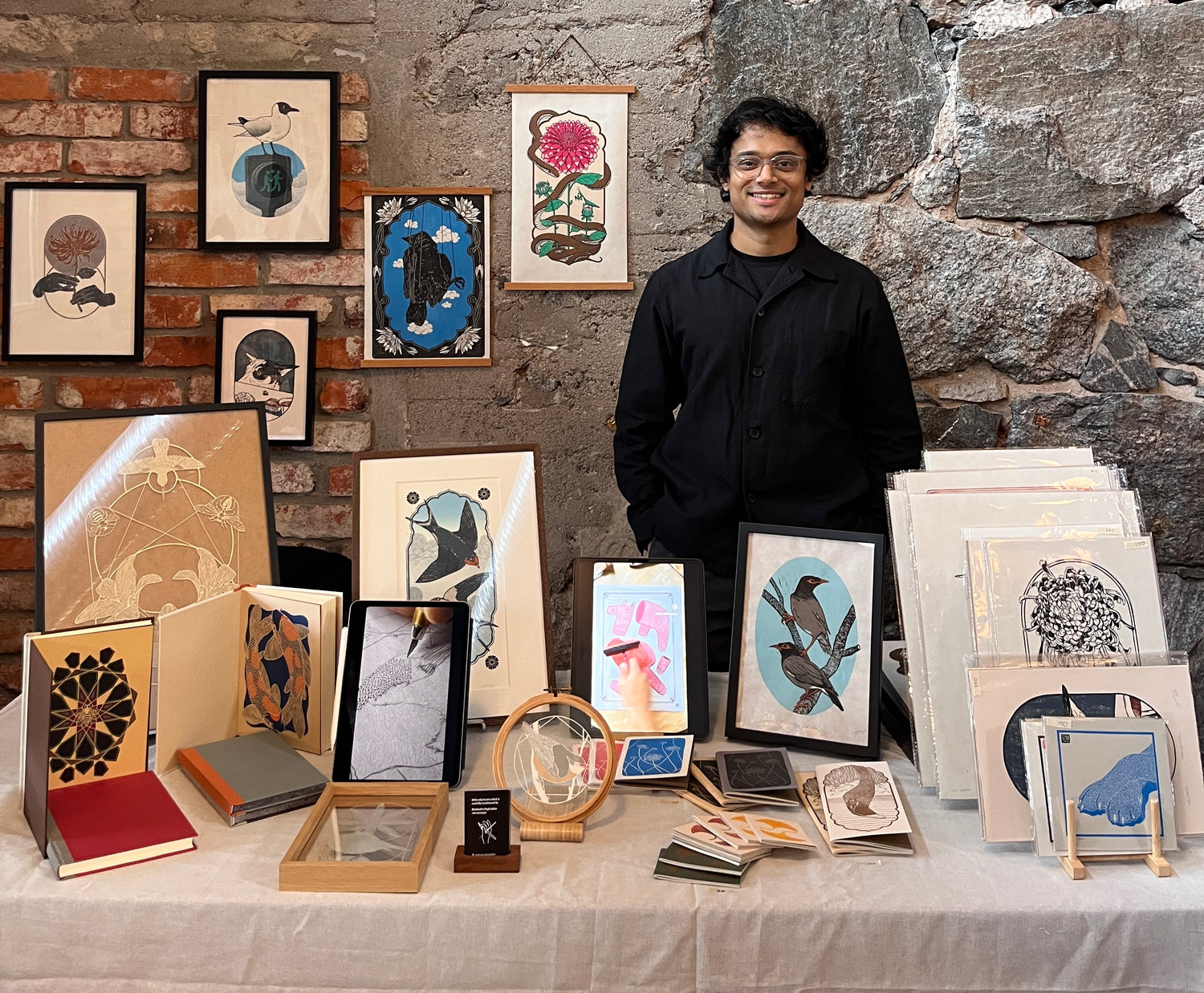 Paper-cutting artworks, linocut prints and hand-stitched notebooks