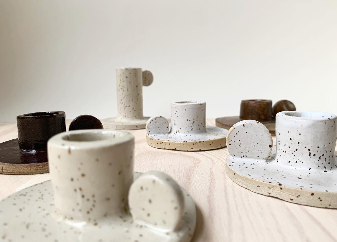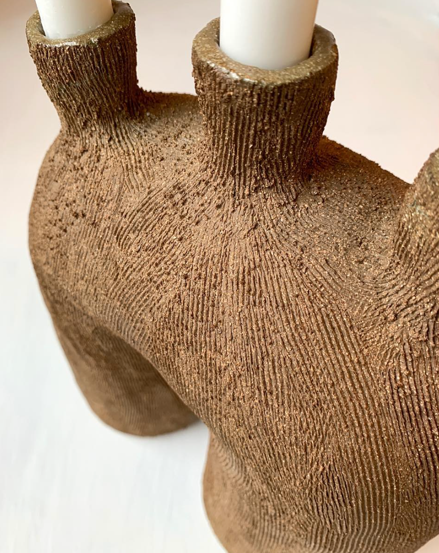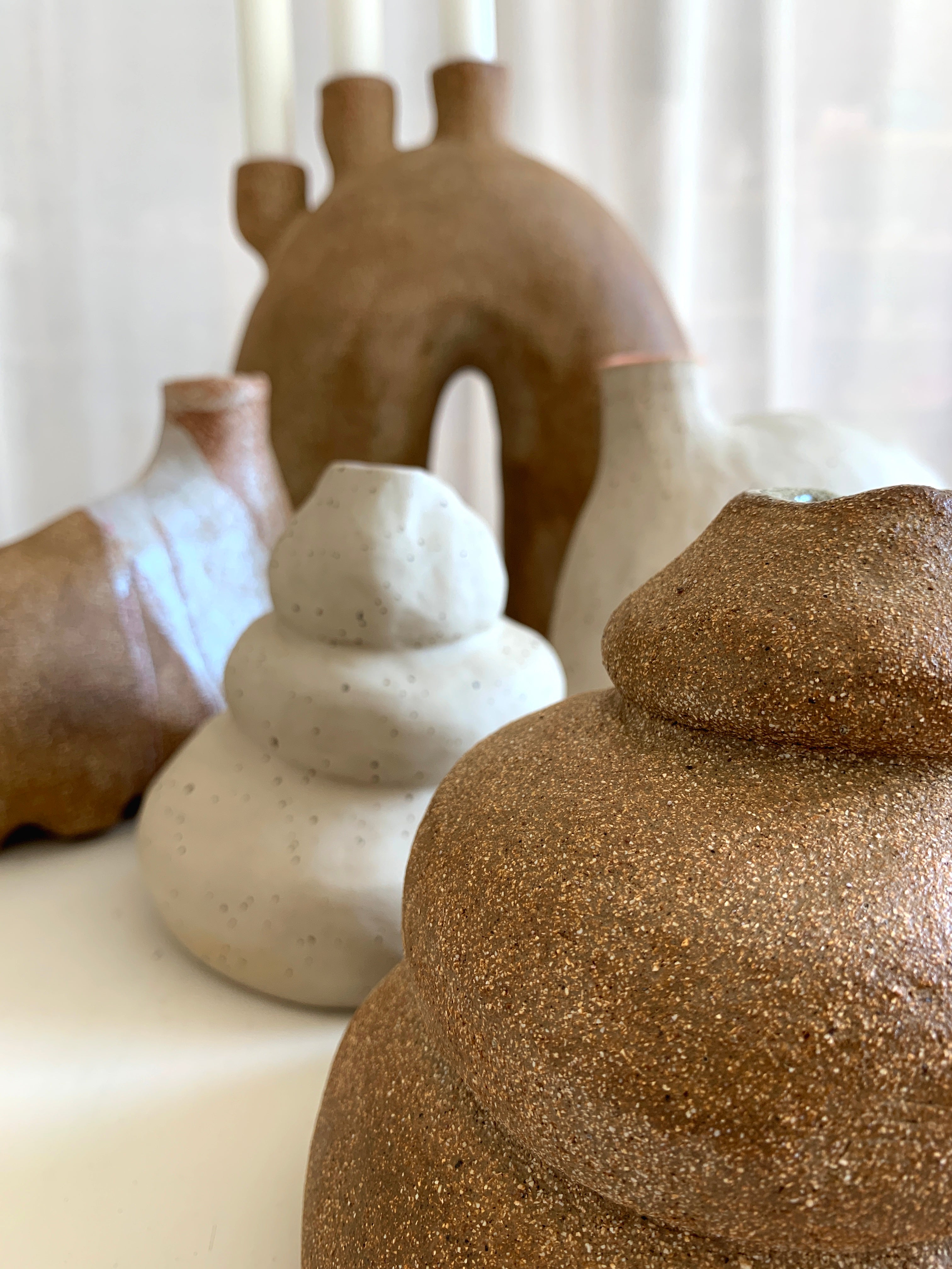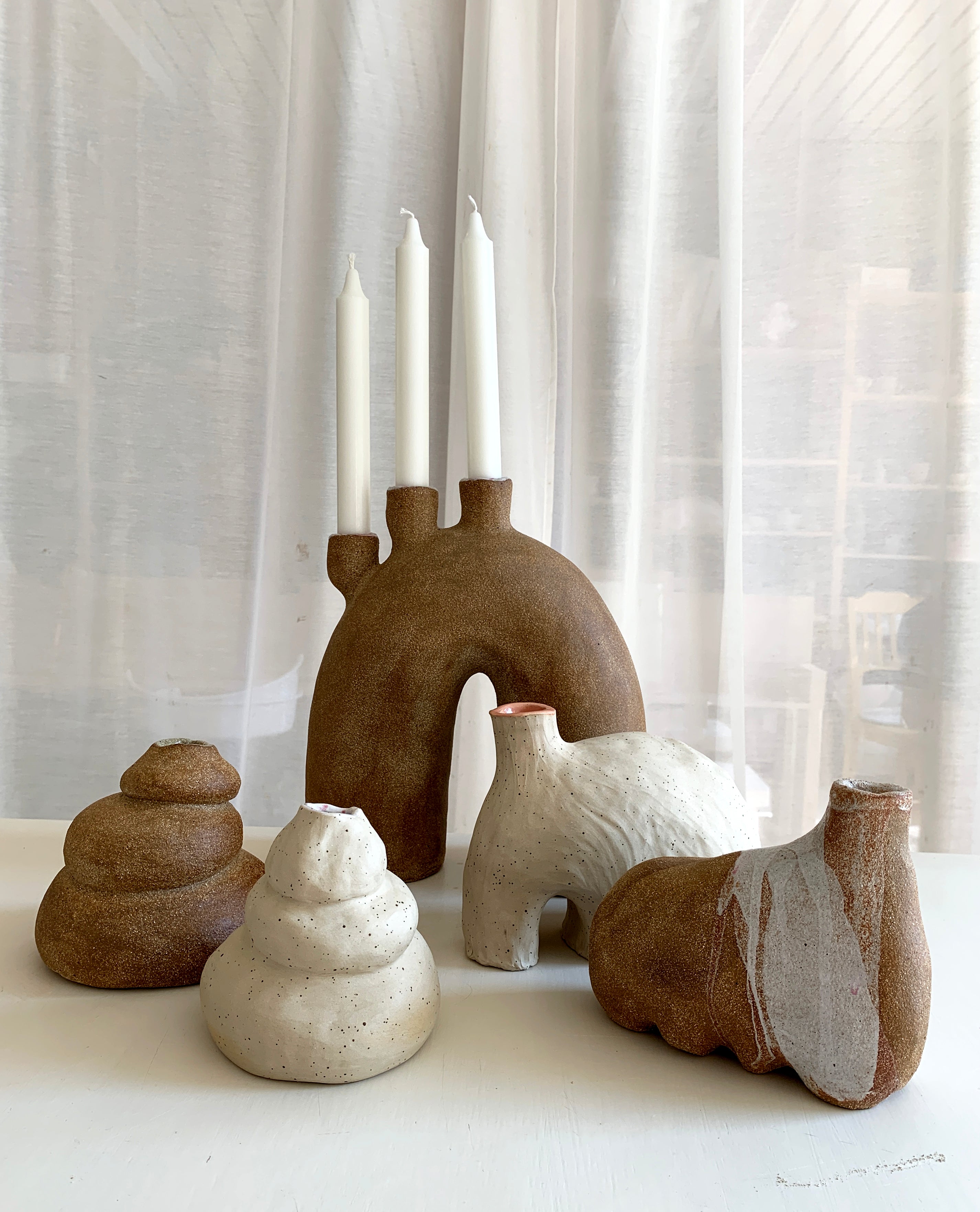 Sofia adores clay as a material for its tactility and hands-on malleability. She often leaves parts of the surface unglazed, creating a beautiful contrast between the raw, fired clay and the glossy glazed surface. Her artistic language is sometimes strict, but other times entirely organic, drawing inspiration from animals and nature. It is this organic and bodily aspect that inspired her collection of four vases and a candlestick for Cay collective in the spring of 2023.