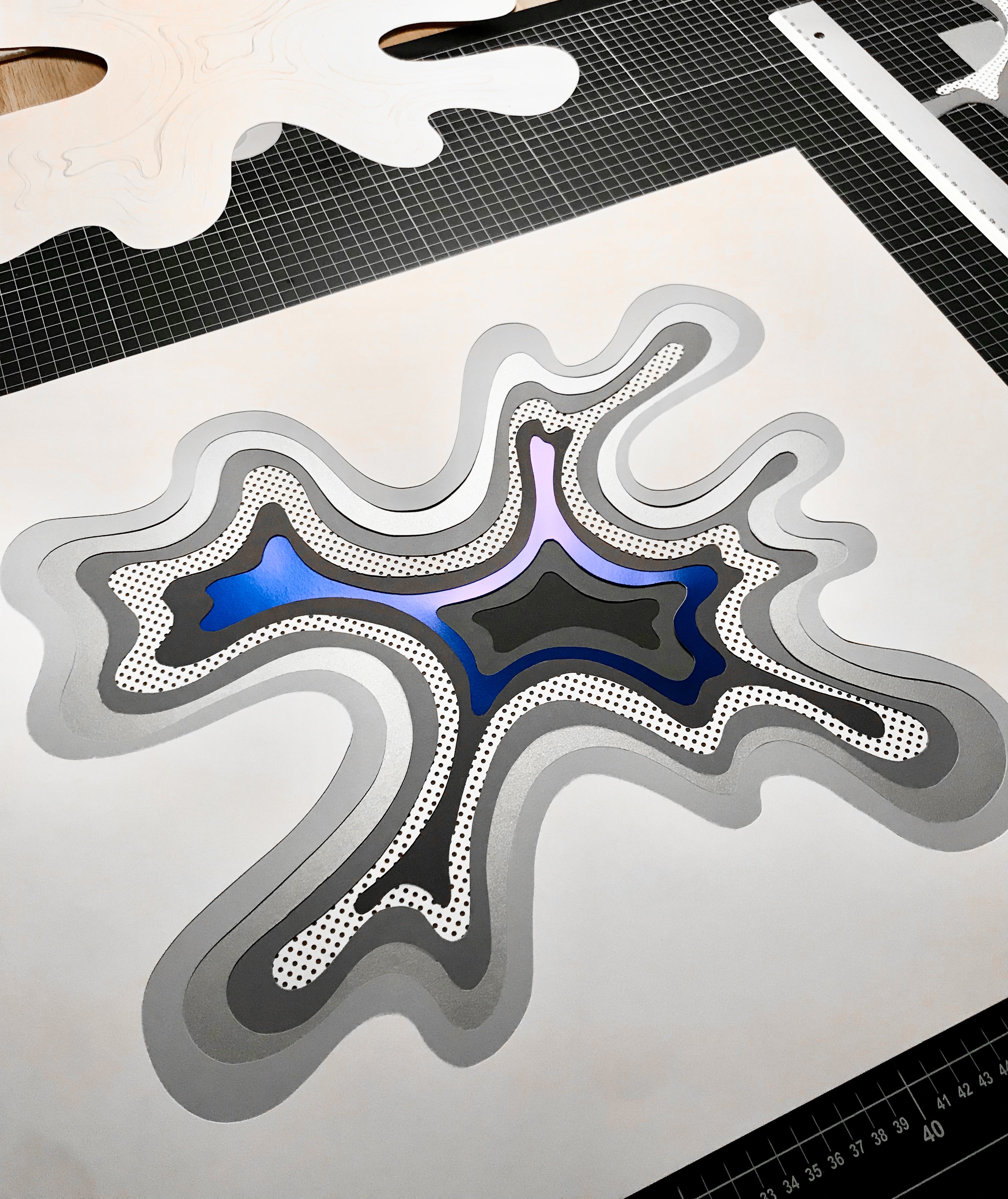Her latest project focuses on paper art with varying volume and structure. Each layer is carefully hand-cut, creating a three-dimensional effect. Every piece is unique, with forms that either expand outward or draw inward.