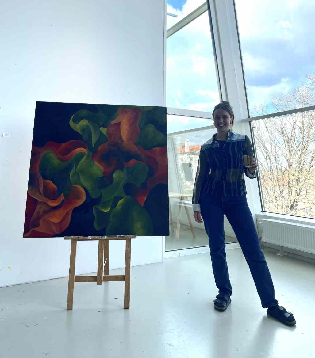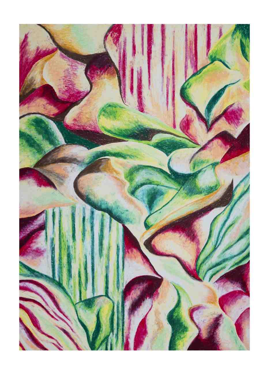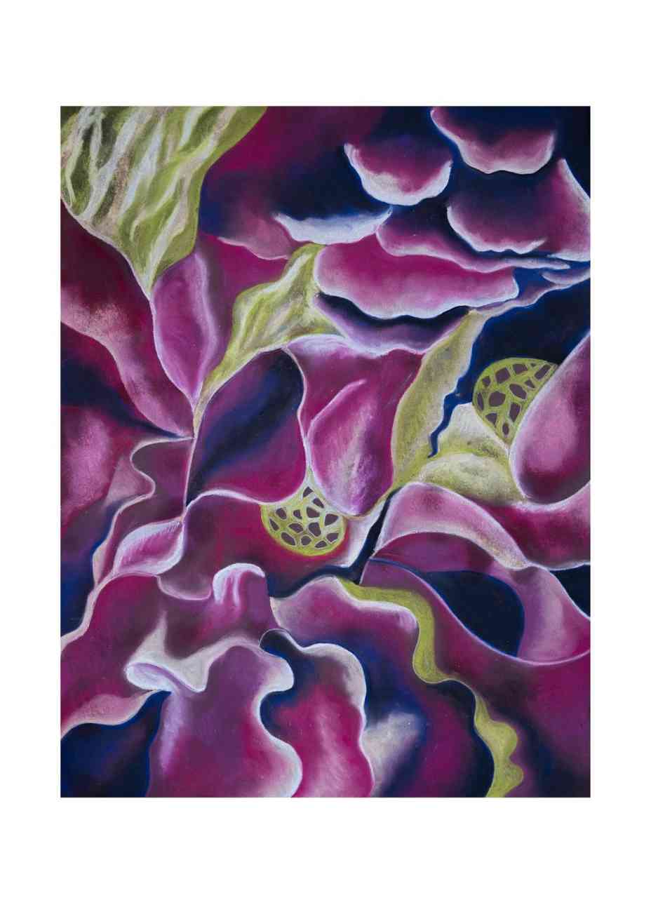 The wavy and organic forms that can be seen in my selection of artworks have come to define my style. I like to experiment with different types of techniques such as oil paint, dry pastel, oil pastel, acrylic and ink. Water, seaweed, flowers and corals inspire me and color and contrast are a must in my opinion!