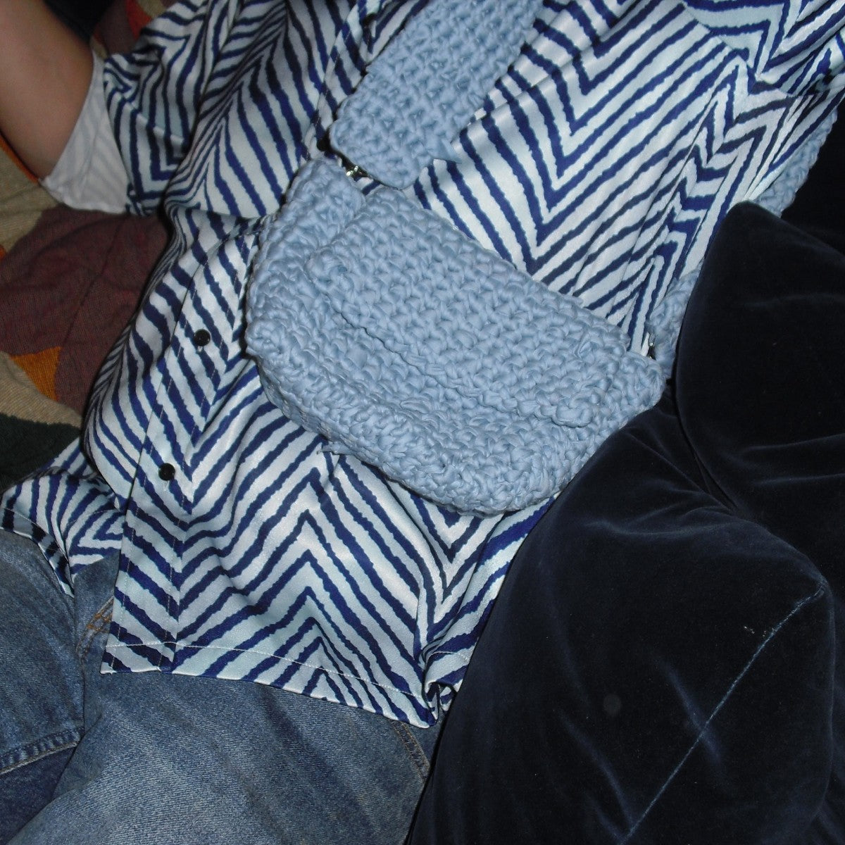 This baby-blue "becky" with lid and crossbody strap is the perfect bag when you want your hands free. Made from recycled jersey (think t-shirt fabric), it is both soft and durable, and holds everything you need in a simple way. A bag that only gets better the more you use it, as it will mold to you and stretch a little over time.
