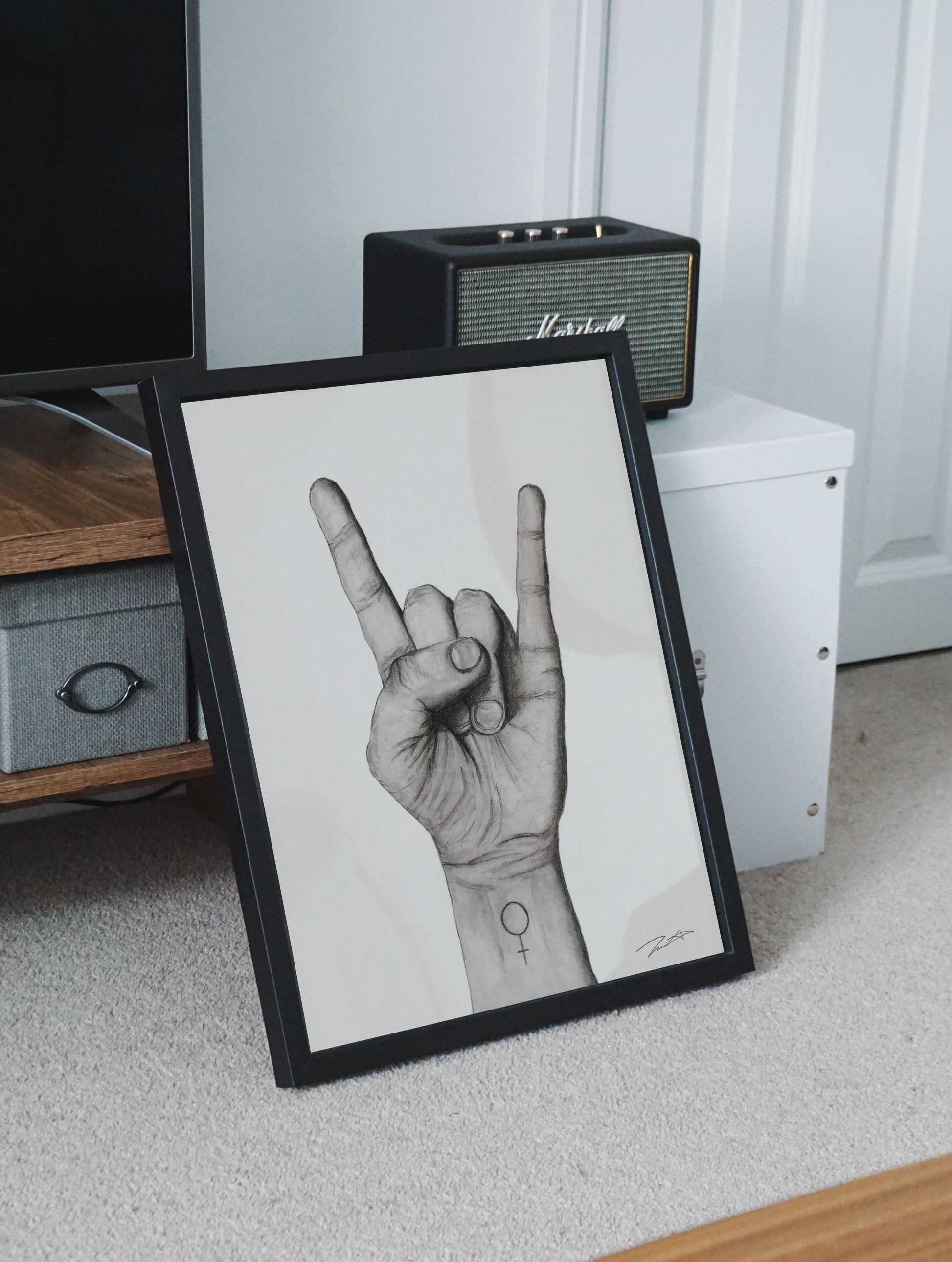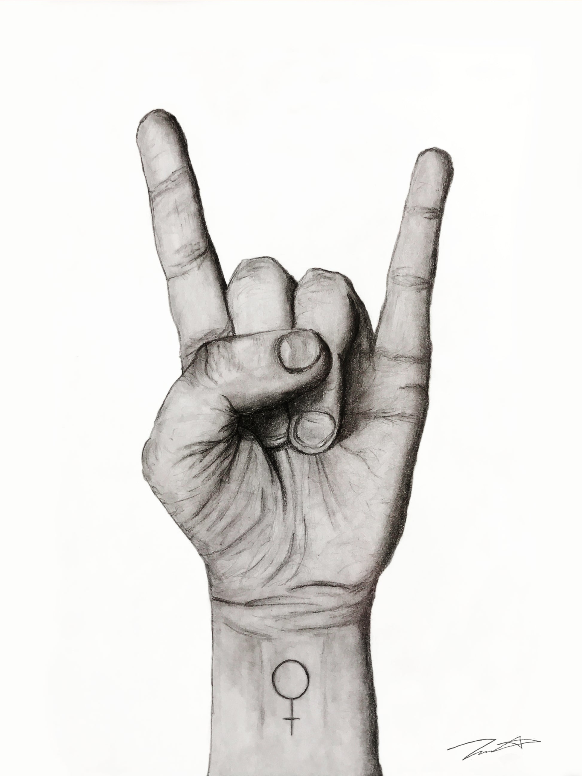 Black and white rock 'n' roll hand (left), with a tattooed Venus symbol. ‘21st Century’ is a collection of three works that, through different hand gestures, symbolize prominent social phenomena in 21st-century society.