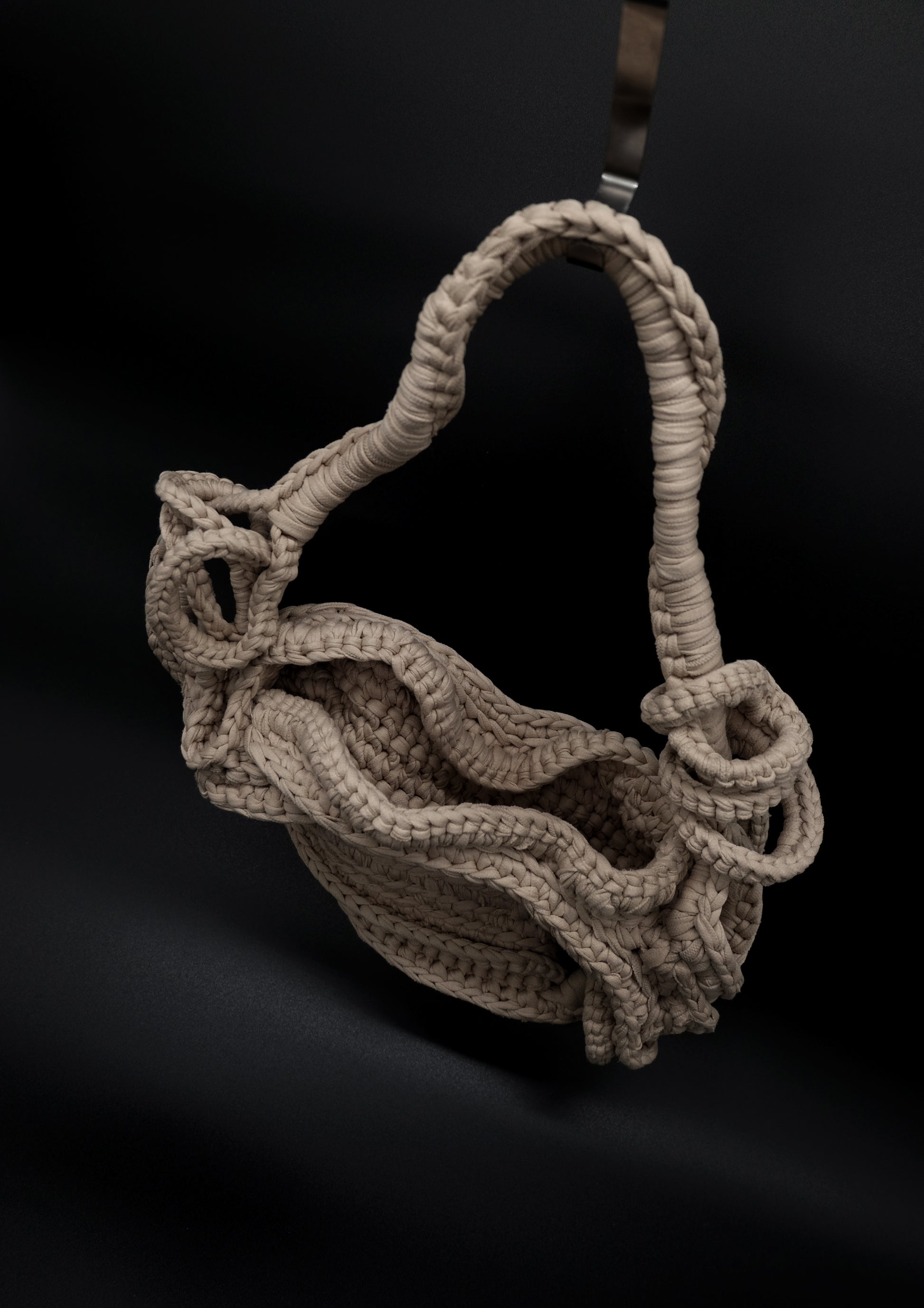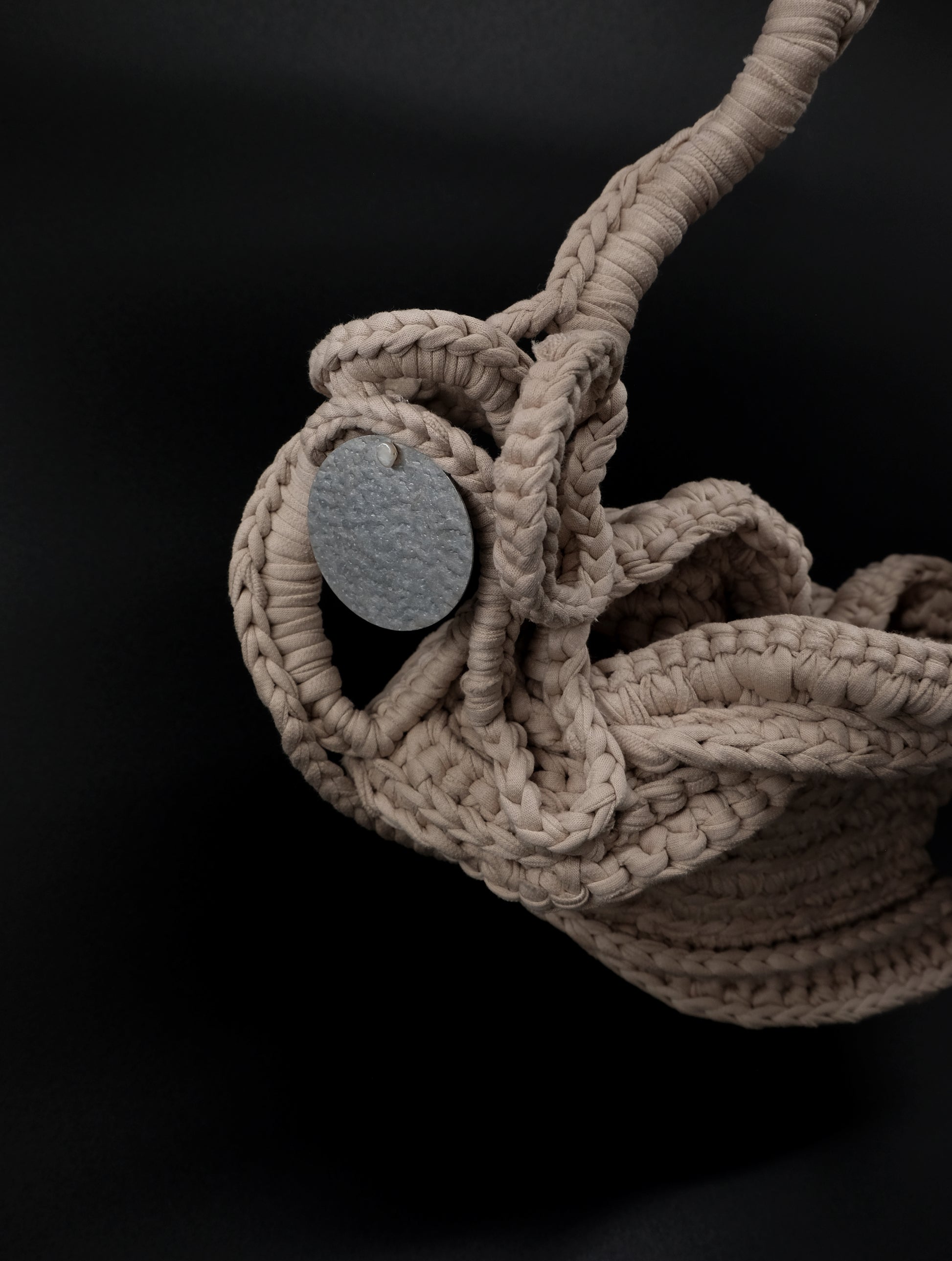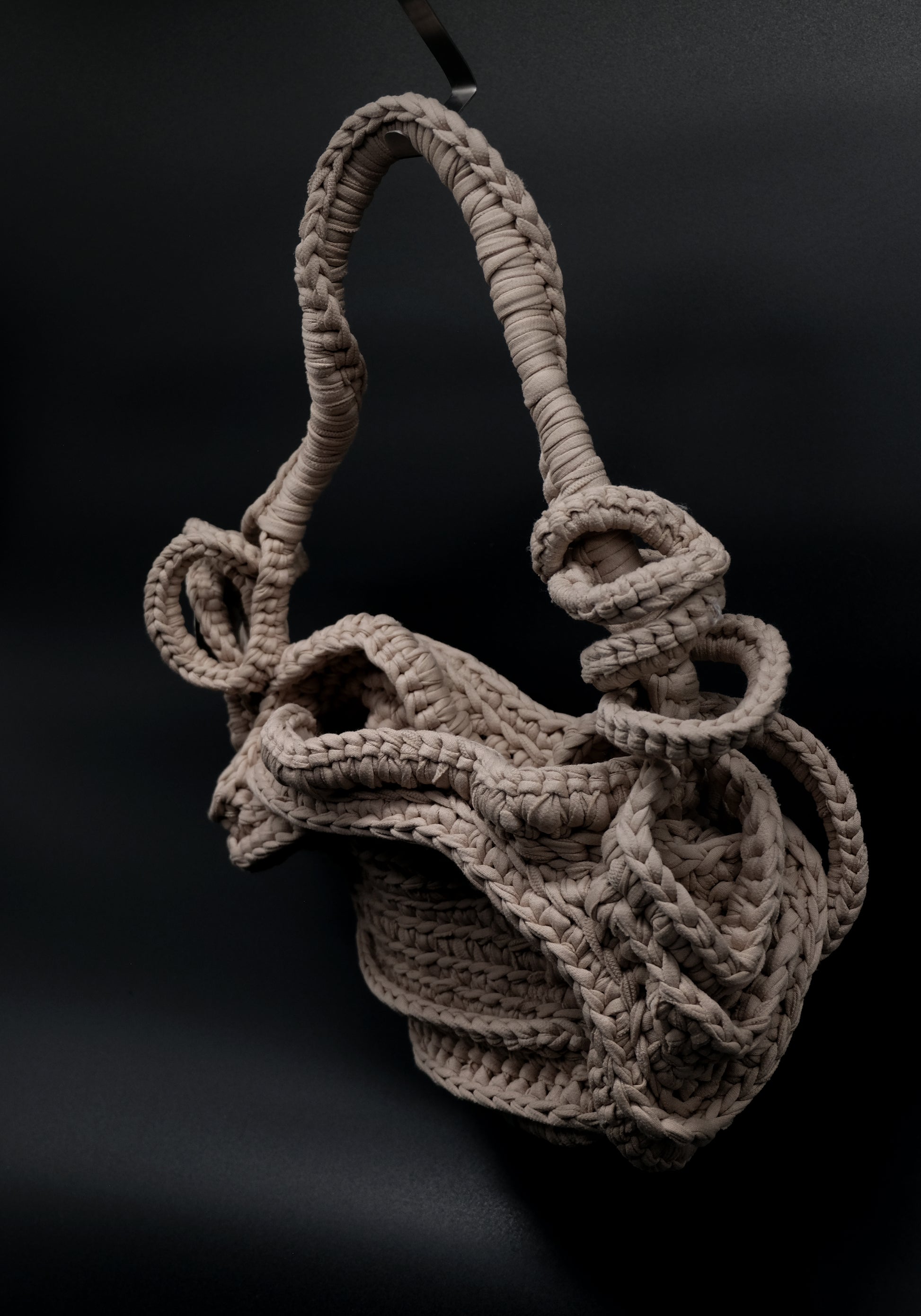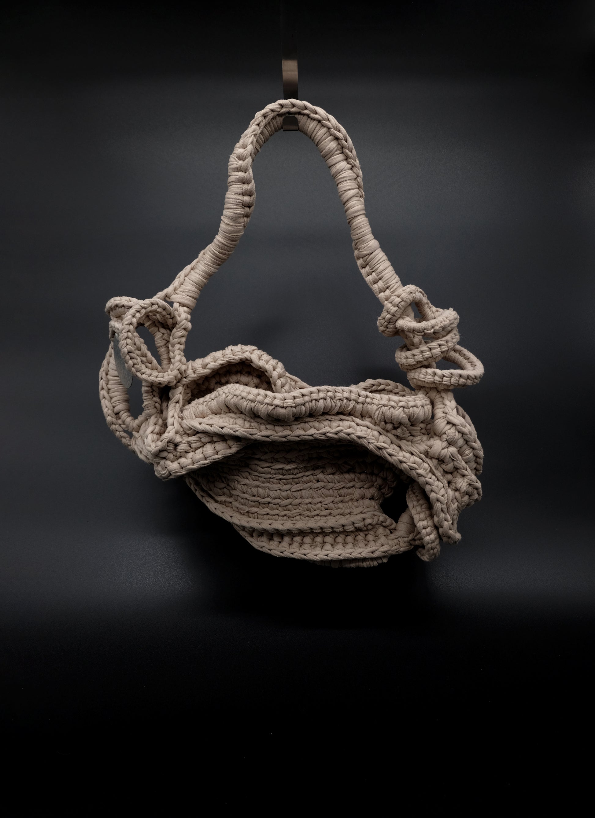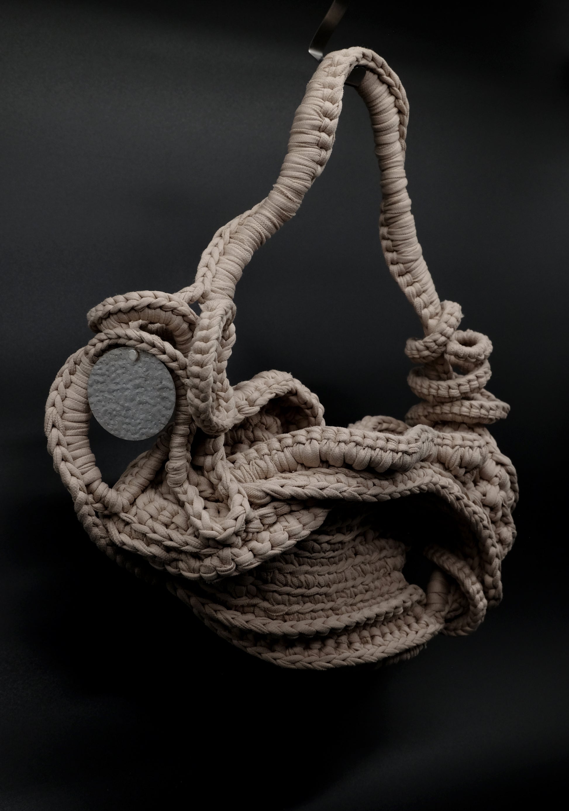 The intricate texture and flowing design are reminiscent of sand dunes, where each wave in the yarn mimics the subtle curves and crests left by an unseen hand of wind. Like the sand reshaped by natural forces, this purse celebrates freedom and change. Its organic, flowing lines and harmonious palette of earthy tones reflect a landscape in constant motion, invoking the transformative power of the Aeolian wind.