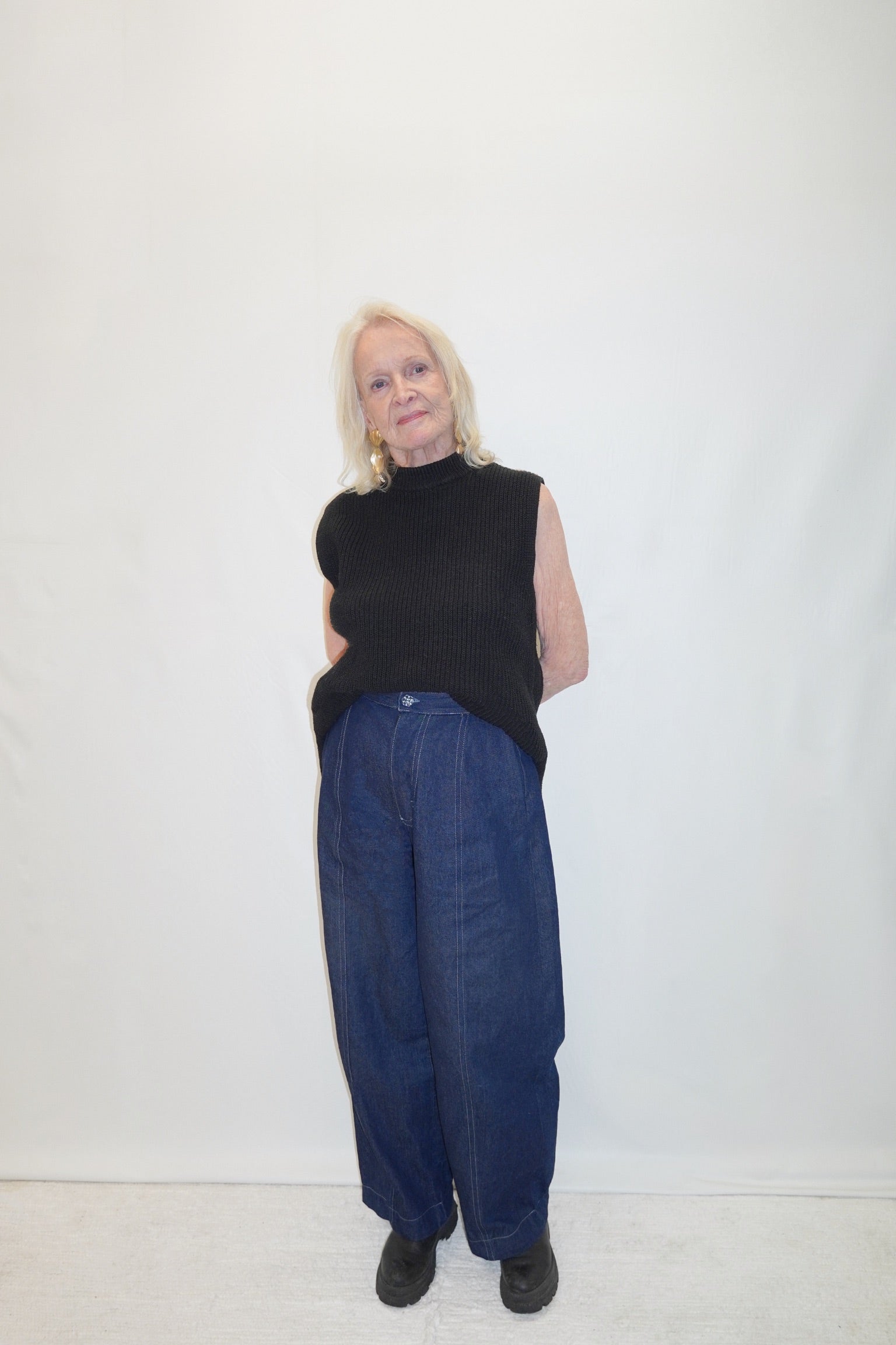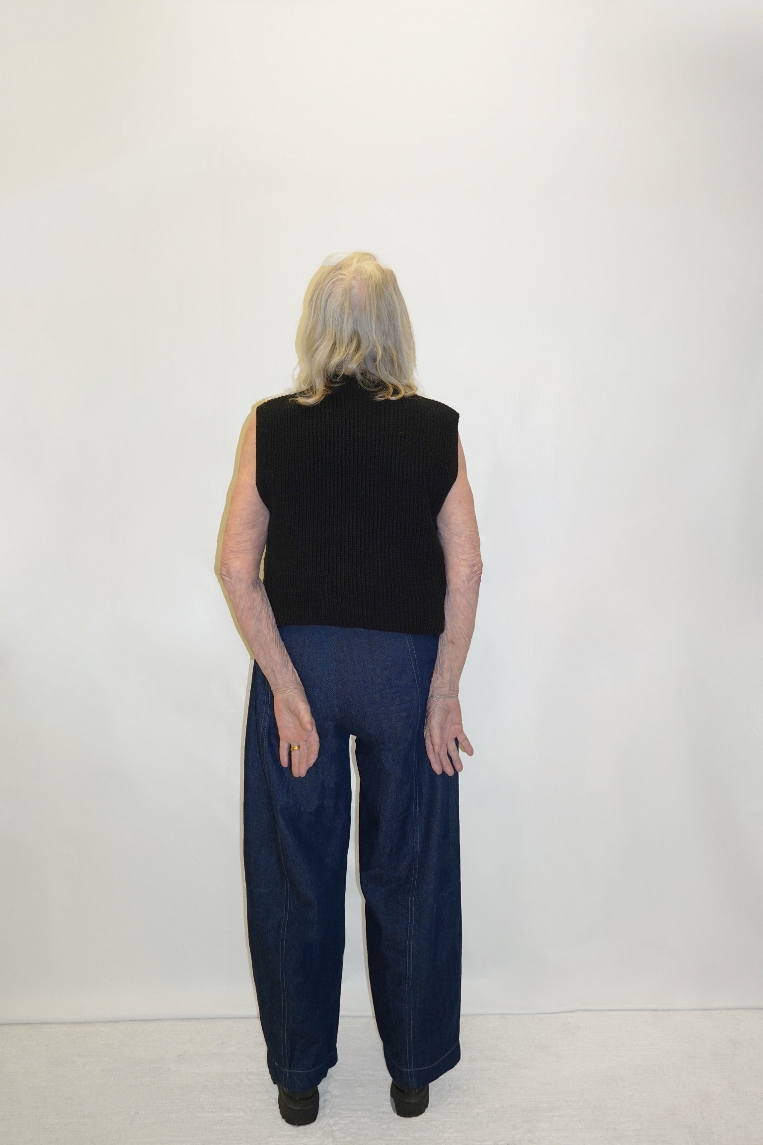 Blue jeans in four parts with light blue stitching. Hidden side pockets and a detailed floral button at the waistband. Wear them however you like. For example, as a perfect complement to the Alba top, with or without flounce, with any blouse, or let the jeans be your "center piece" paired with a basic top.