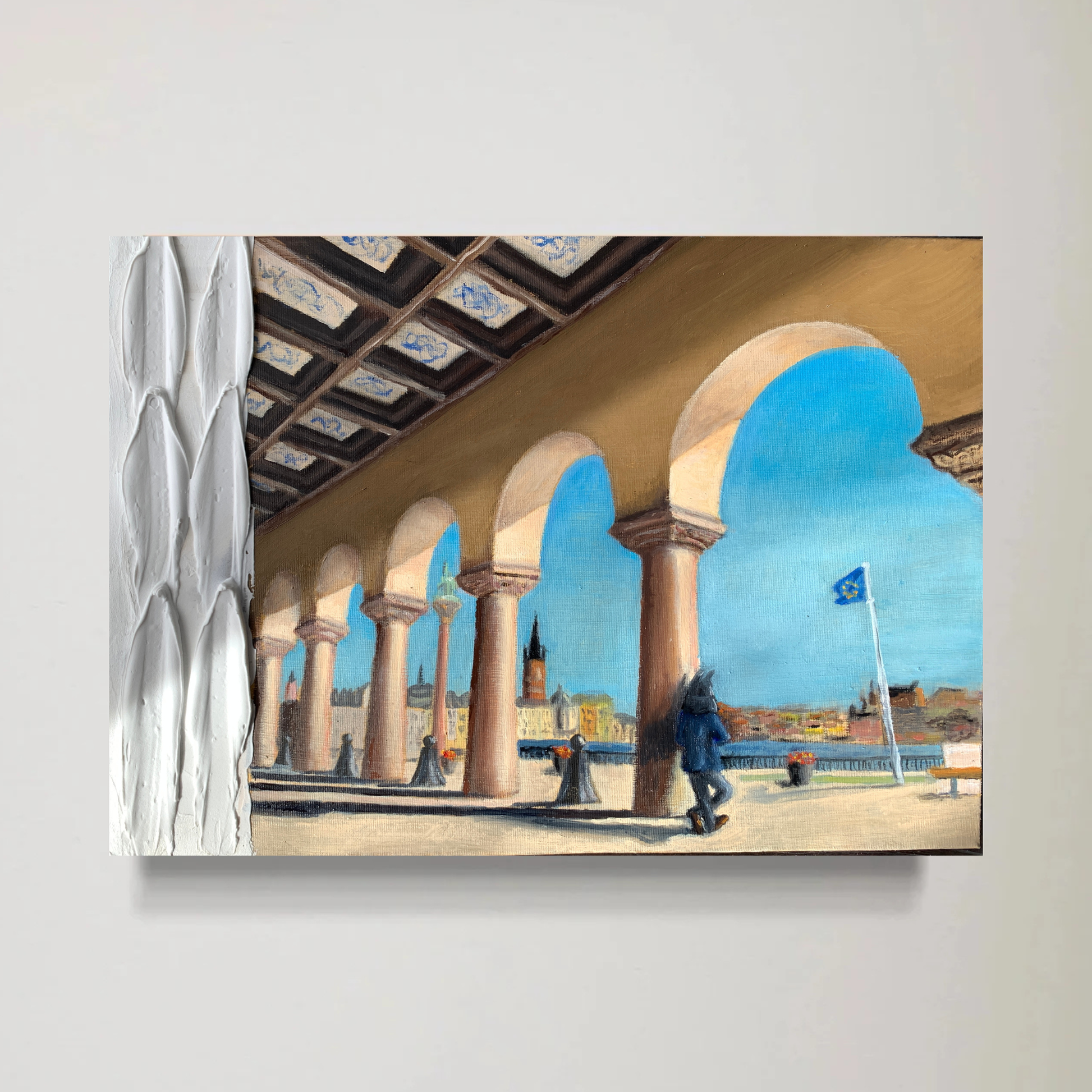 “BatVader at the Stockholm City Hall” (Stadshuset) BatVader is a character I've created who is a mixture of Batman and Darth Vader. Stockholm City Hall was the first place I’ve visited for sightseeing in Stockholm in April 2025. It was very pleasant to watch the view from that point. This work is a painting of one of the photos I’ve taken there. There is an arch shape and BatVader is looking towards the light from a darker spot. He is leaning against a strong column - getting strength from it, arms crossed, feeling slighly relaxed, just watching, observing and thinking. Kind of a representation of looking at the bright future. You can see Södermalm across the shore, Riddarholmen Church/ Riddarholmen area, Stockholm Cathedral and statue of Engelbrekt Engelbrektsson. I’ve finished this painting before my 2nd visit to Stockholm in July 2025 and it was so pleasant to see Stockholm, the City Hall and re-see this view again from this spot. Hope to see you again, Stadshuset.