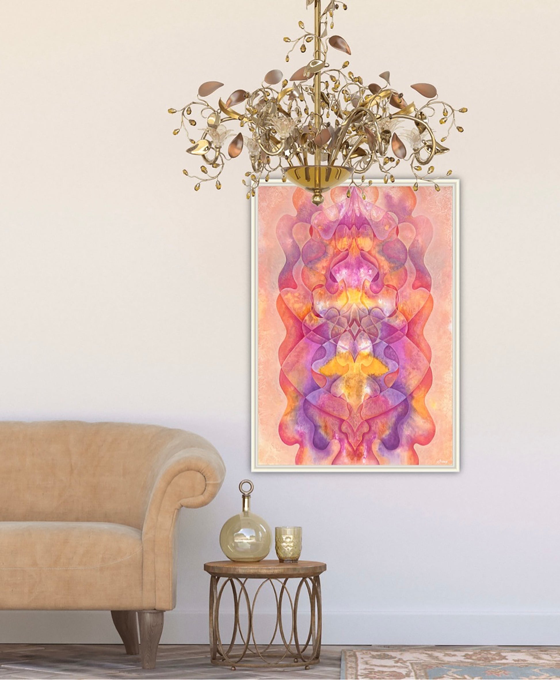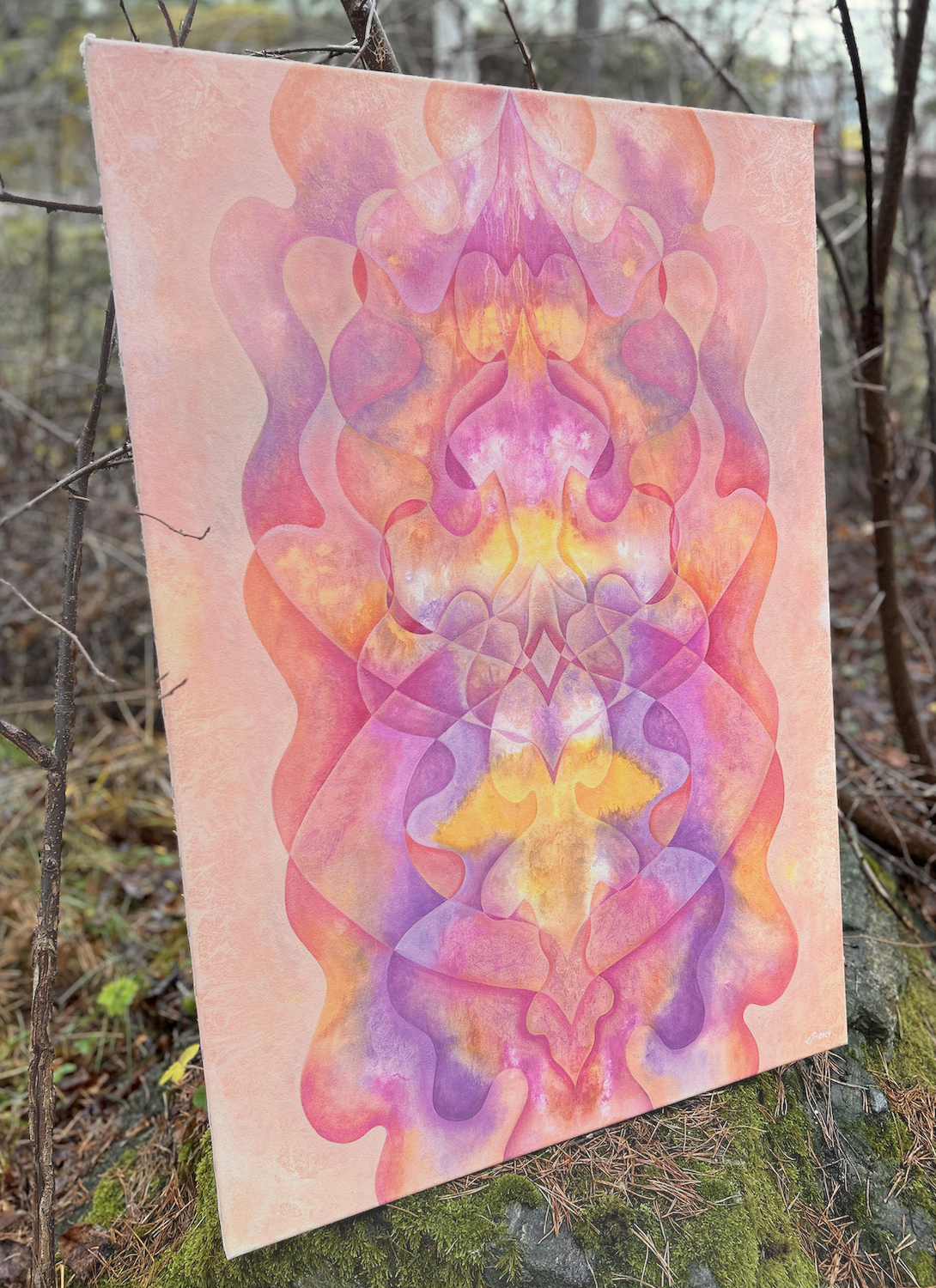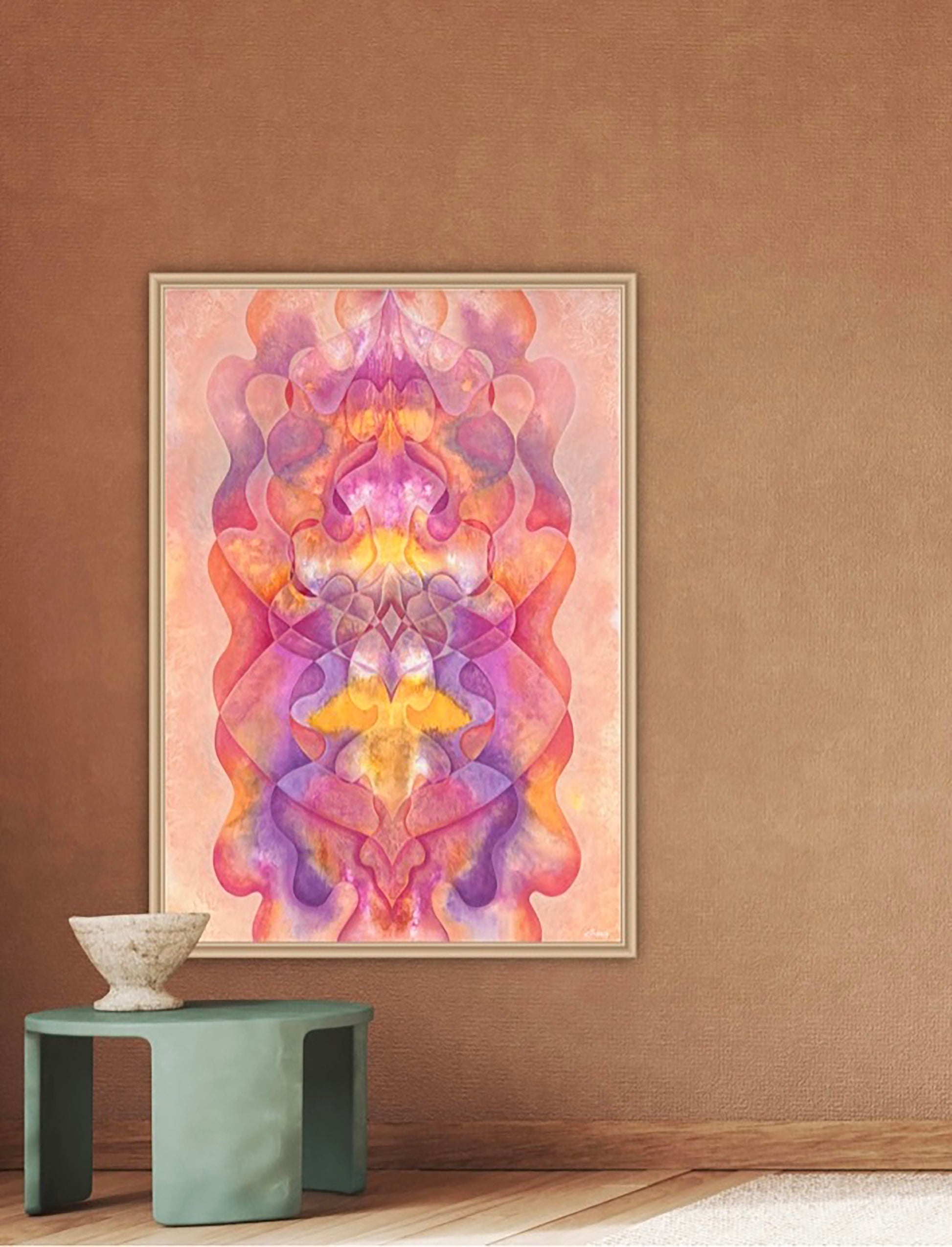 Abstract painting with flowing forms in vibrant pink, apricot, orange, and purple. A warm composition that exudes vitality, life force, and the organic birth of something new.