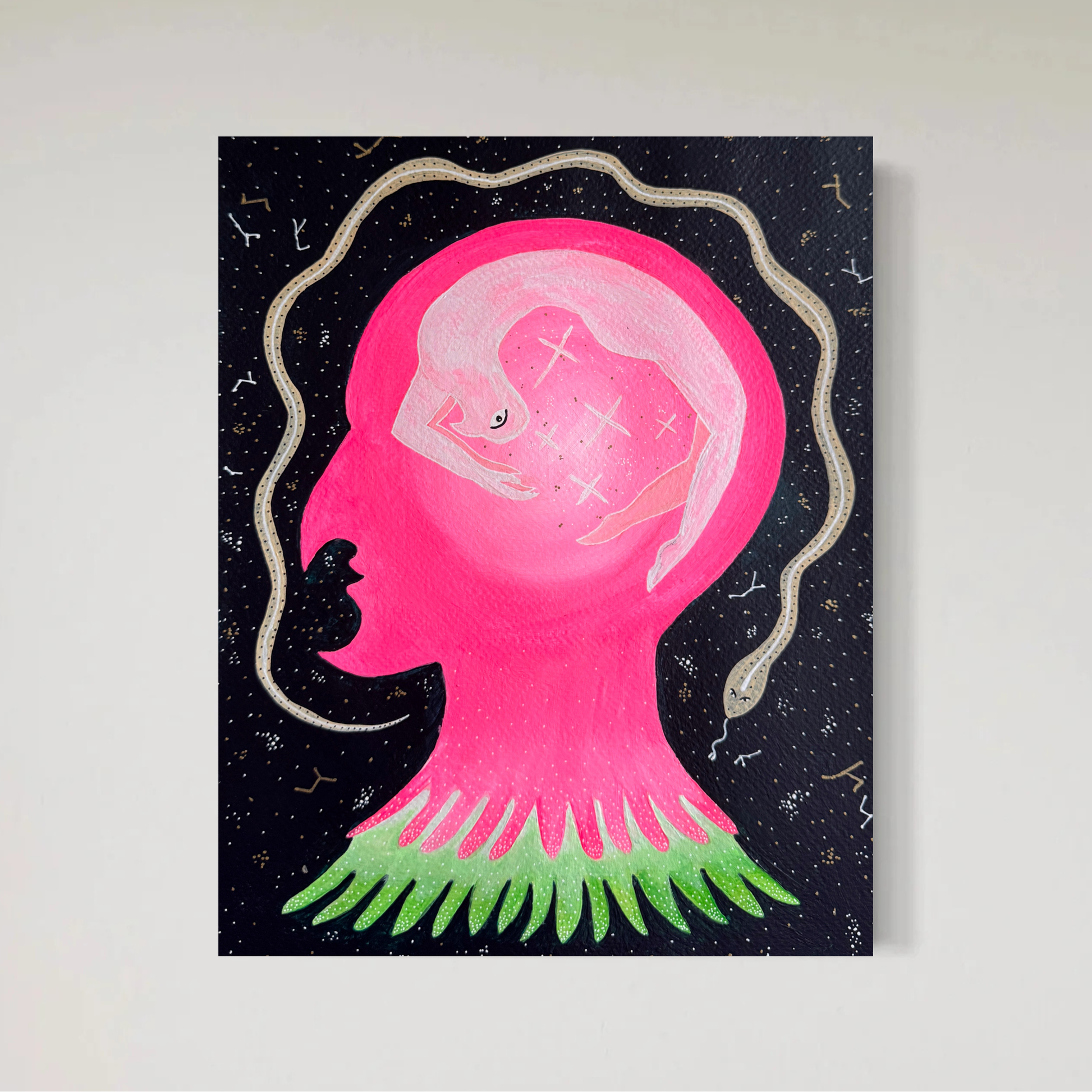 A mind floats among the constellations, distant and alone. The pink face appears sinister, its pointed nose and angular chin carved by bitter experiences.