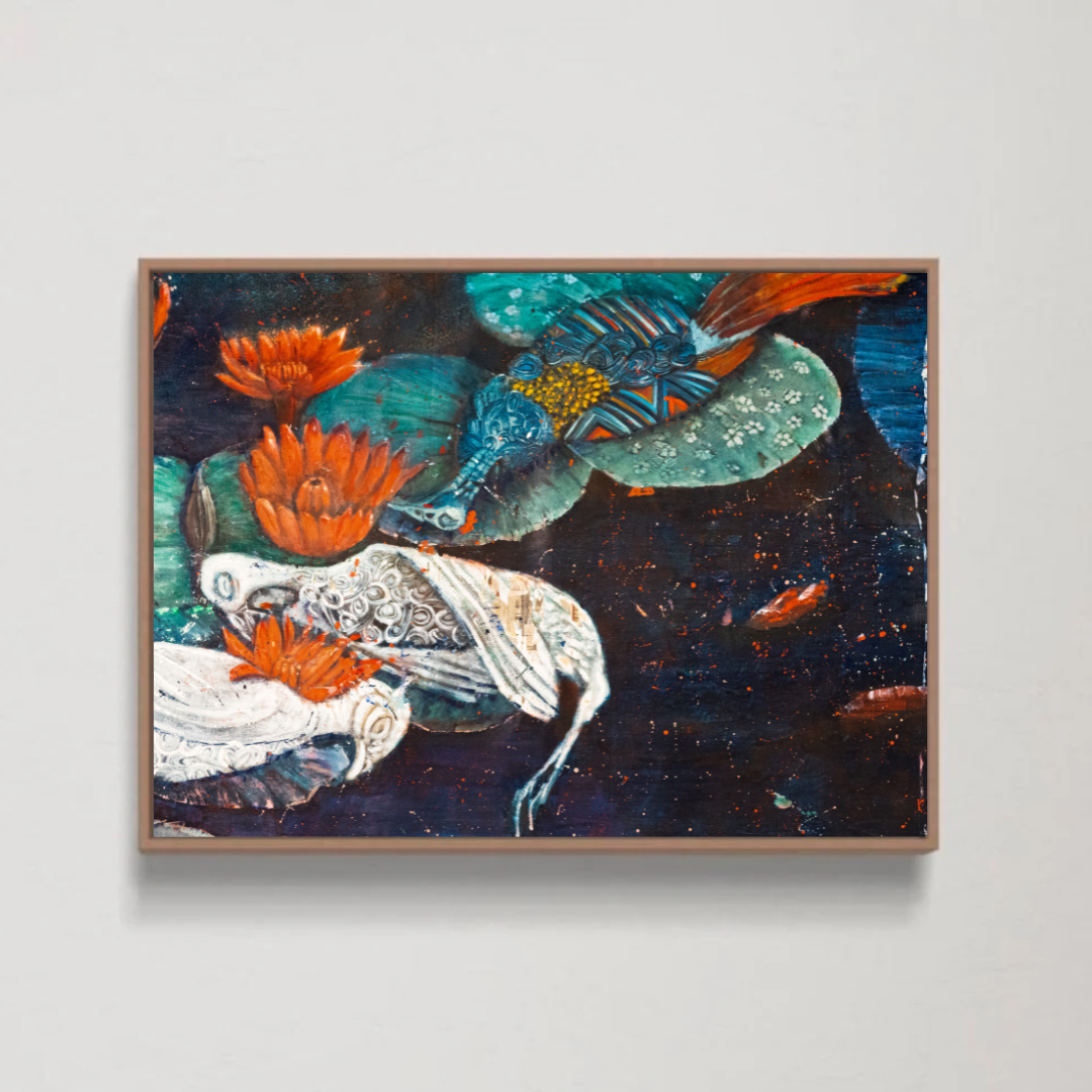 Ingrid’s painting Float into Nothingness draws inspiration from a poem by Keats “When I have fears that I may cease to be”. Initially created with live cranes resting on water lilies for her textile store in Kungsholmen, Stockholm, the piece evolved to feature dead birds, moving away from a purely decorative aesthetic to a deeper, more mournful narrative. The original piece is done with oils on linen measuring 2.75 x 1.50 m