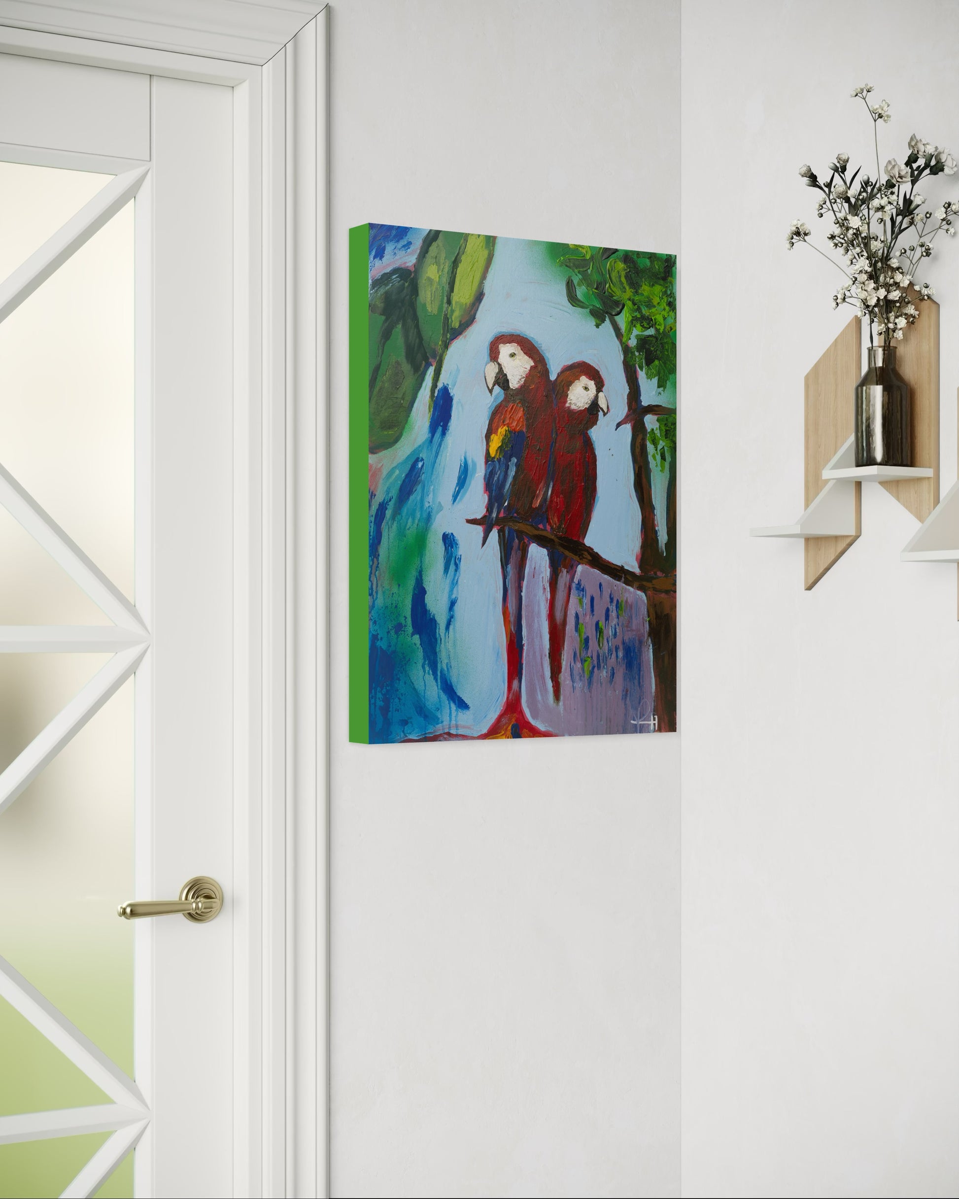 "Vibrant Bond" is painted by Hala Albayati. It is created with acrylic paint and spray paint on canvas, giving it a unique texture and energy. The painting was done using her fingers, except for the small details in the parrots’ eyes, which were carefully painted to capture the depth of life in each gaze. It’s perfect for those who seek an artistic and personal touch in their home.