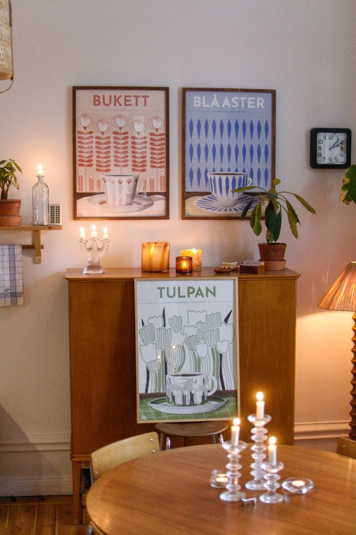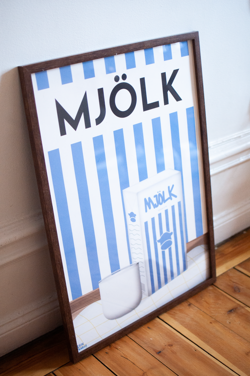 The graphic poster "Blå Mjölk" is designed by Erik Fläder who makes art out of retro, Scandinavian patterns and packaging designs. Get sentimental while feeling a sense of joy by putting this unique piece on your wall!