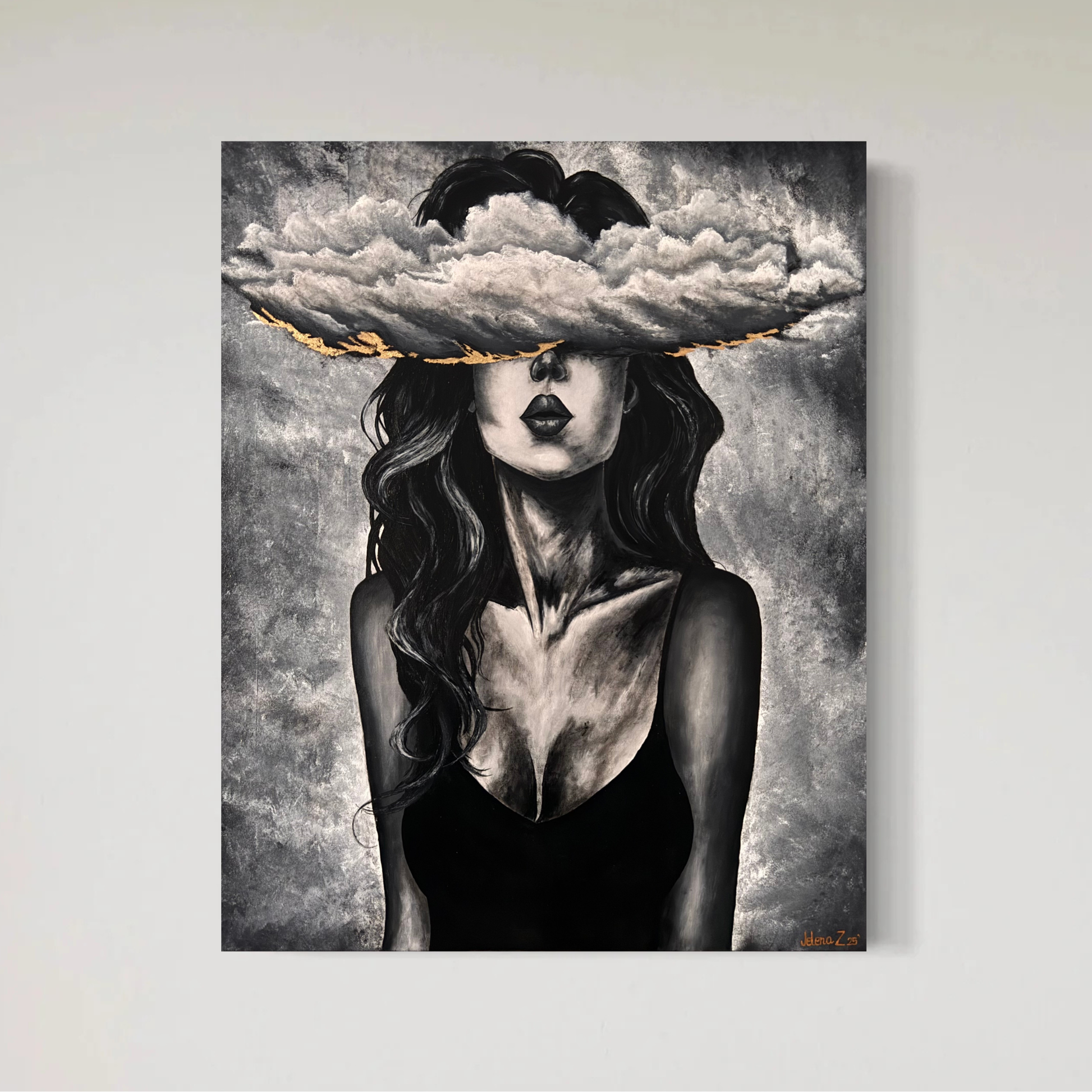 Black and white acrylic painting with gold details, capturing a powerful and calming moment. Size: 80×100 cm.