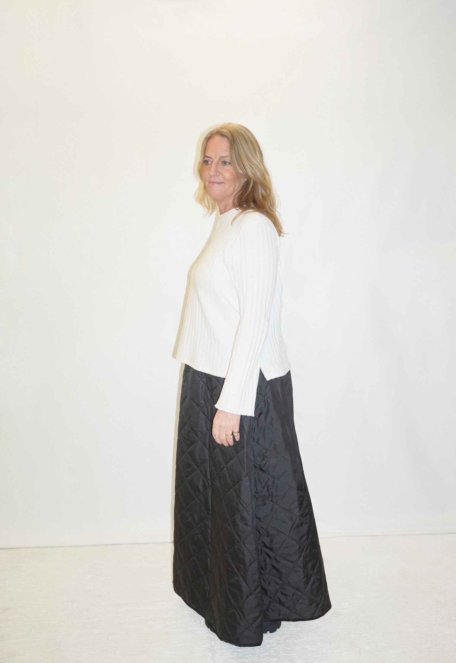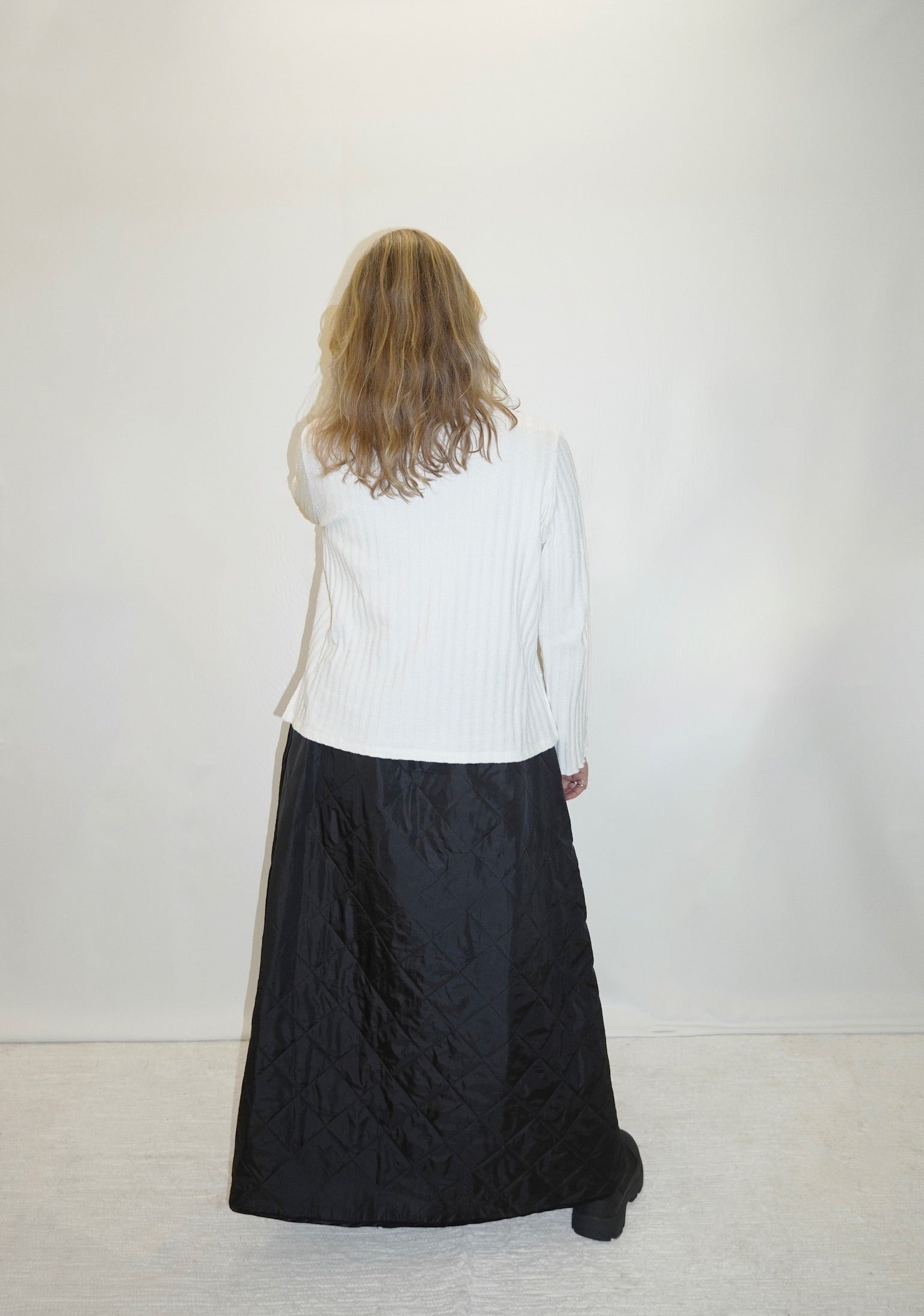 A black quilted skirt with silk band edging. A full skirt with an elastic waistband that makes it comfortable and easy to move in. Perfect on its own for both everyday wear and special occasions, or worn over your pants for added warmth. Pair it with the Black Edith vest for a complete look, or style it with any top of your choice.