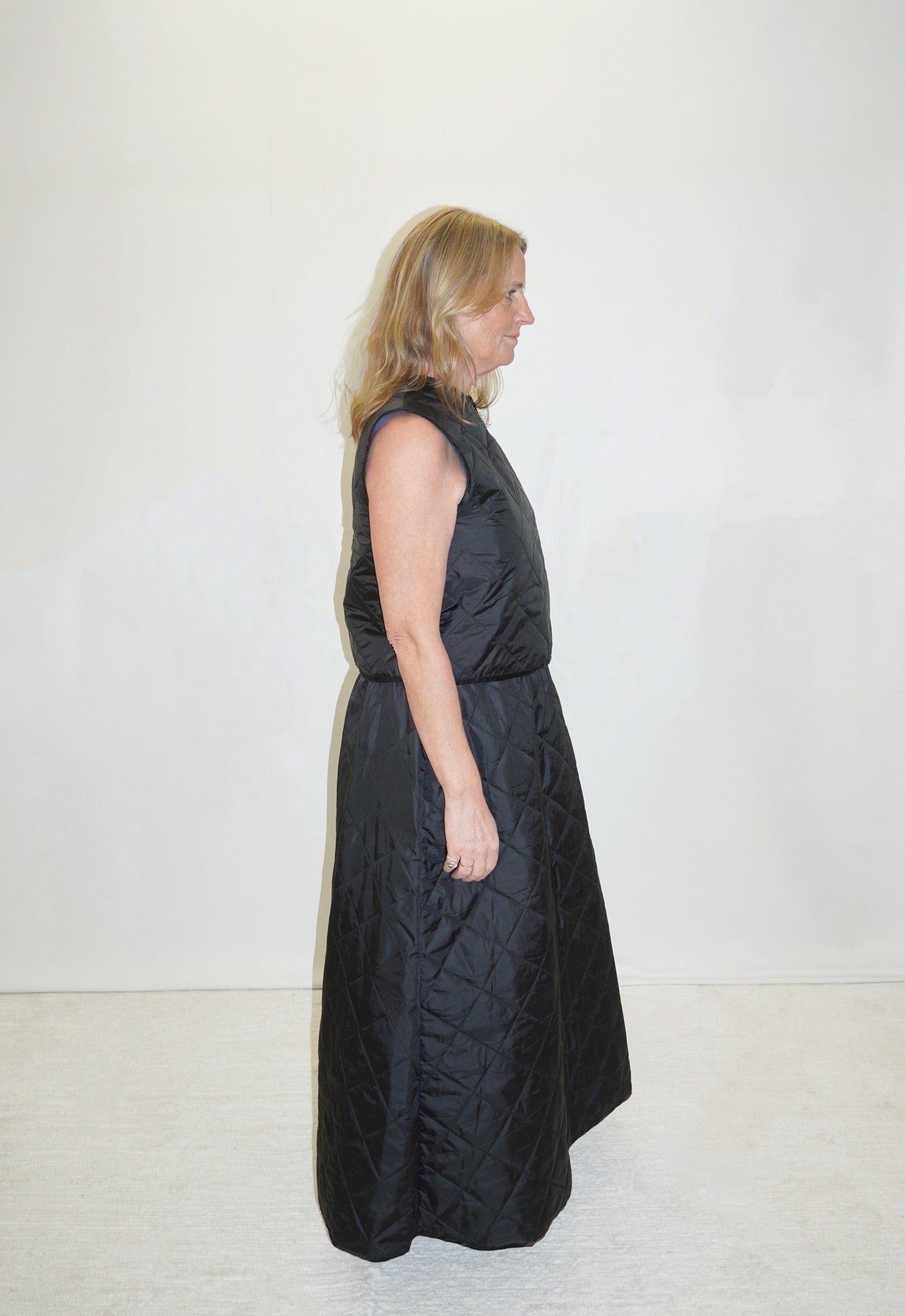 A black quilted vest with silk band edging. It fastens in a wrap style with a beaded bow over the shoulder and snap buttons at the side. Can be worn both casually and for special occasions—on its own, under your jacket for extra warmth, or over a knitted sweater. Pair it with the Black Edith skirt for a complete look, or style it with any bottom of your choice. (Available with silk lacing instead of the beaded bow and snap buttons).