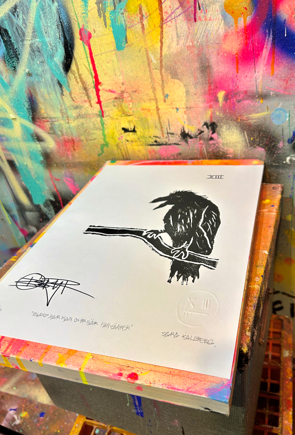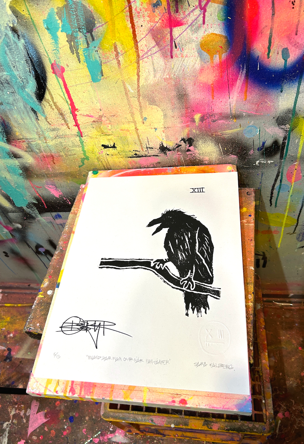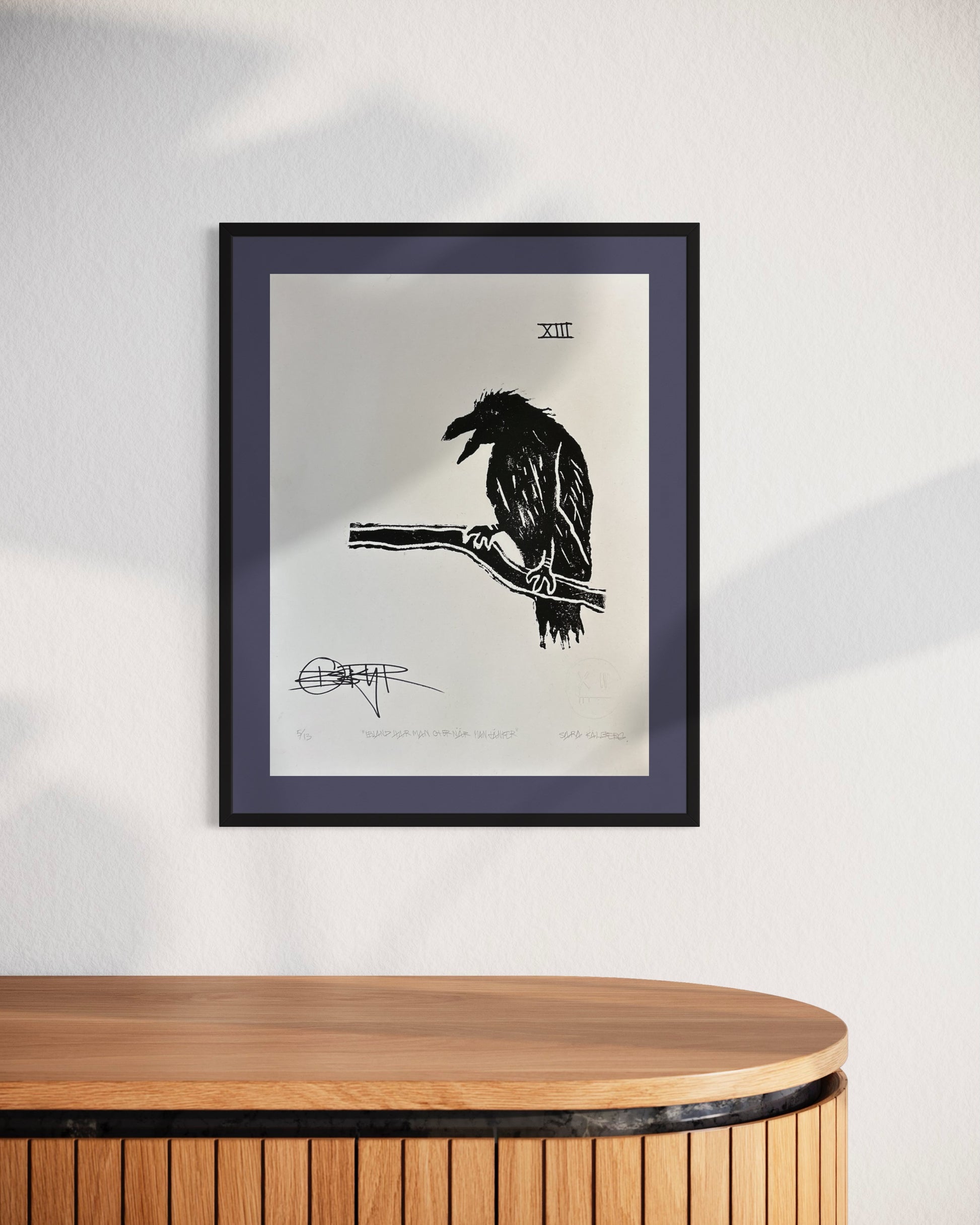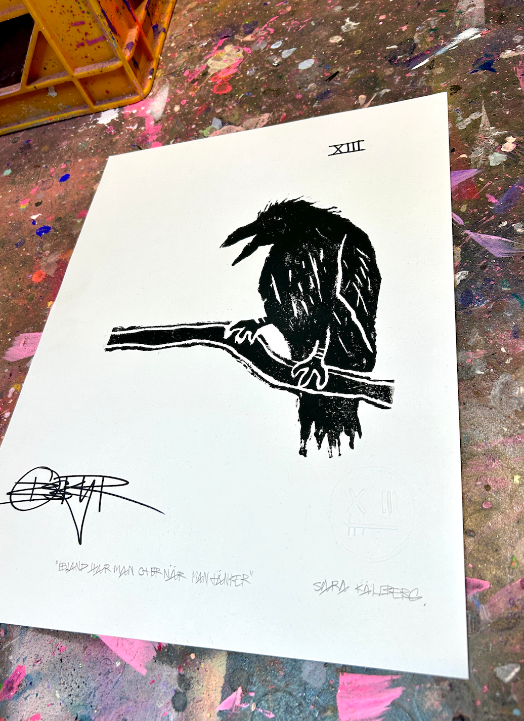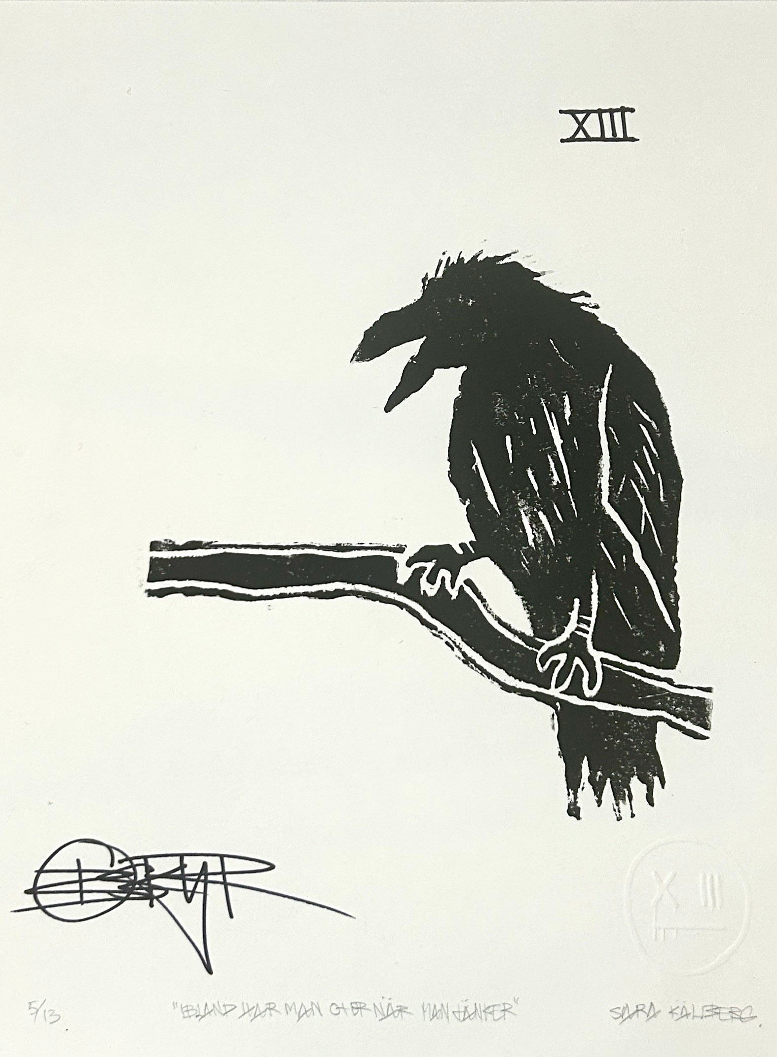 Linolium prints in limited edition. Have made a few versions of print - this version (single black raven on white paper) is limited to 13 prints. Signed, numbered and with artist stamp.
