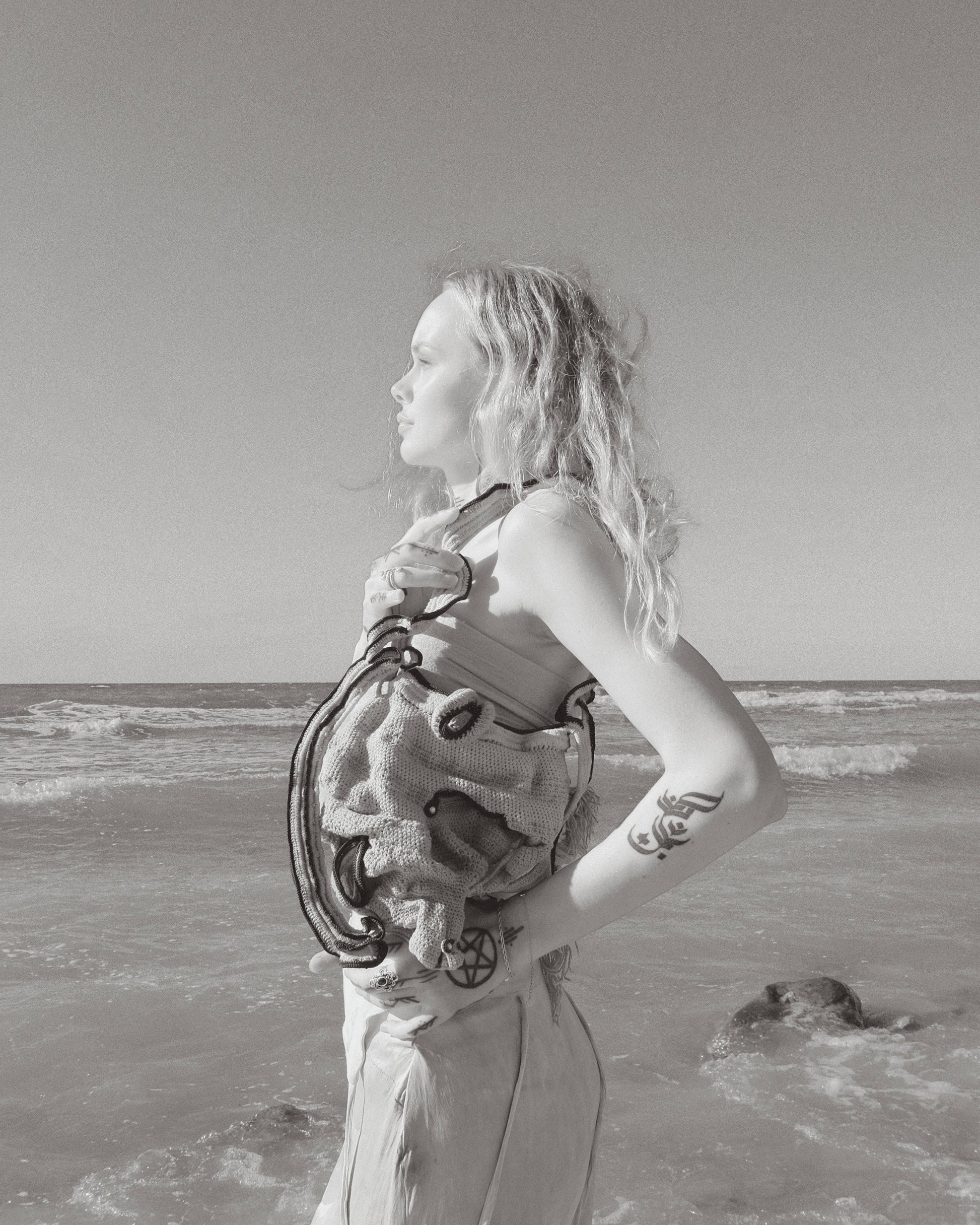 A crochet couture piece made by second hand carpet warp and waxed thread, dyed with black tea and decorated with two vintage freshwater baroque pearls. An honor to our native coastal lines, the edge between water and land, the ever changing landscape we magnetize towards to be just human and connect with our origin. A place where we, like small treasures, find traces of life beneath the surface and beyond time - fossils, dried kelp and the deep blue shells from the blue mussel - the inspiration for this bag.