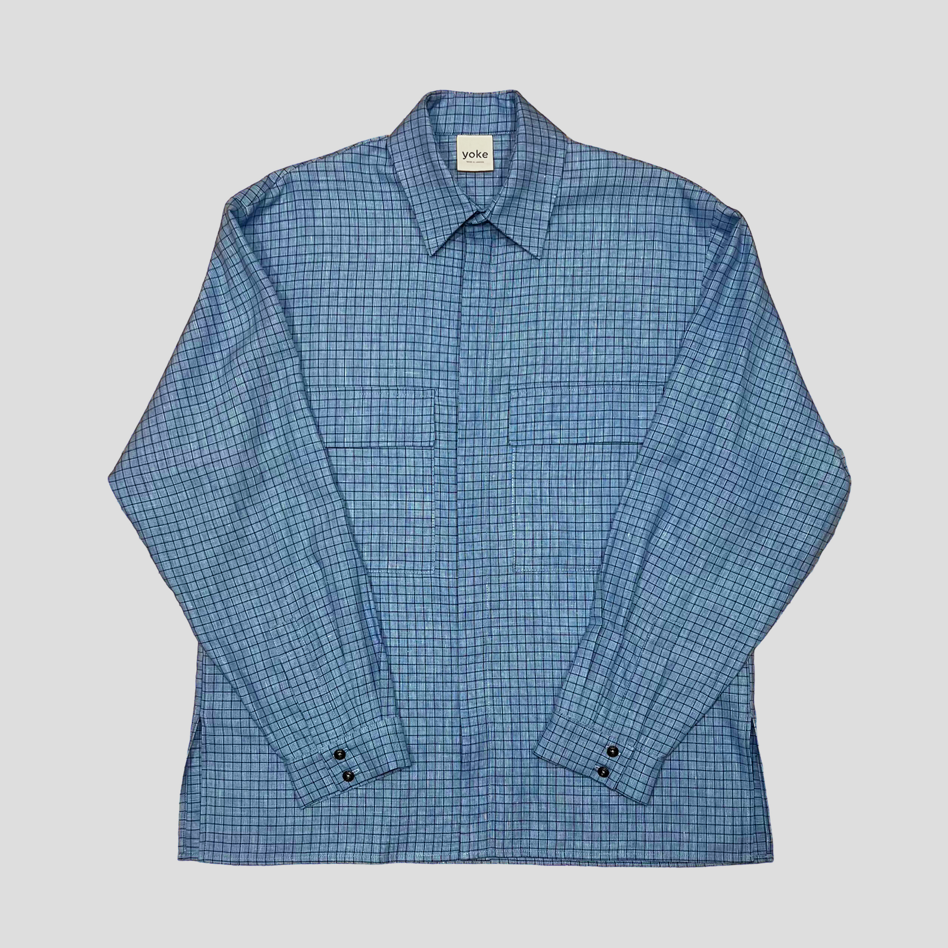 A classic blue check long sleeve shirt in a linen mix that can be worn as a shirt or a light summer jacket. It is designed to be over sized and genderless, please see here for size measurements of this garment or our visit our general size guide for further info. Chloe is seen wearing a size small shirt and 26-28 waist trousers.