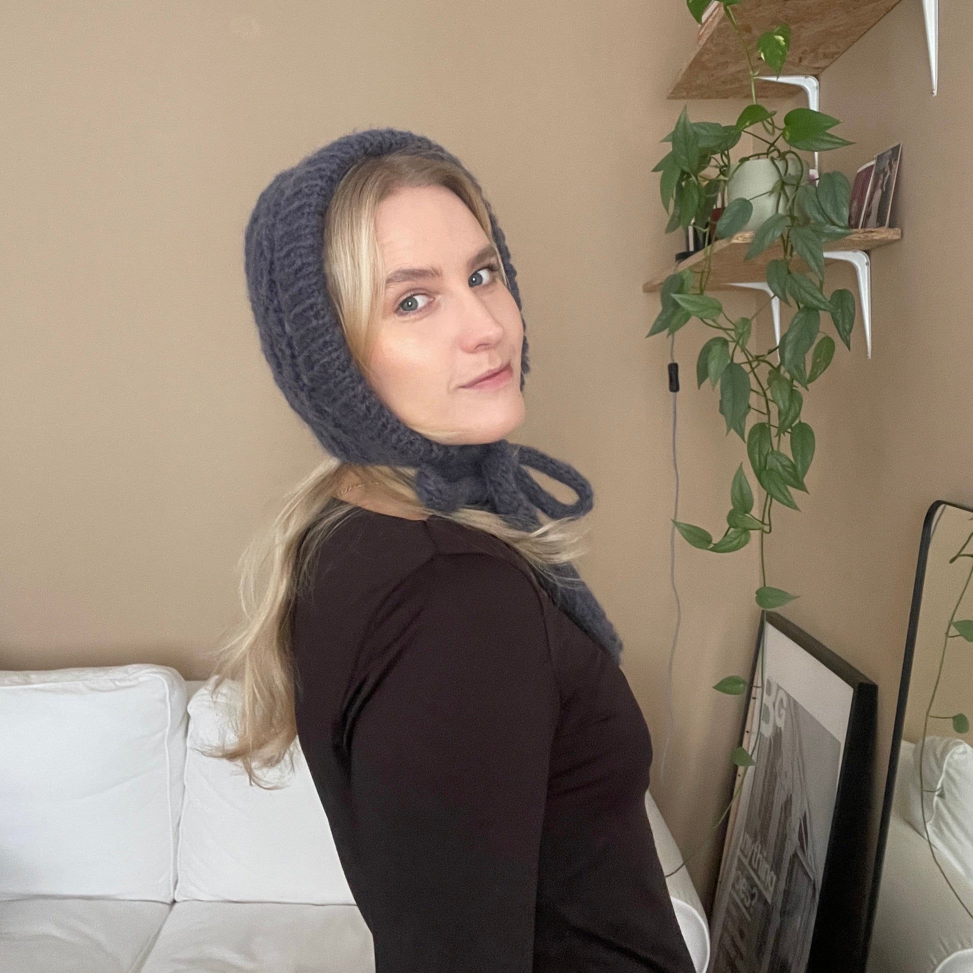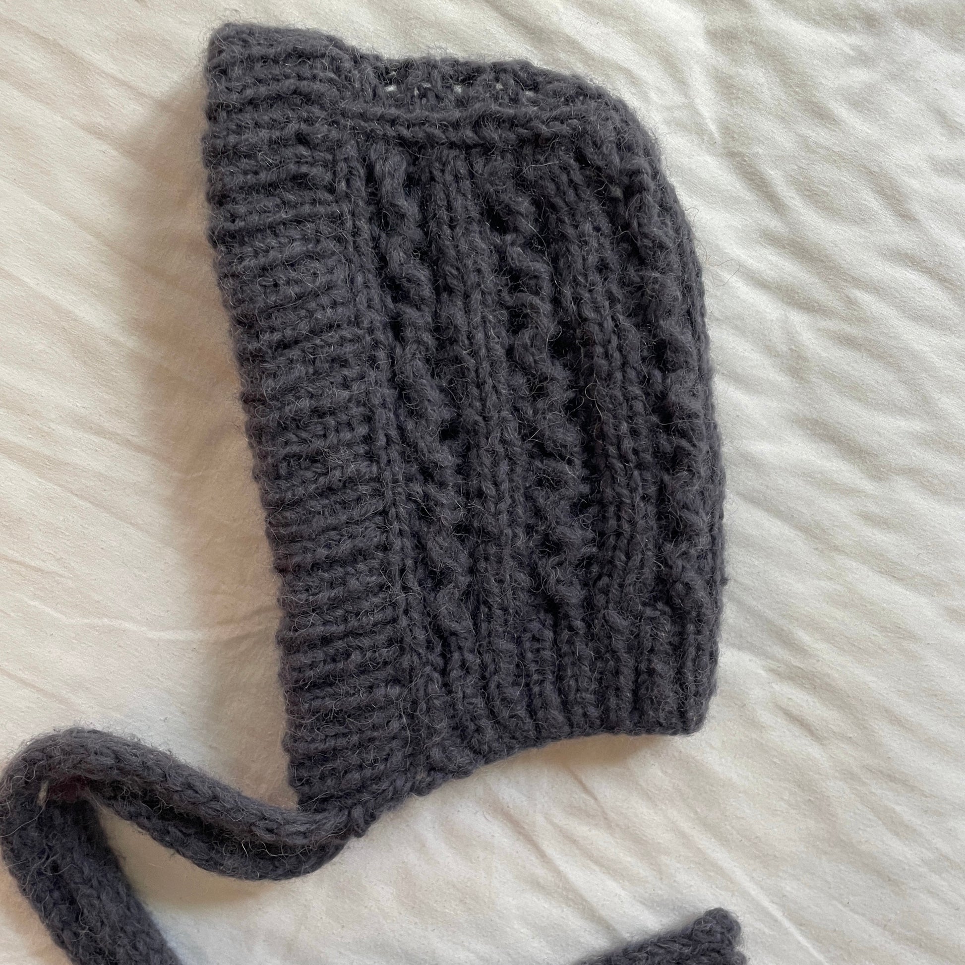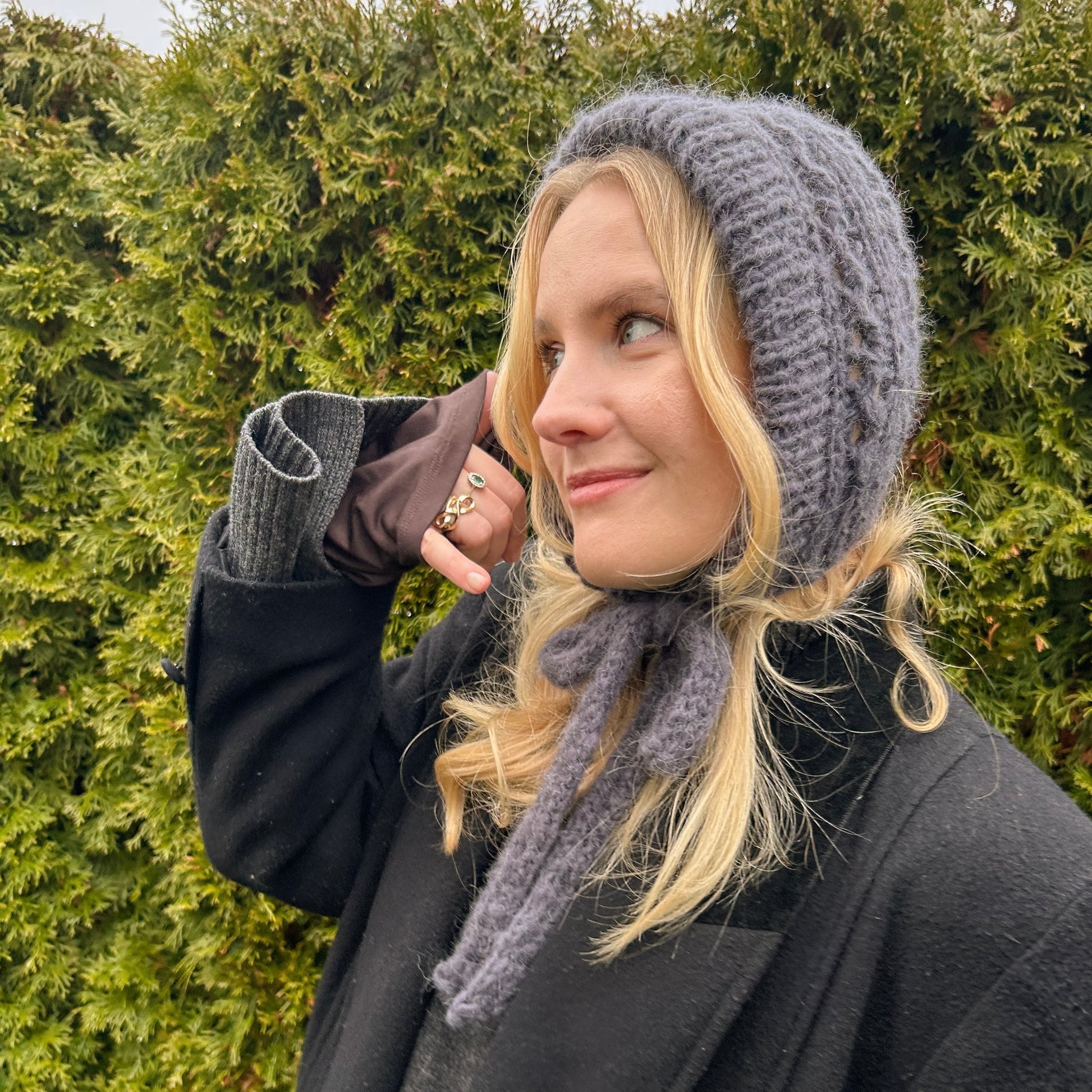 Fluffy grey knitted bonnet, handmade. Made from 30% alpaca and 70% merino wool.