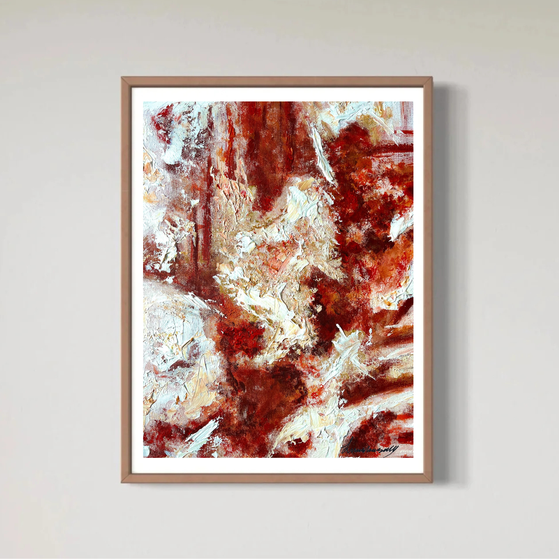 A journey through glowing shades of red and white. "Burning Hours" vibrates with energy, where the colors merge like flickering flames in constant motion. A work which capturing the heat and passion of the moment
