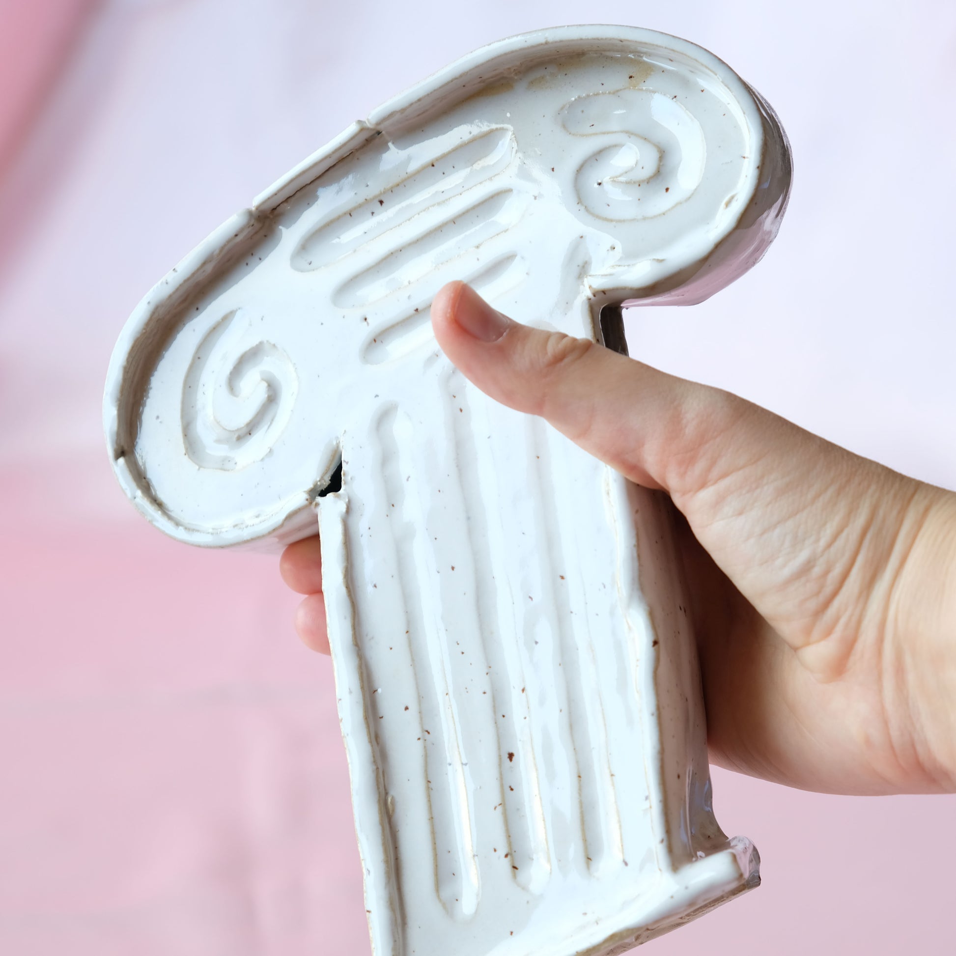 A white dotted capital from the KURSIV series, where everything leans a little. This sculpture is made of speckled stoneware and glazed with white glaze. Only available in one copy.