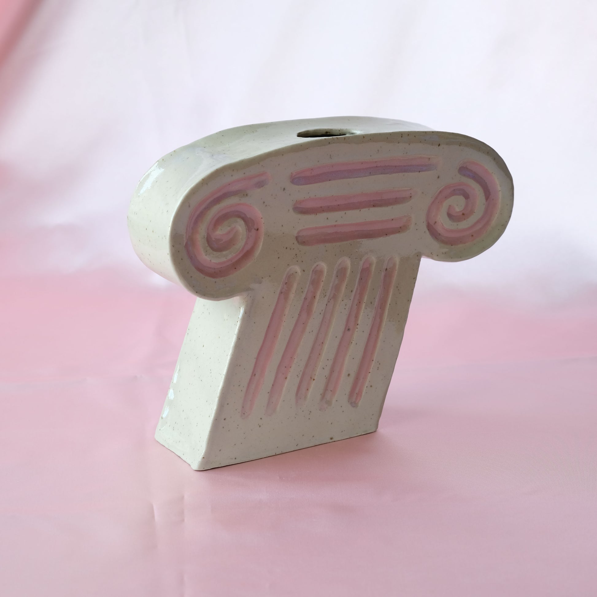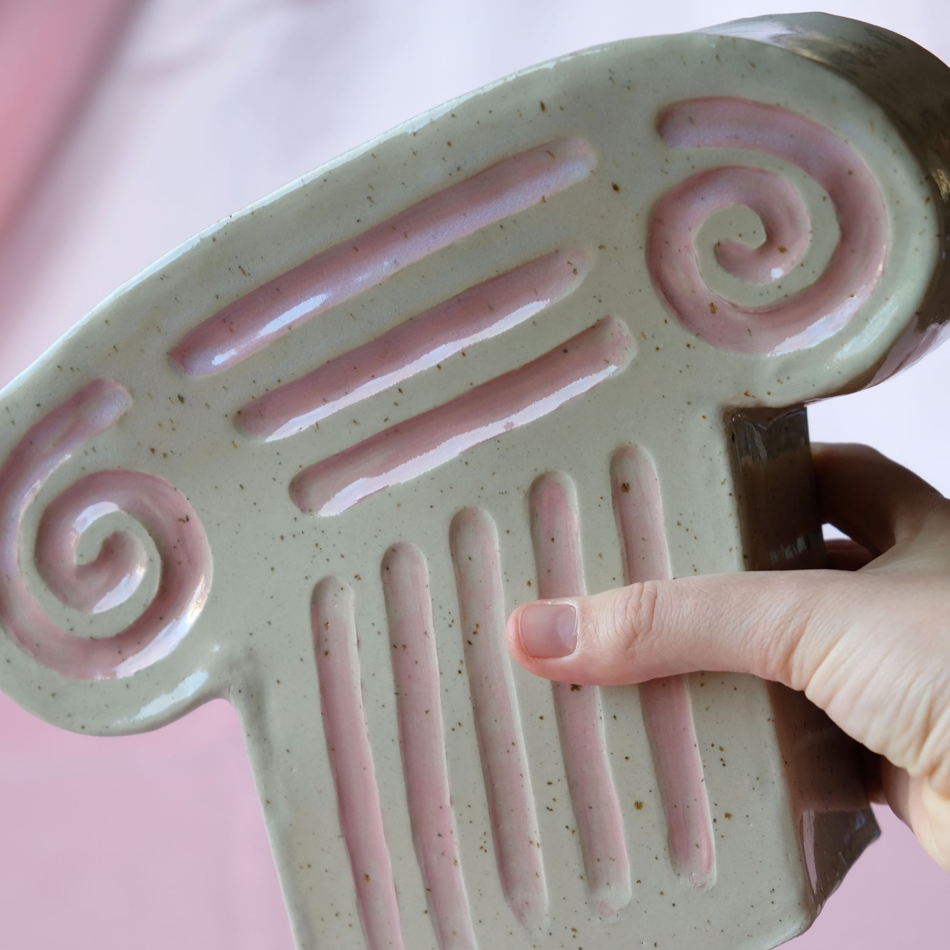 A capital from the KURSIV series, where everything leans a little to the right. This sculpture is hand-built from stoneware, painted with pink engobe and then glazed with glossy glaze. Both front and back are decoratively carved, with the front having the pink engobe color and the back being without the pink, with the carved lines. In this way, you can choose the page according to context!