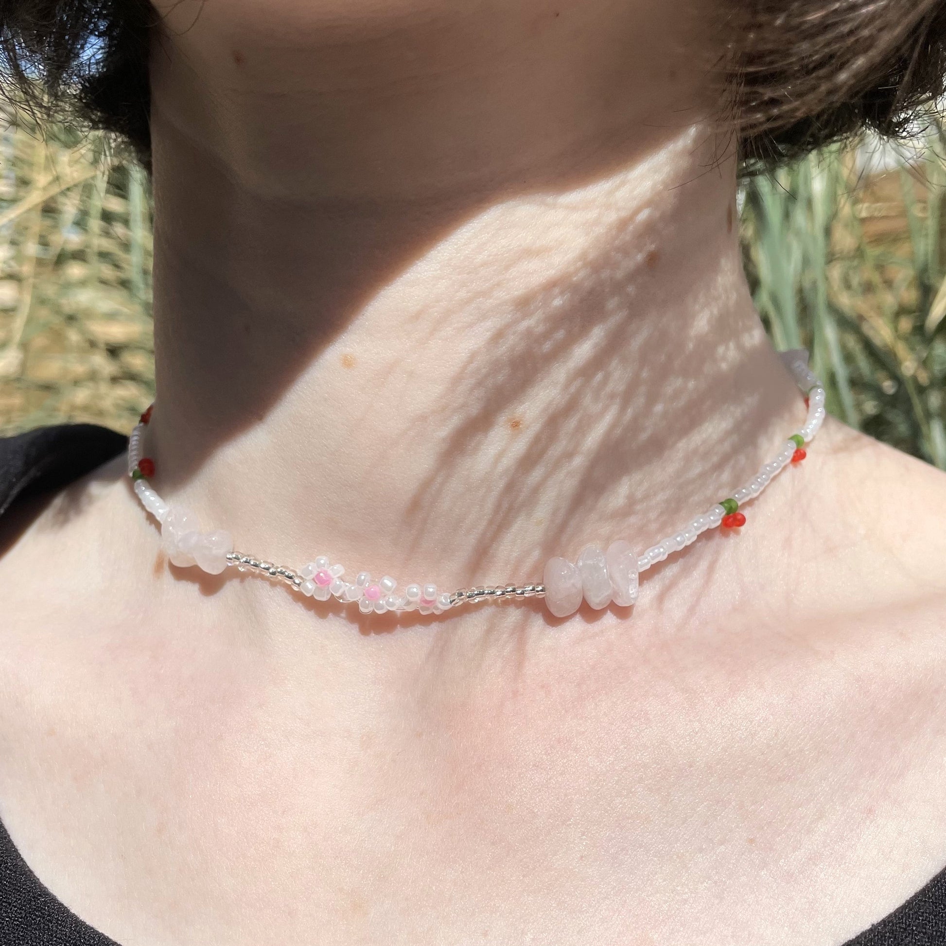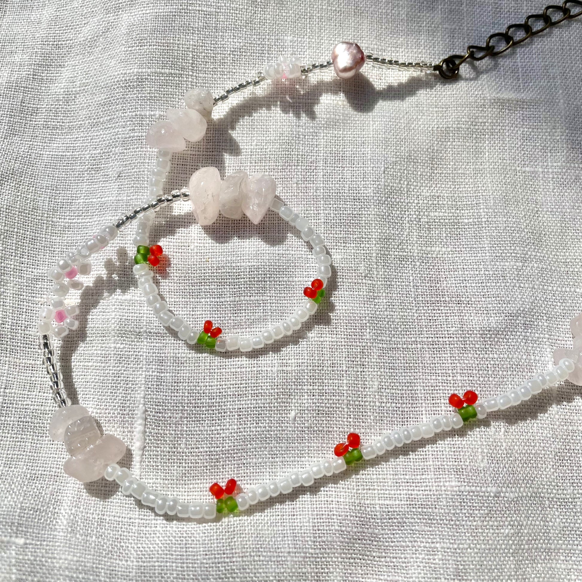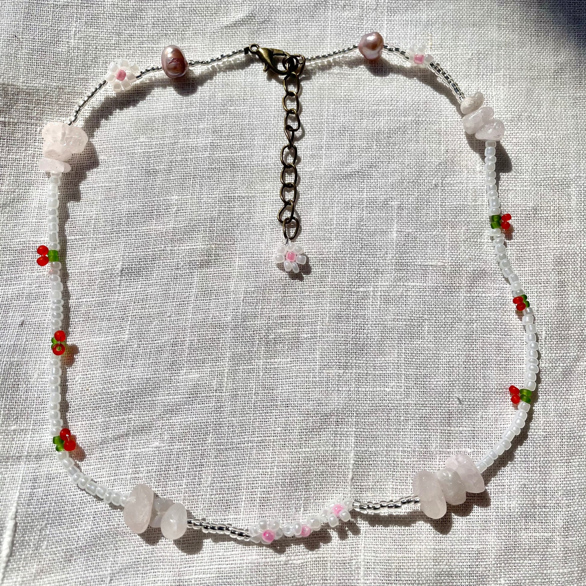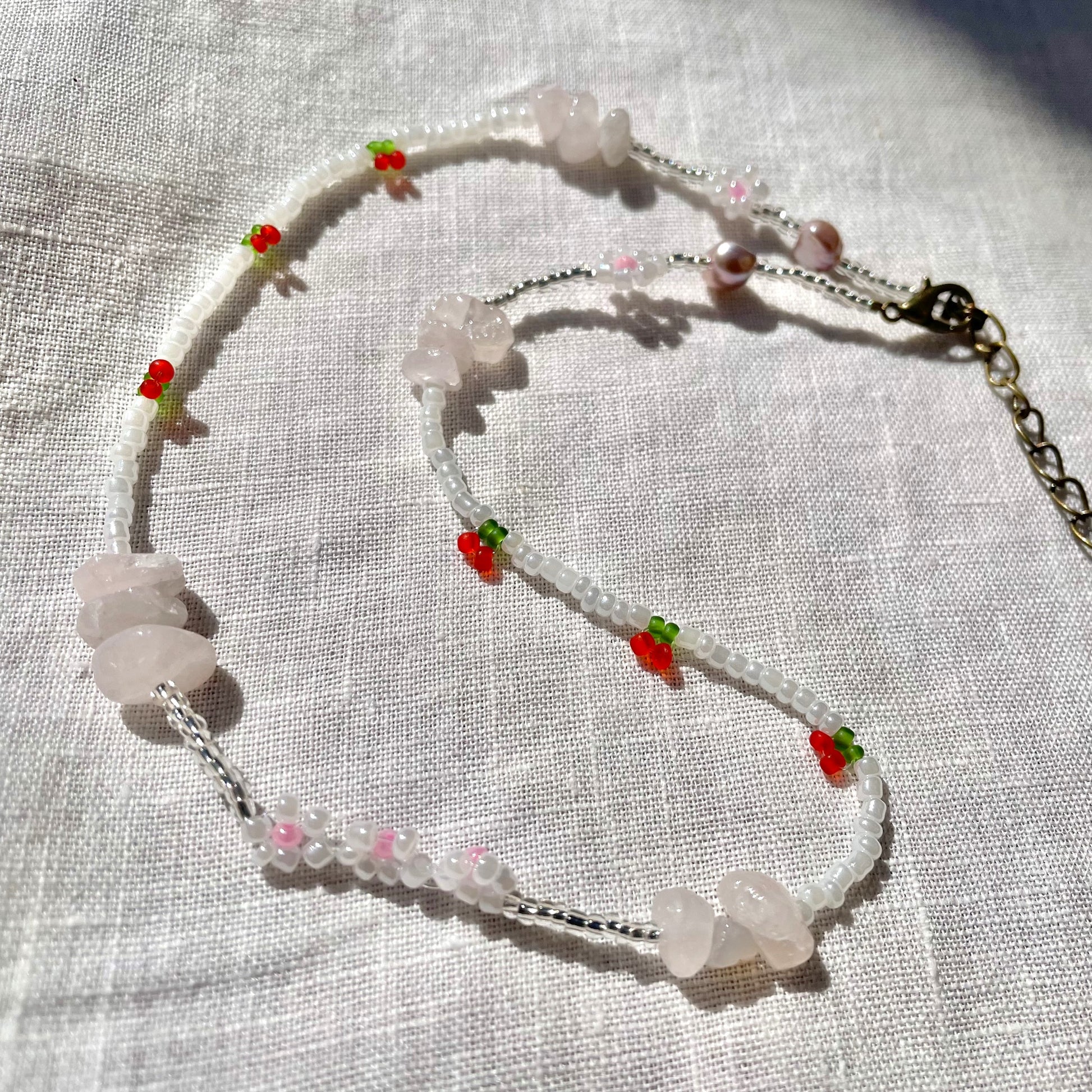 Cherry Beaded Necklace with rose quartz beads and pearls