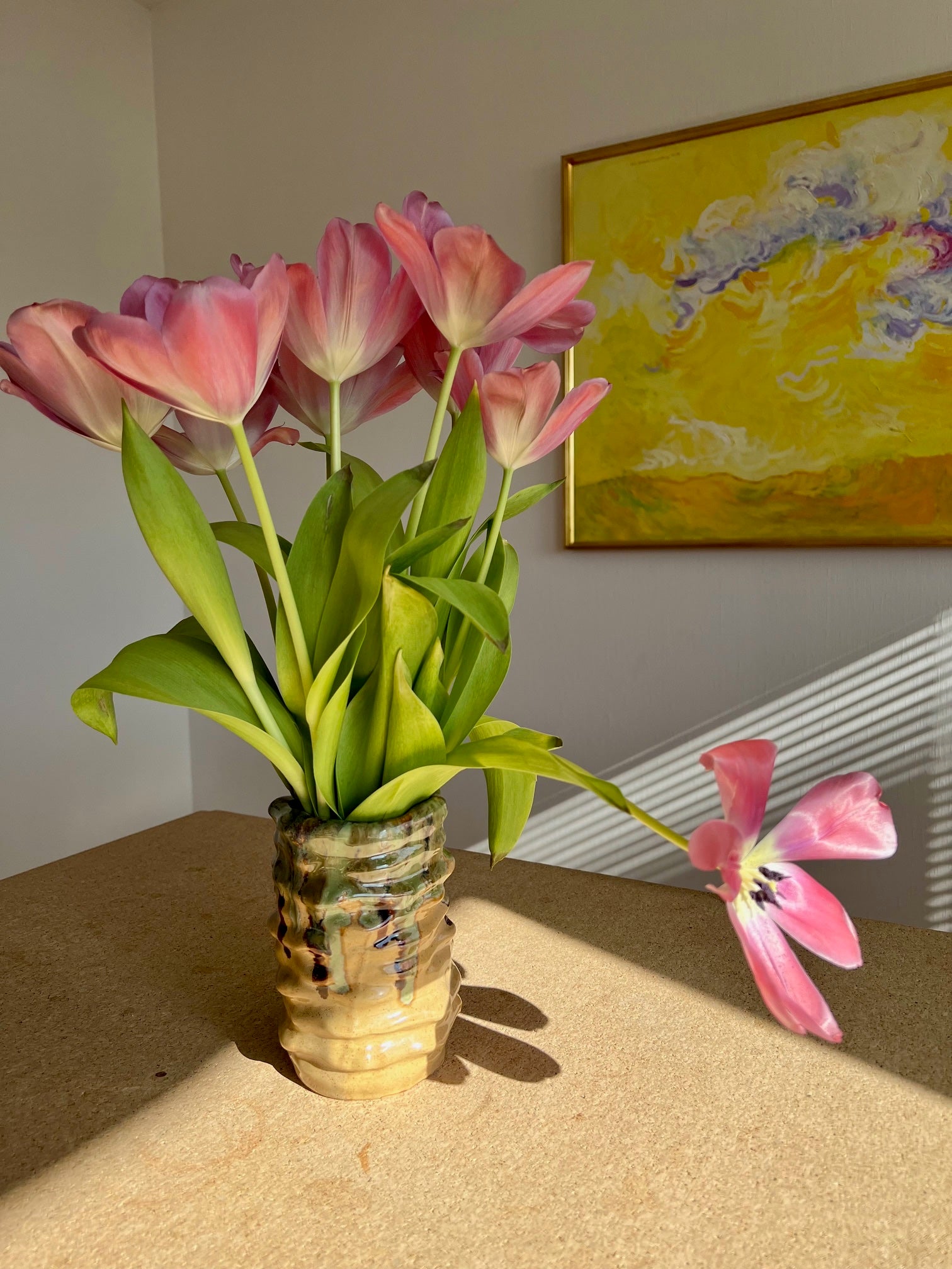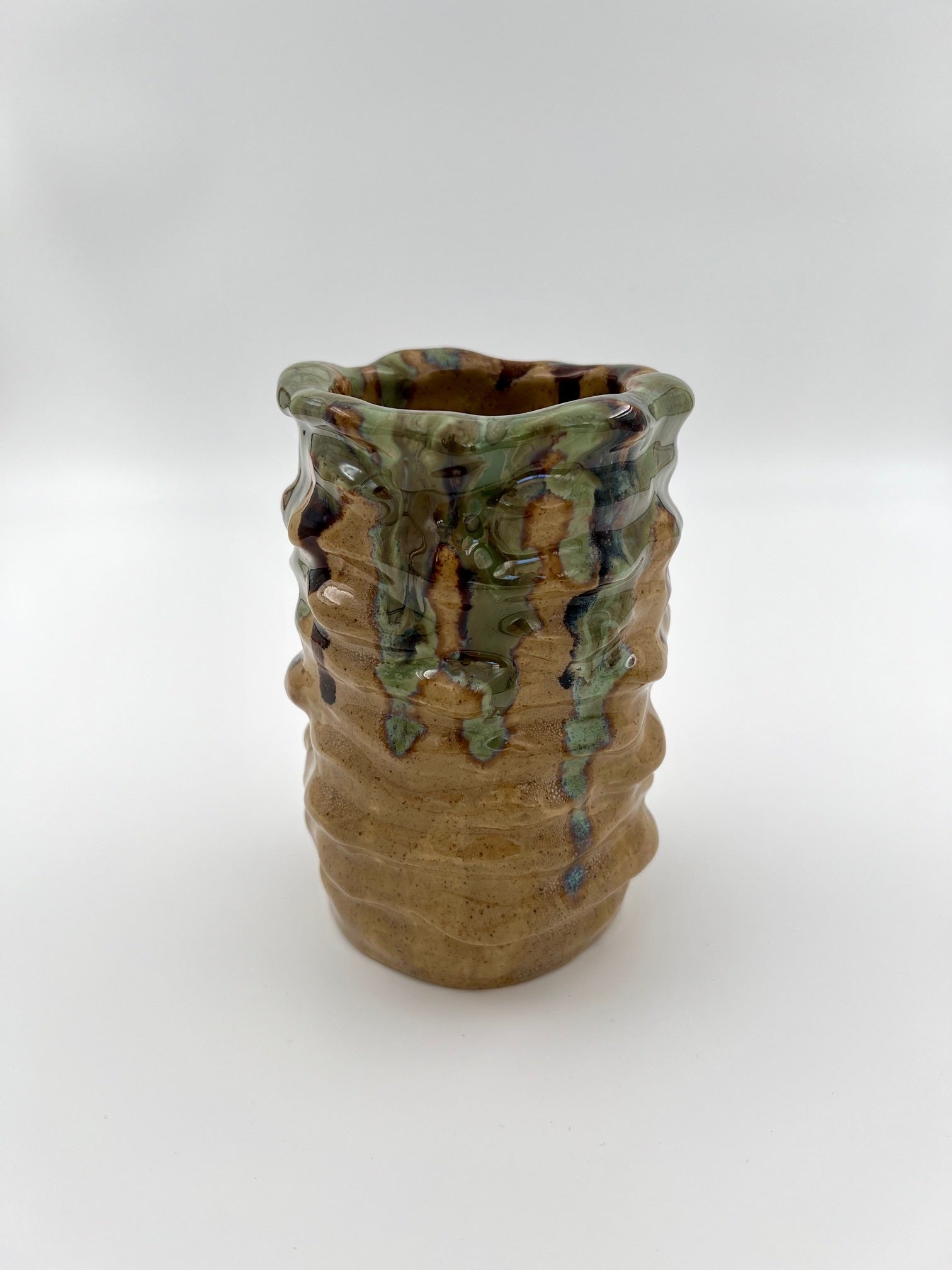 A handmade, multicolored vase in a curvy shape by the Scandinavian ceramicist Isabella Bernulf. This is a unique piece with a fun and stylish look!
