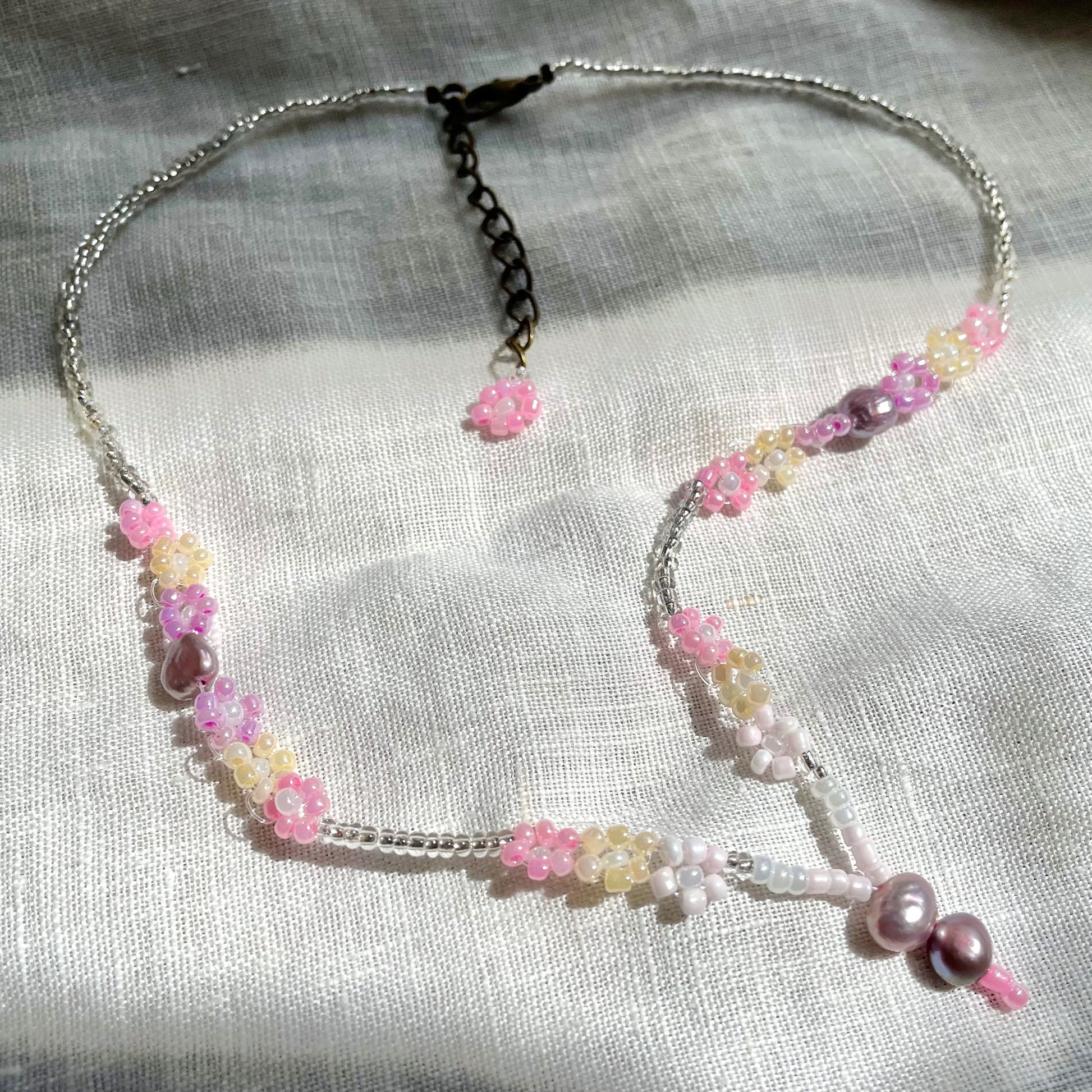 A handmade beaded necklace featuring daisy flowers and lilac pearls is crafted with love and care. Inspired by 90s aesthetics, it is designed to evoke nice and gentle emotions.