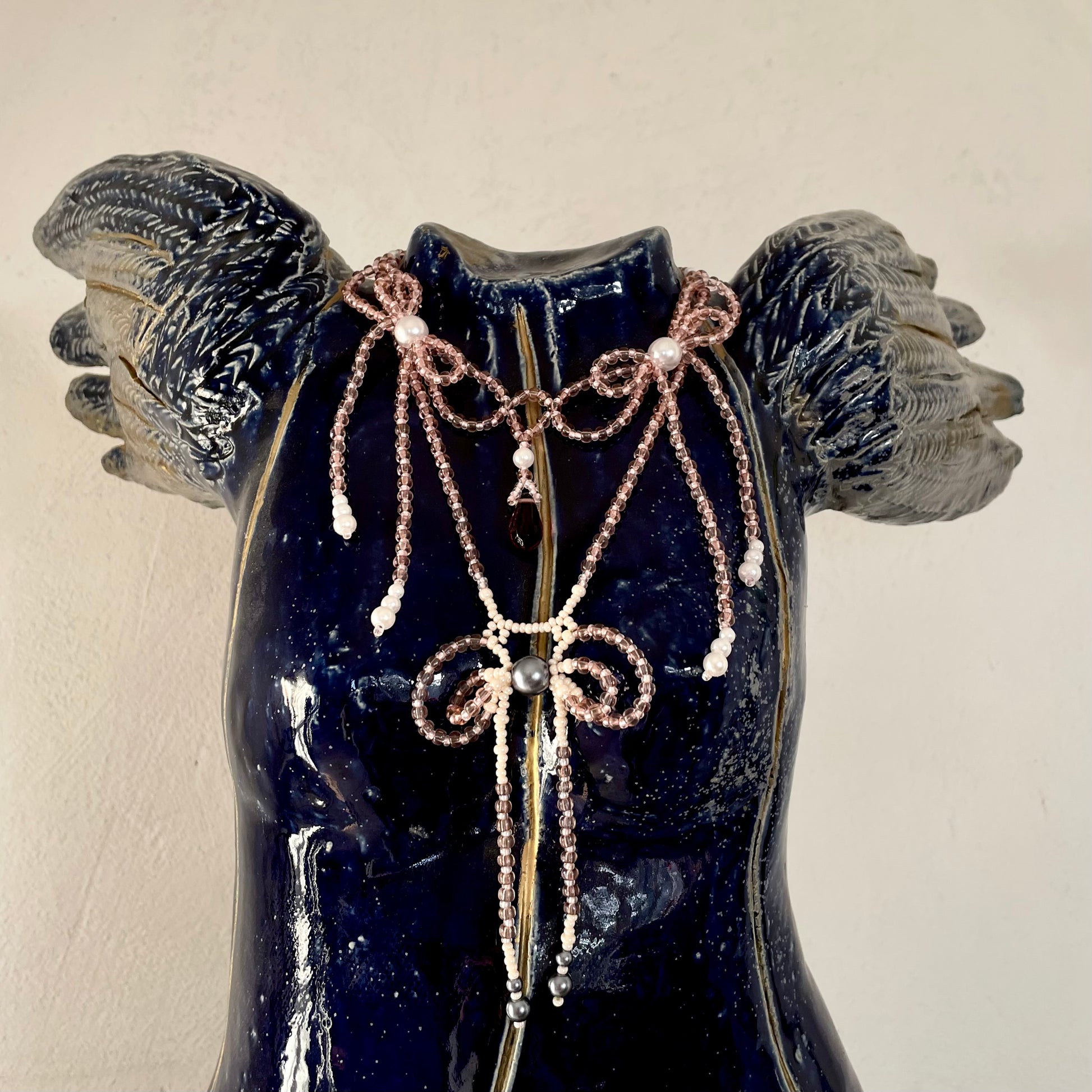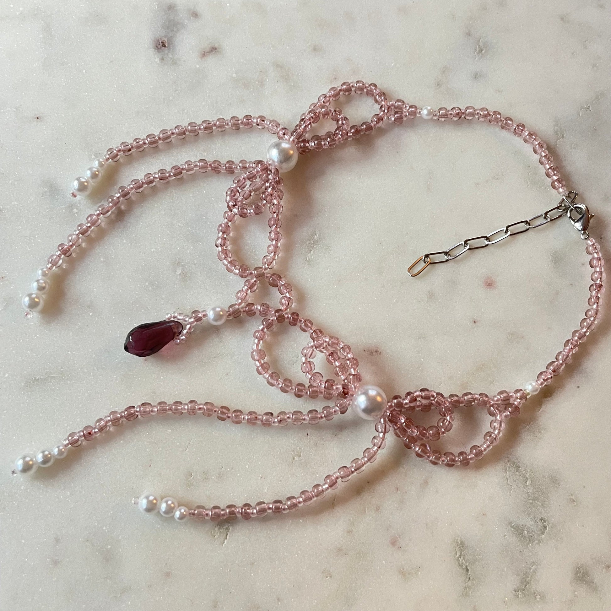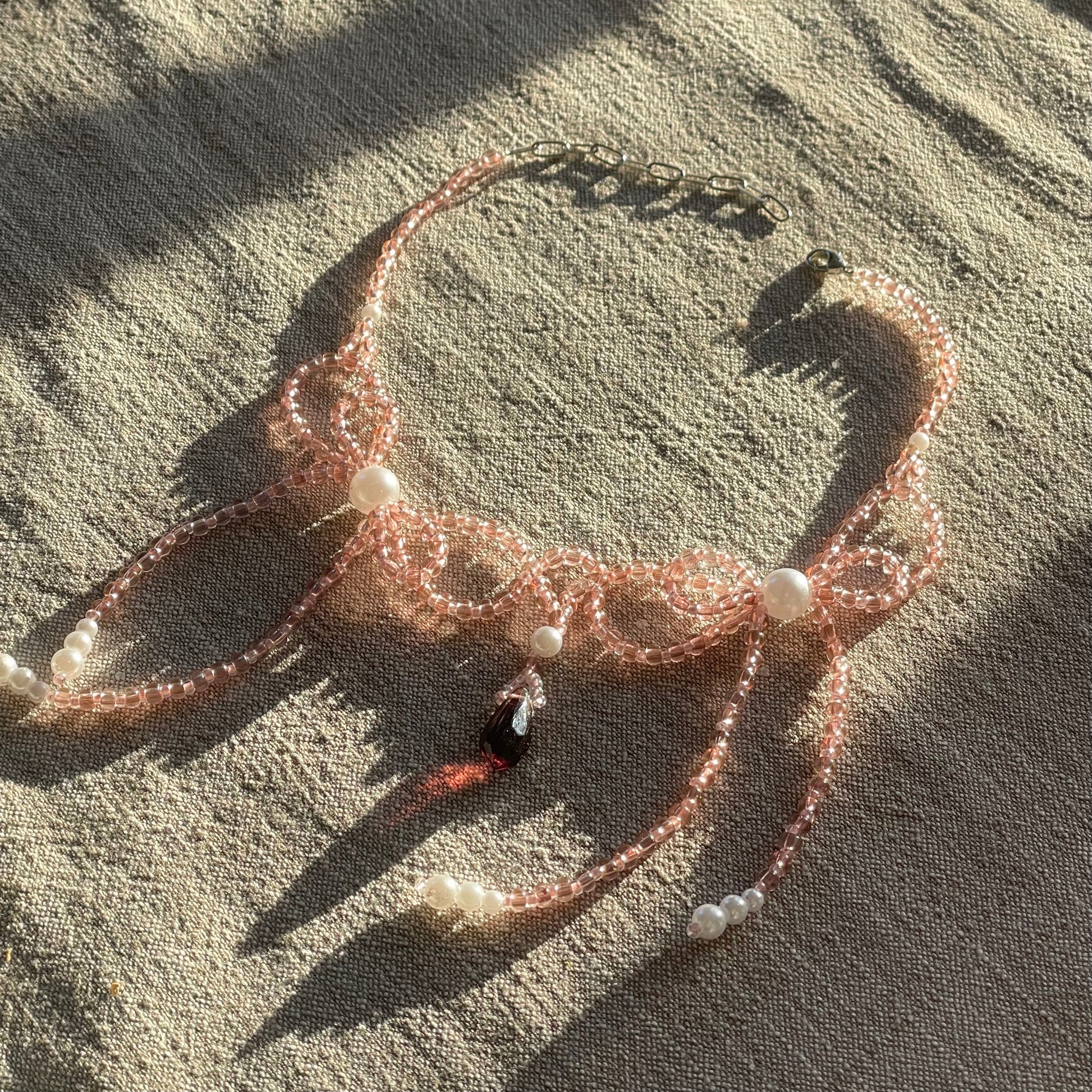"The bow necklace" is a beaded necklace of hand-picked, high-quality glass beads. Pearling is a creative process which means that each necklace gets its own character and that a necklace is rarely recreated.