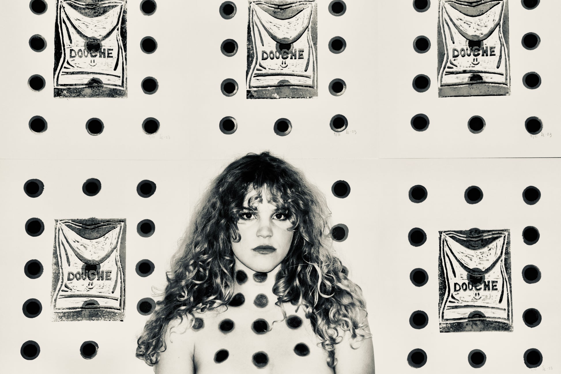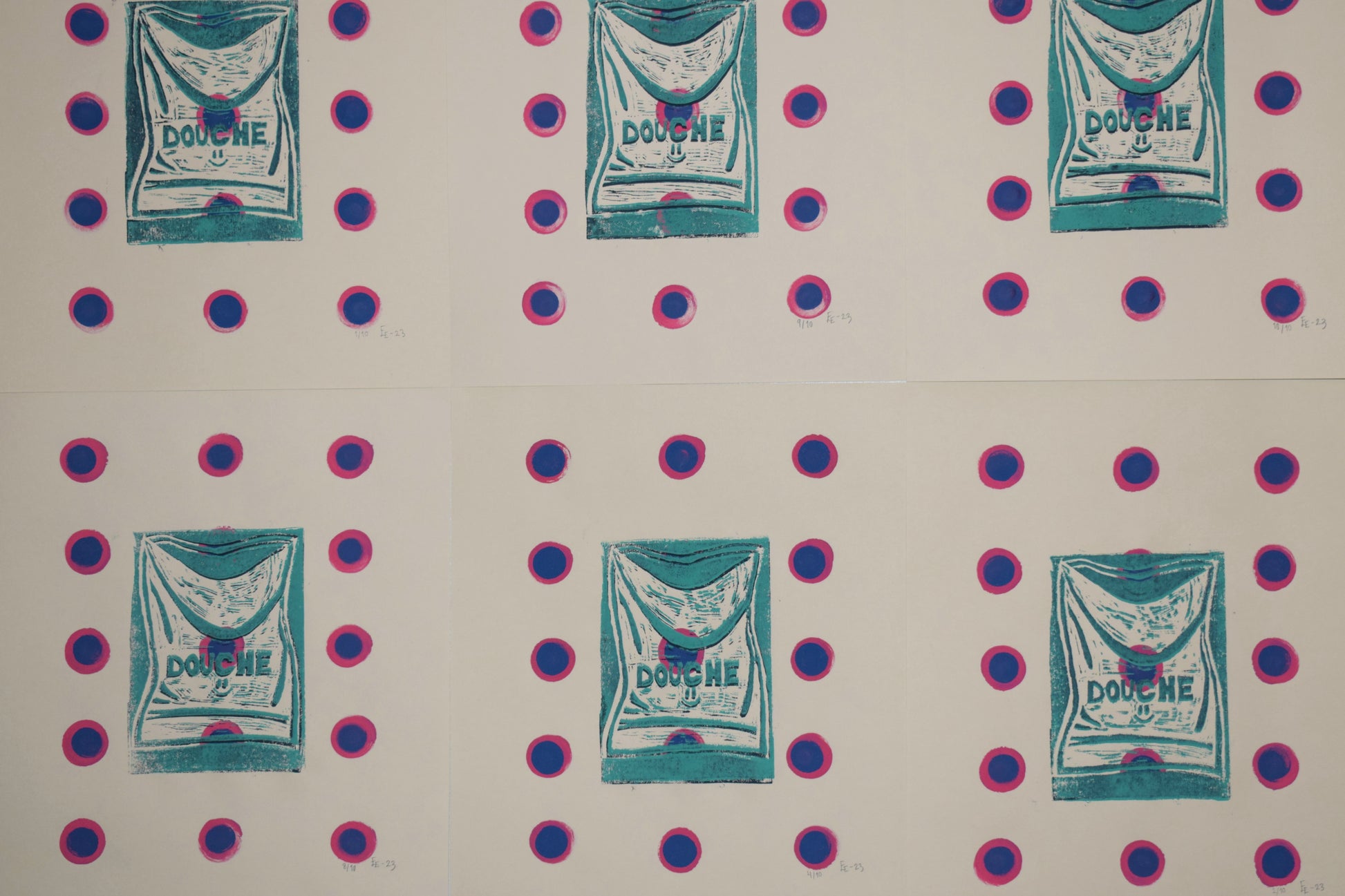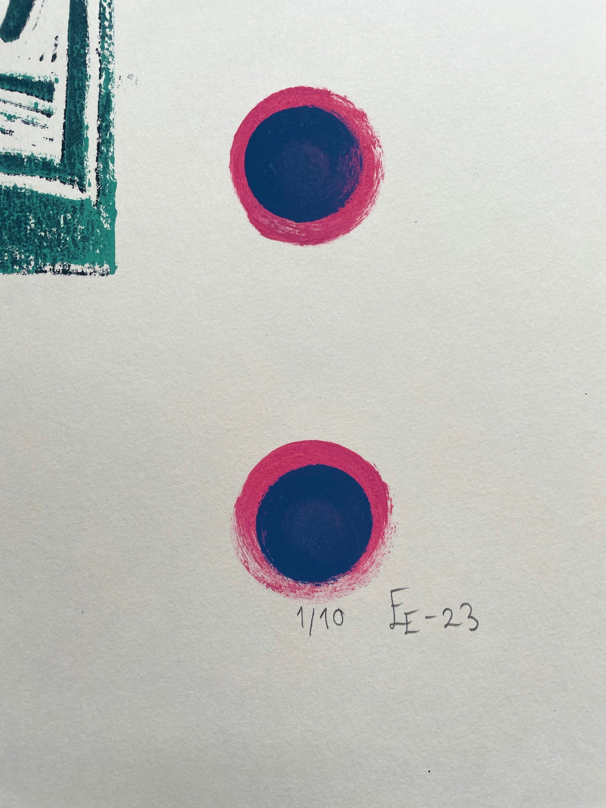 This is an imaginative and minimalistic print of different colorful shapes on a white background. "Douchebag circle" is the artist Elvira Elliot's unique, handmade artwork!