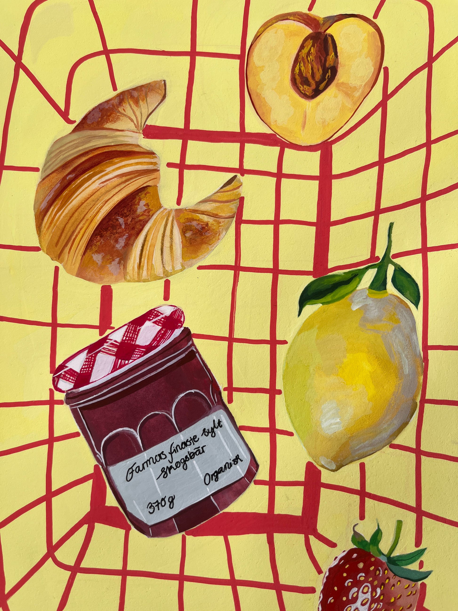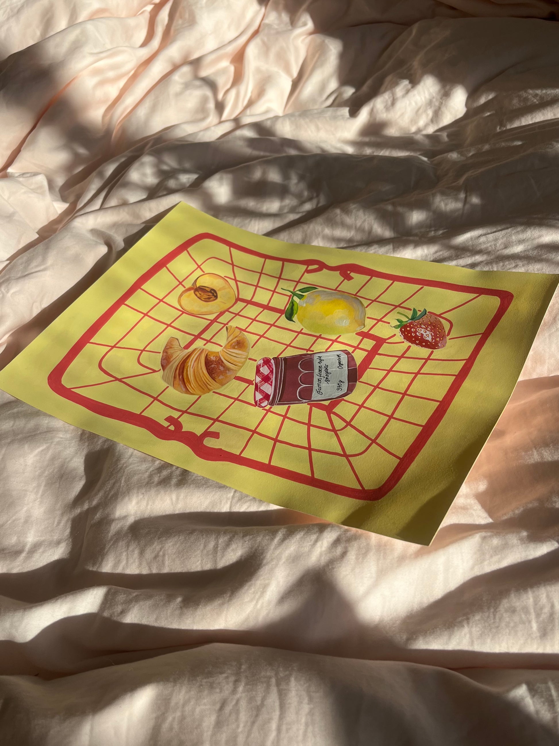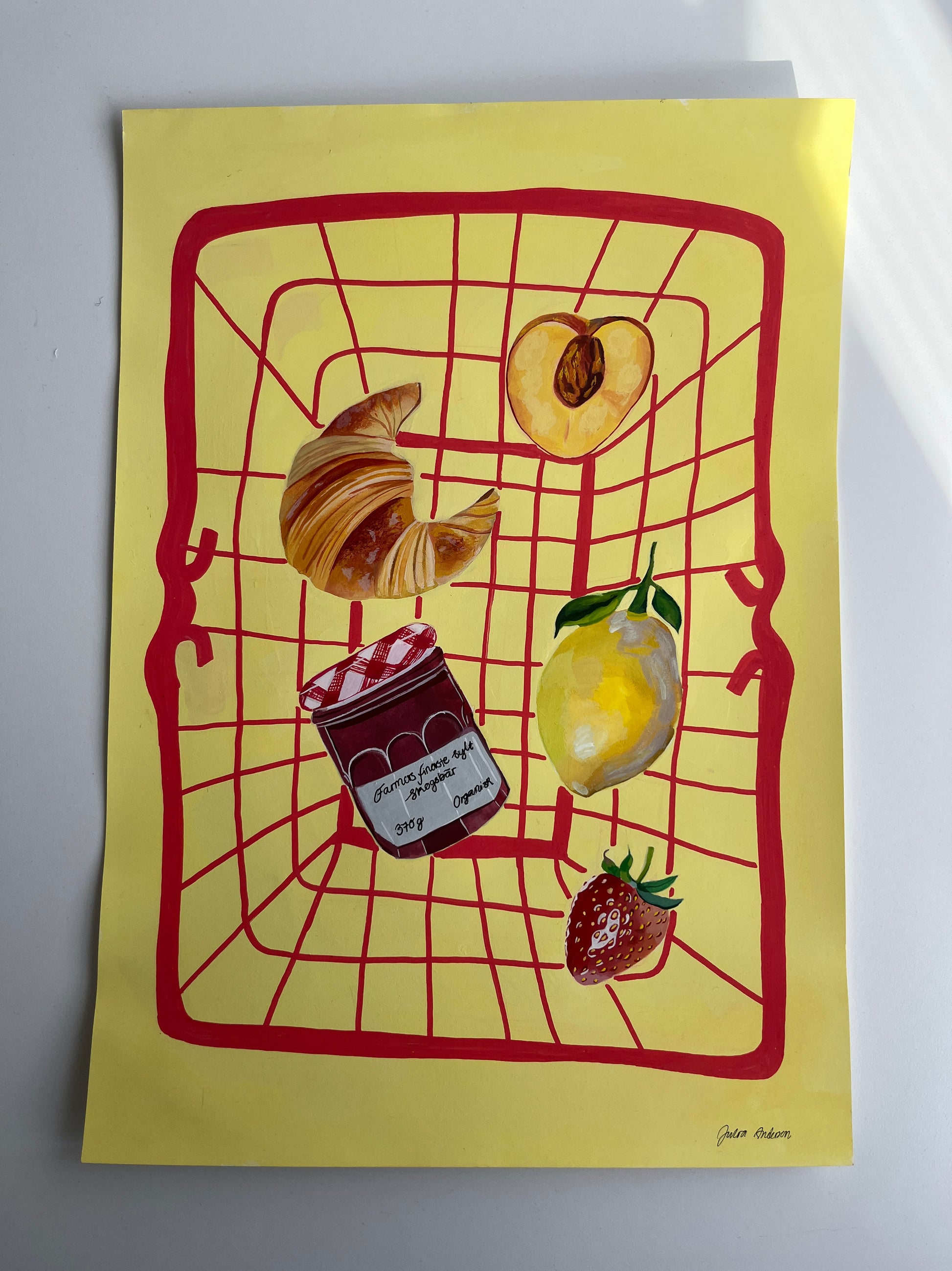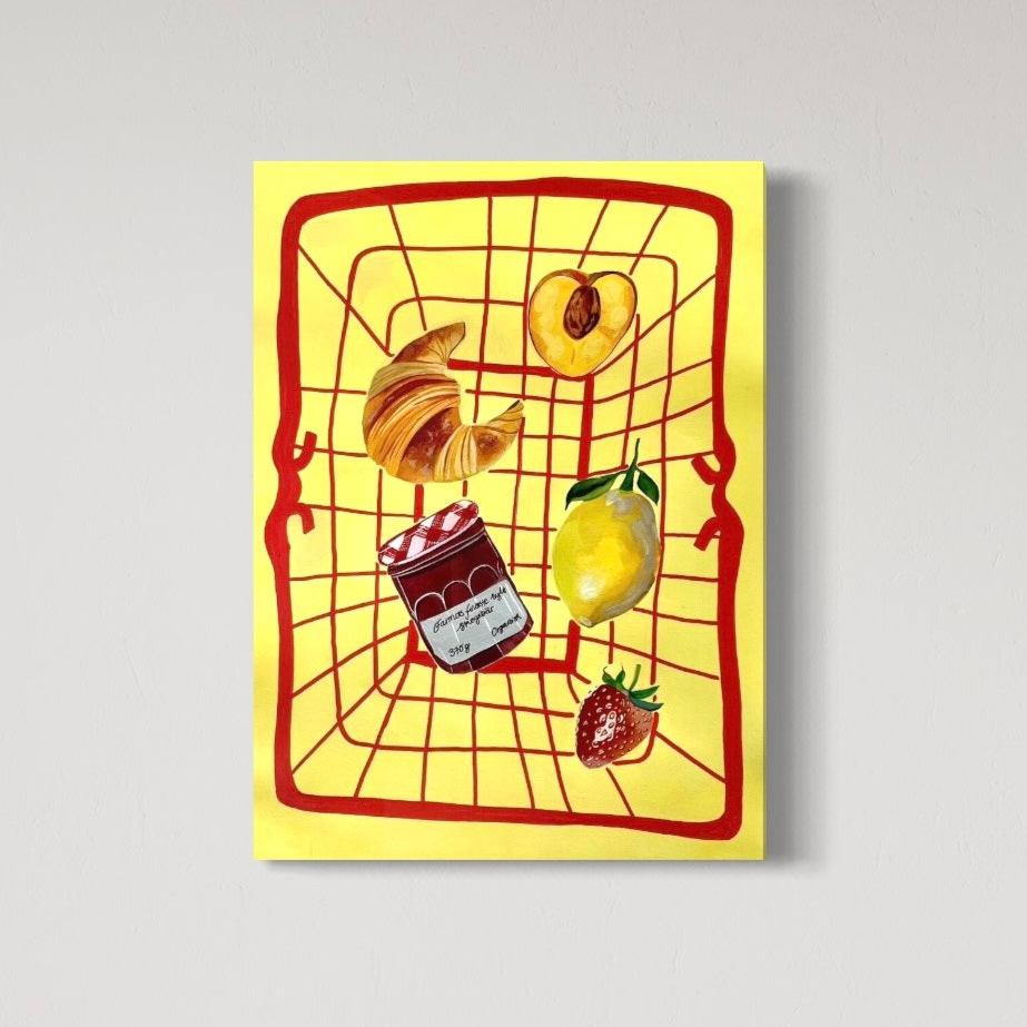 Picturing a basket of different fruits and foods, this colorful artwork by Julia Andersen makes your living space more joyful and unique! It's a one-of-a-kind painting that's perfect for the Scandinavian styled home.