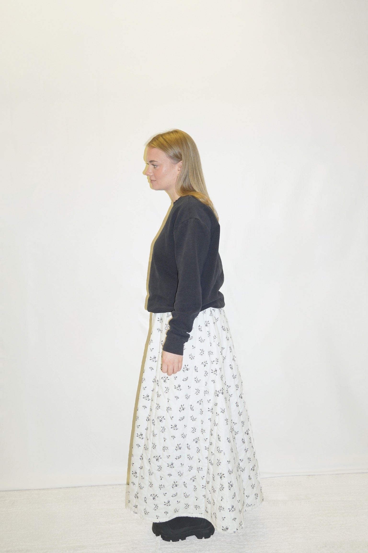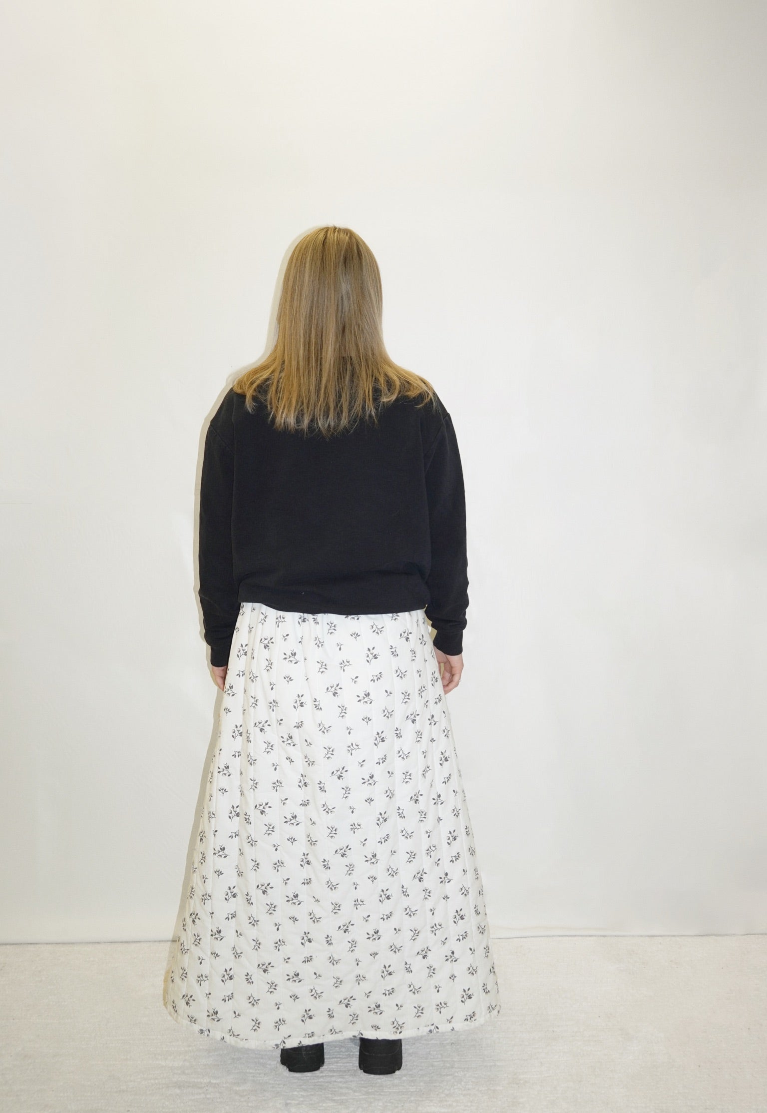 A limited edition quilted skirt with band edging at the hem, created from a floral bedspread. A full skirt with an elastic waistband that makes it comfortable and easy to move in. Perfect on its own for both everyday wear and special occasions, or worn over your pants for added warmth. Pair it with the Floral Edith vest for a complete look, or style it with any top of your choice.