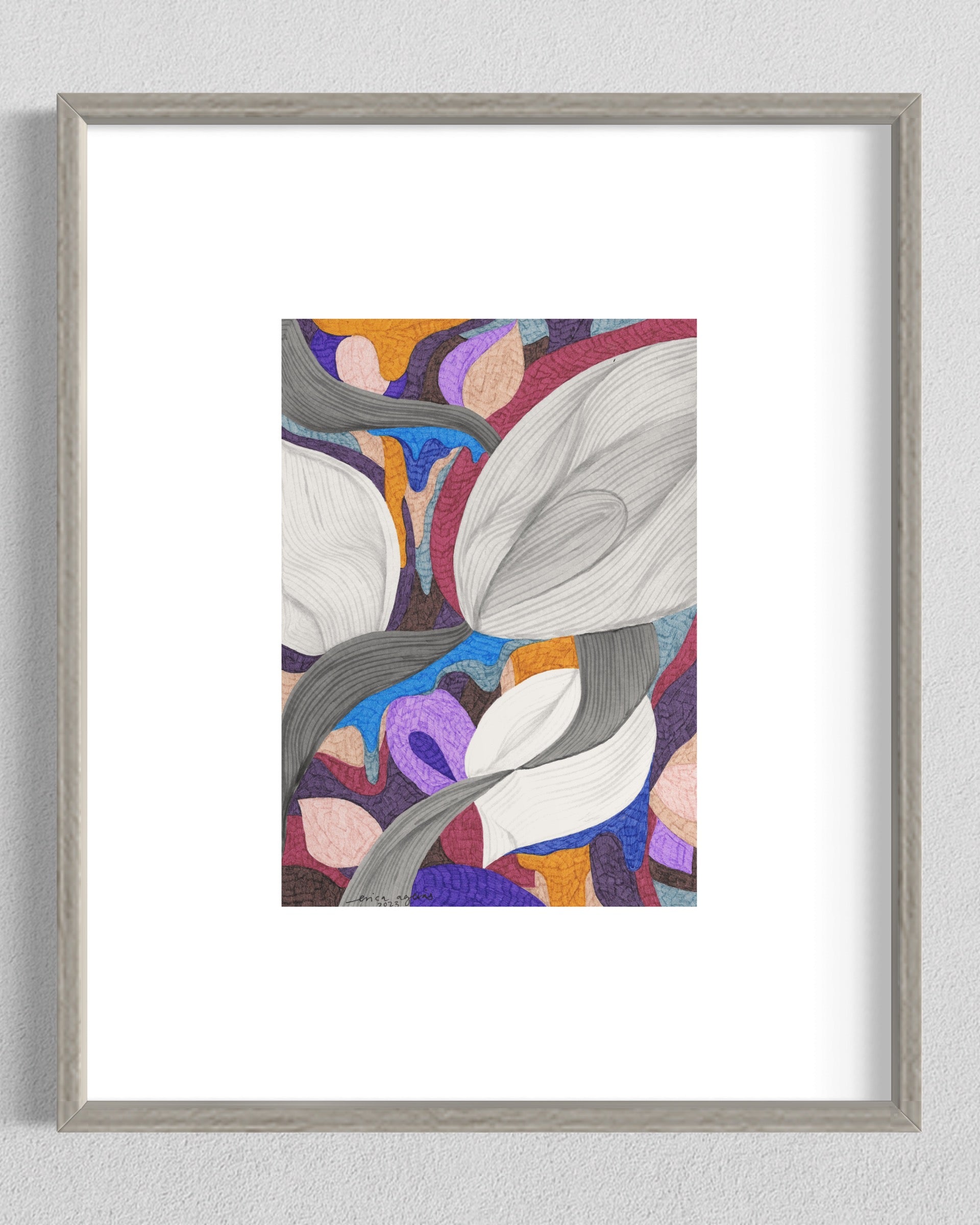 Framed in a light gray wooden frame with real glass, the artwork is presented on high-quality paper with a wide white passepartout for a clean, gallery-like look.