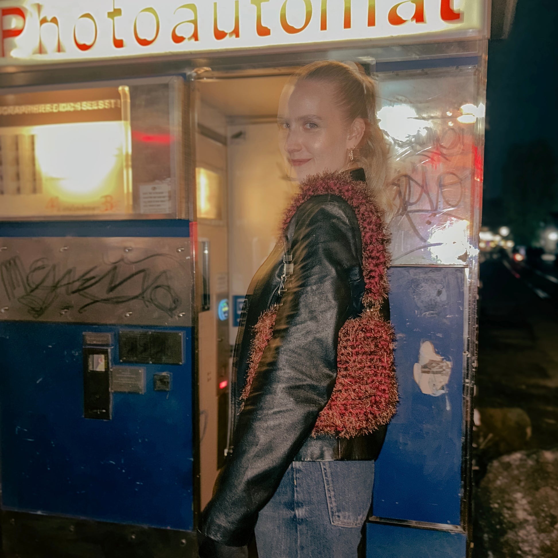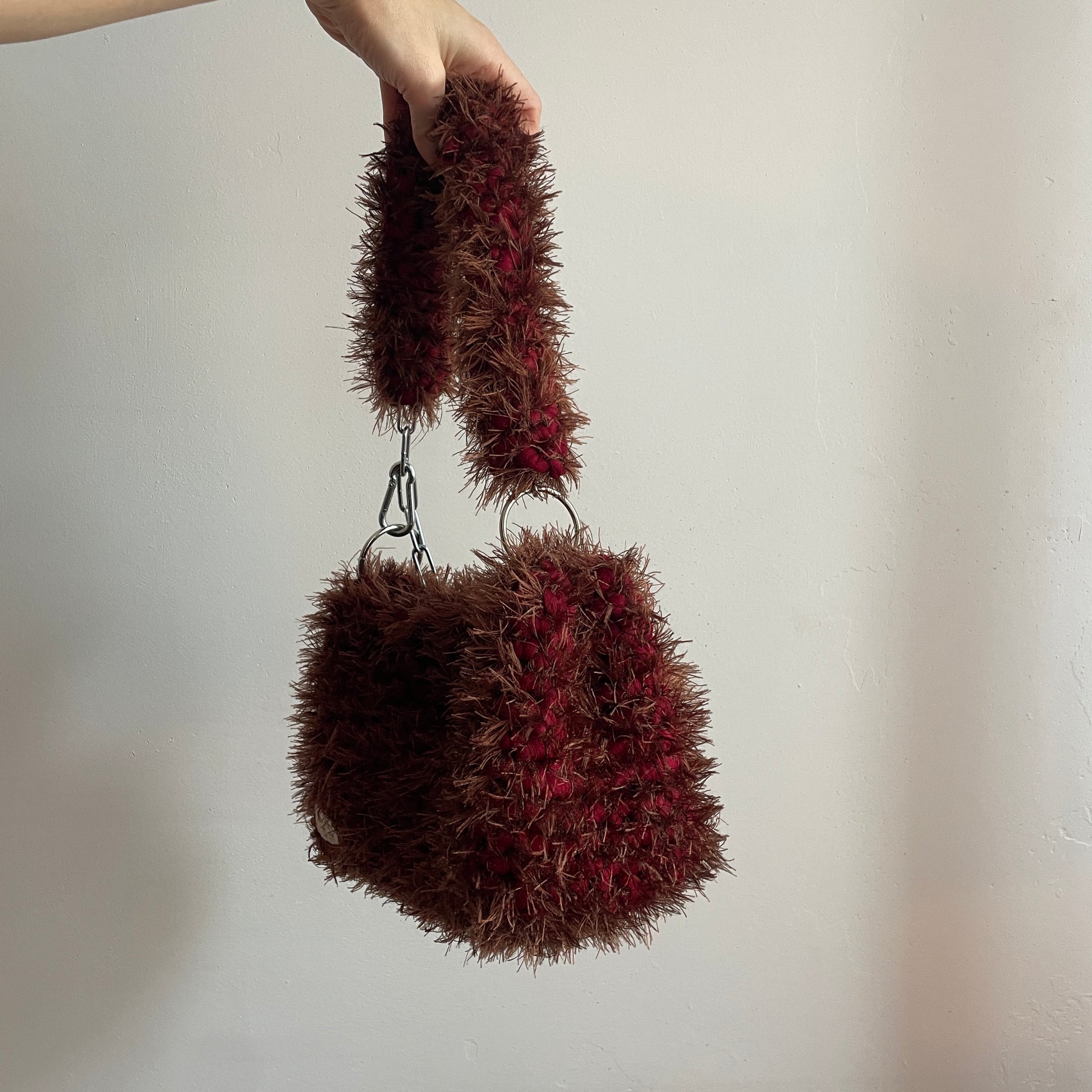 Fluffy burgundy crochet bag JOE in size medium. This burgundy handmade crochet bag can be worn with or without the handle cover and has an adjustable-length chain handle. Made from 90% recycled textile yarn, and 10% polyester yarn. Magnetic clip closure.