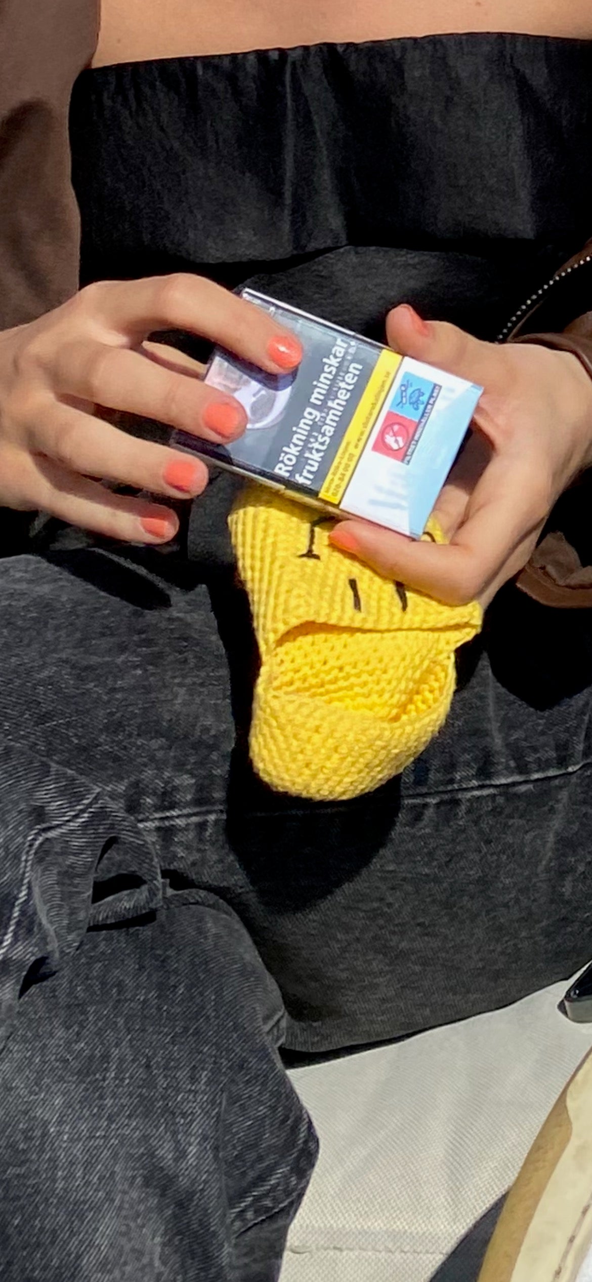A one-of-a-kind, handmade crochet case / folder for your cigarette package, or for something else in a rectangular shape. It's a unique accessory in a yellow color with a smiley motif. This item is exclusively made to order by the talented Lydia Lindwall.