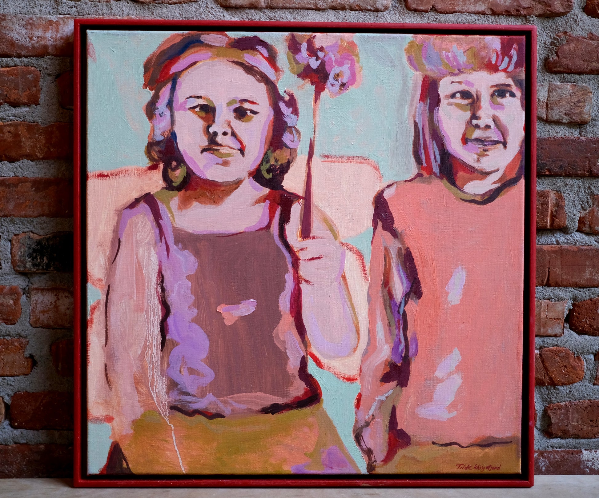 A pink-toned oil painting. A kind fairy overheard my wish—I found a friend for life! This decorative piece is perfect for a children's room, bringing back childhood memories filled with joy, giggles, and magic.