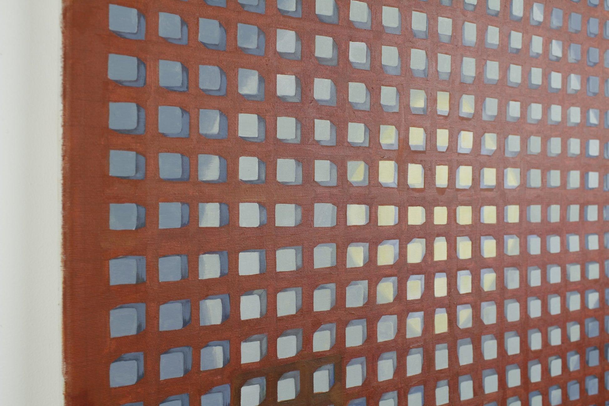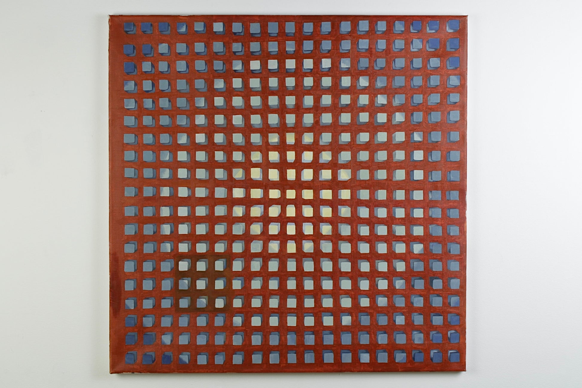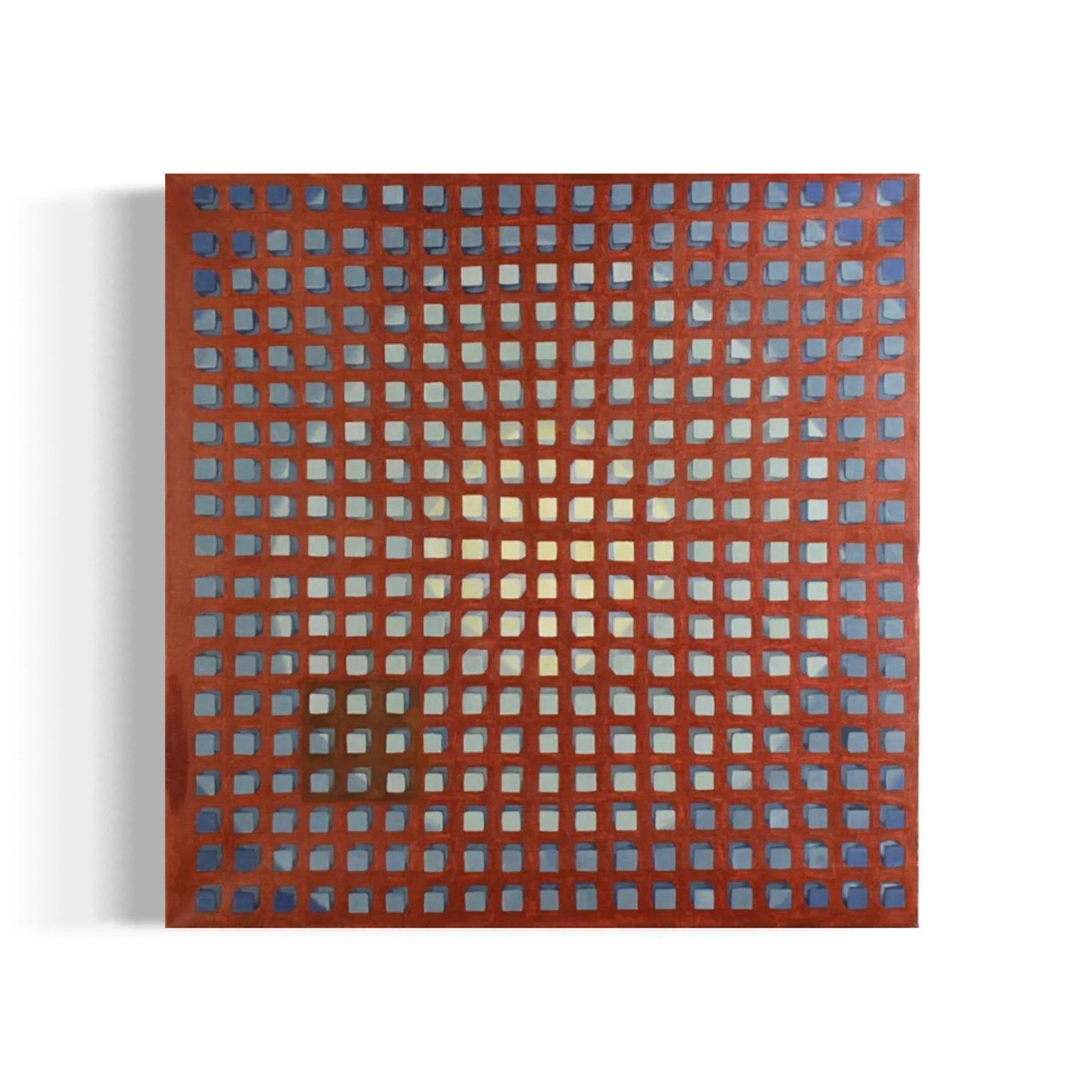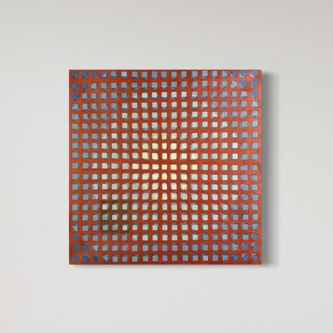 "Fyrkantigt" by Elvira Elliot is an abstract painting of squares in different colors that forms a unique pattern. This stylish artwork plays with light and shapes in a fun way.