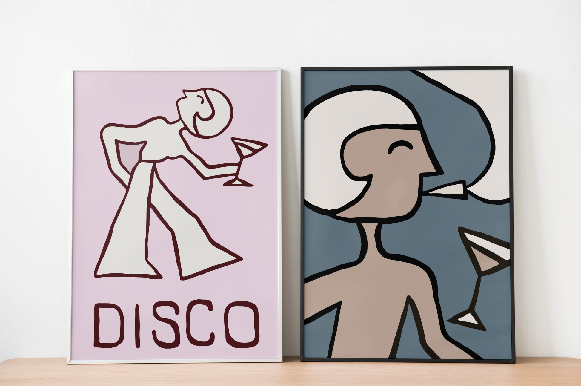Poster of the original painting Galej by Josefin Blomkvist. Against a blue background, a stylized figure is depicted smoking, along with a cocktail glass. Give your home a colorful and playful touch with this unique piece of art!