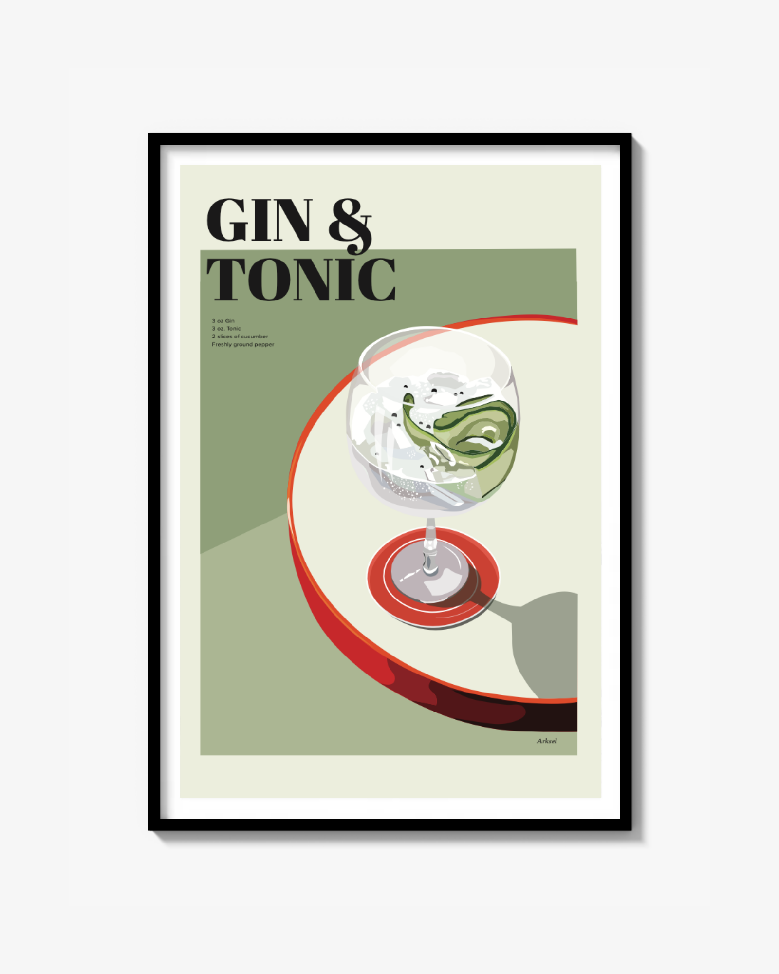 Make your walls more colorful, playful and personal with this green and red Gin & Tonic themed poster by the artist Arksel! Graphic art that brings joy to your home and also makes your home decor more unique.