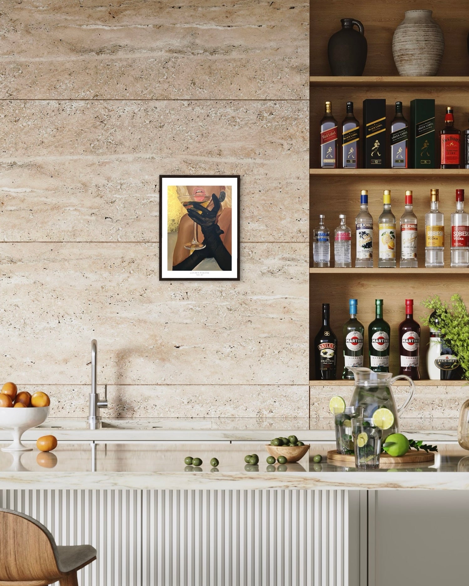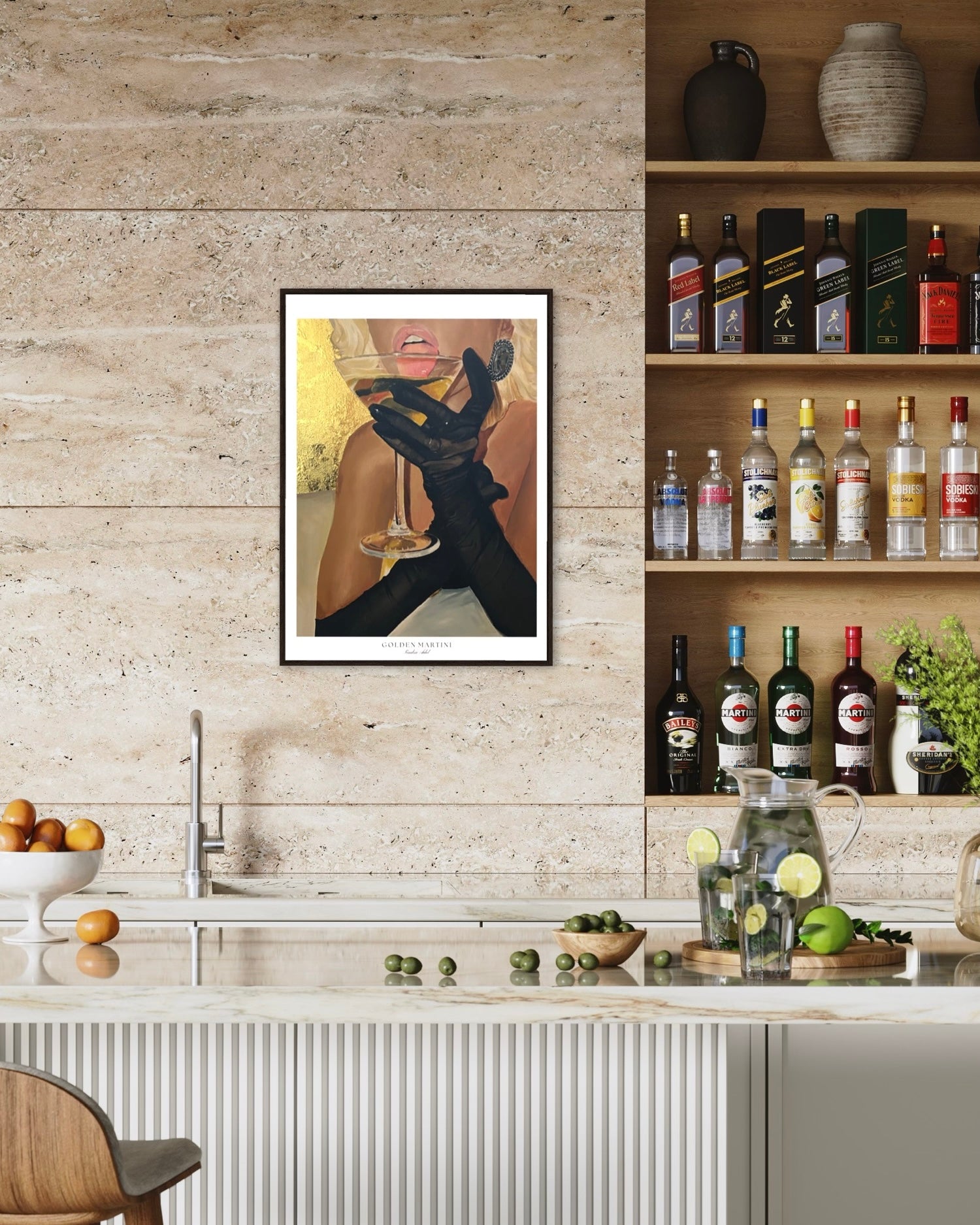 Golden Martini Poster. Originally painted by Tindra Ädel with acrylics and gold leaf. Reference picture photographed by Sasha Maslova. Museum-quality posters made on thick matte paper. Frame not included!